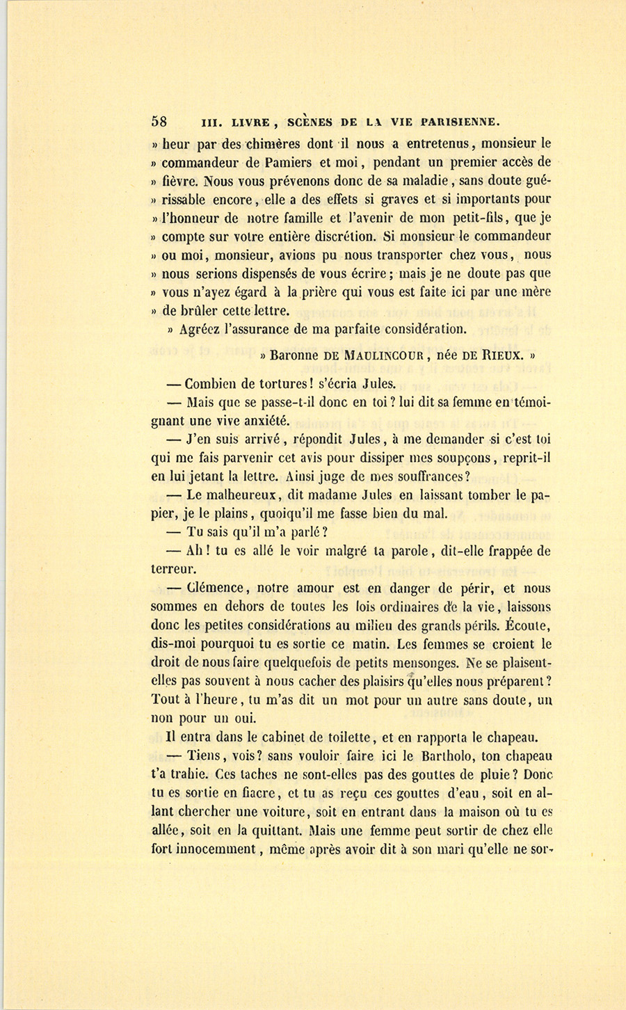 {p. 90} Quand la crise fut passée, madame Jules retrouva des forces. Le lendemain, elle redevint belle, tranquille ; elle causa, elle avait de l’espoir, elle se para comme se parent les malades. Puis elle voulut être seule pendant toute la journée, et renvoya son mari par une de ces prières faites avec tant d’instances, qu’elles sont exaucées comme on exauce les prières des enfants. D’ailleurs, monsieur Jules avait besoin de cette journée. Il alla chez monsieur de Maulincour, afin de réclamer de lui le duel à mort convenu naguère entre eux. Il ne parvint pas sans de grandes difficultés jusqu’à l’auteur de cette infortune ; mais, en apprenant qu’il s’agissait d’une affaire d’honneur, le vidame obéit aux préjugés qui avaient toujours gouverné sa vie, et introduisit Jules auprès du baron. Monsieur Desmarets chercha le baron de Maulincour.