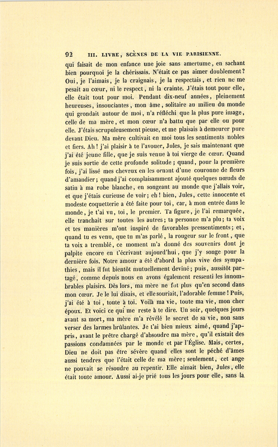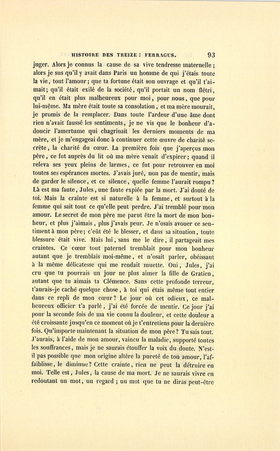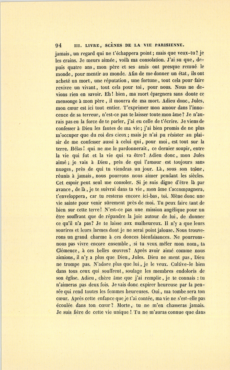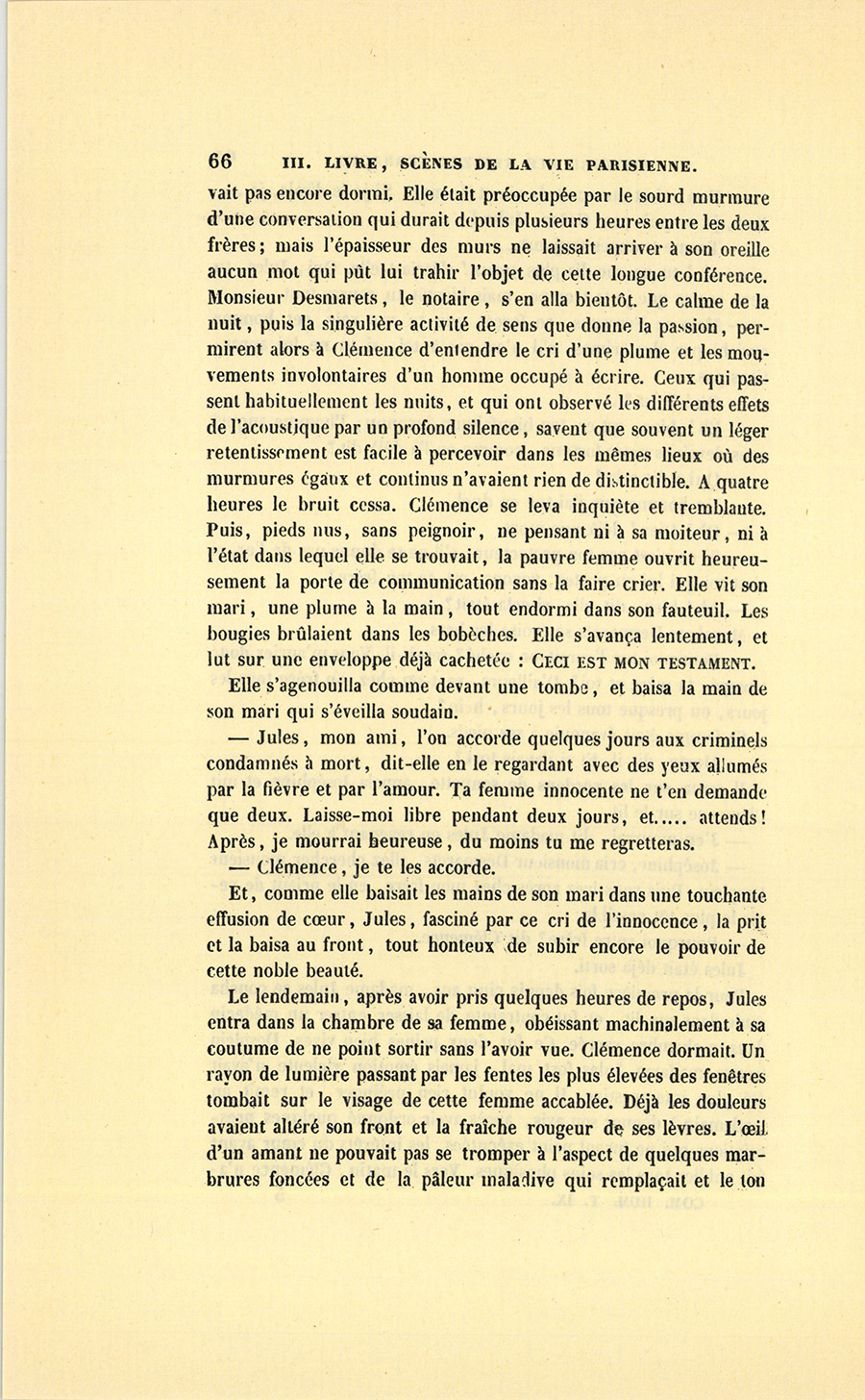 Mon bien aimé, ceci est mon testament. Pourquoi ne ferait-on pas des testaments pour les trésors du cœur, comme pour les autres biens ? Mon amour, n’était-ce pas tout mon bien ? je veux ici ne m’occuper que de mon amour : il fut toute la fortune de ta Clémence, et tout ce qu’elle peut te laisser en mourant. Jules, je suis encore aimée, je meurs heureuse. Les médecins expliquent ma mort à leur manière, moi seule en connais la véritable cause. Je te la dirai, quelque peine qu’elle puisse te faire. Je ne voudrais pas emporter dans un cœur tout à toi quelque secret qui ne te fût pas dit, alors que je meurs victime d’une discrétion nécessaire.