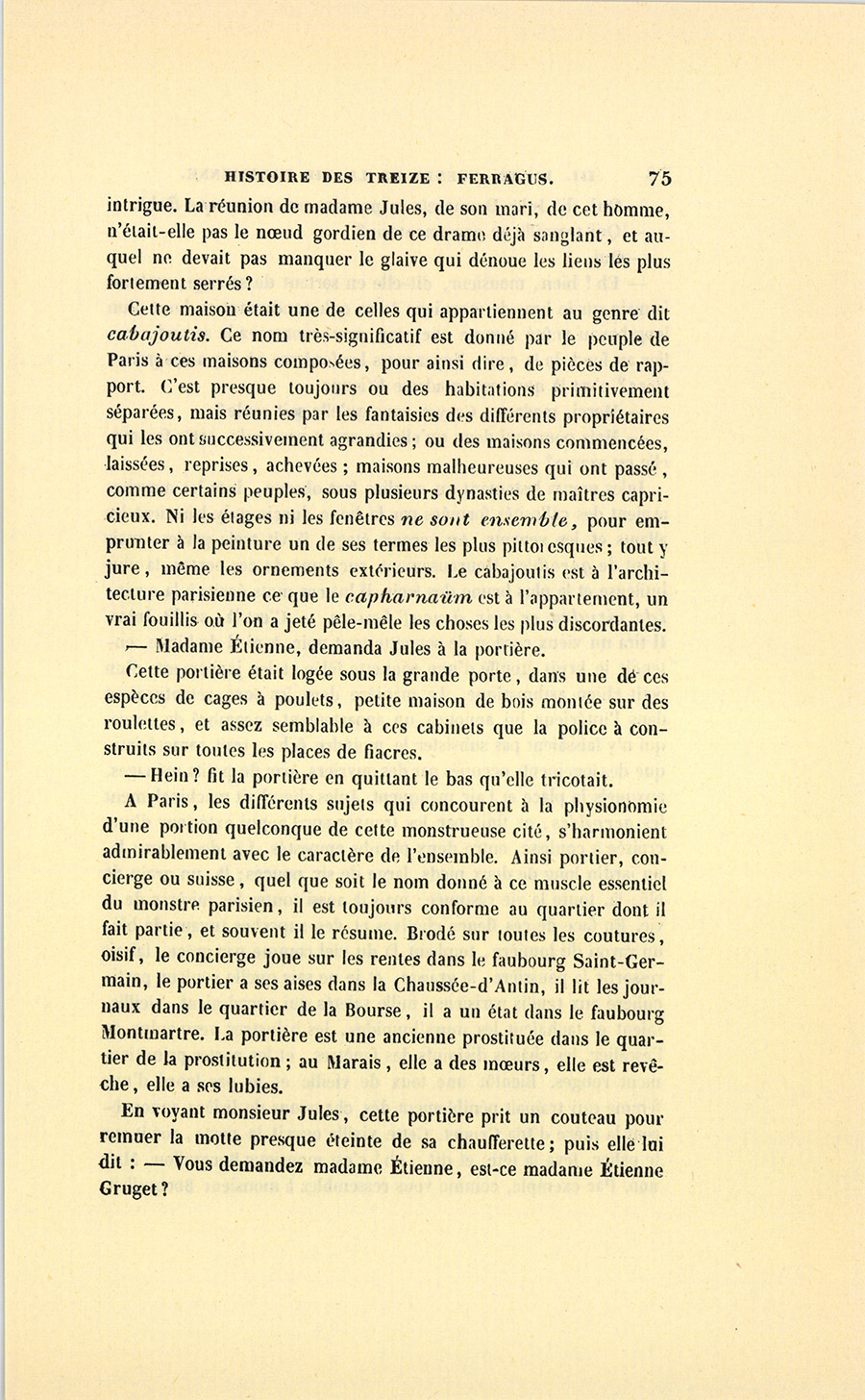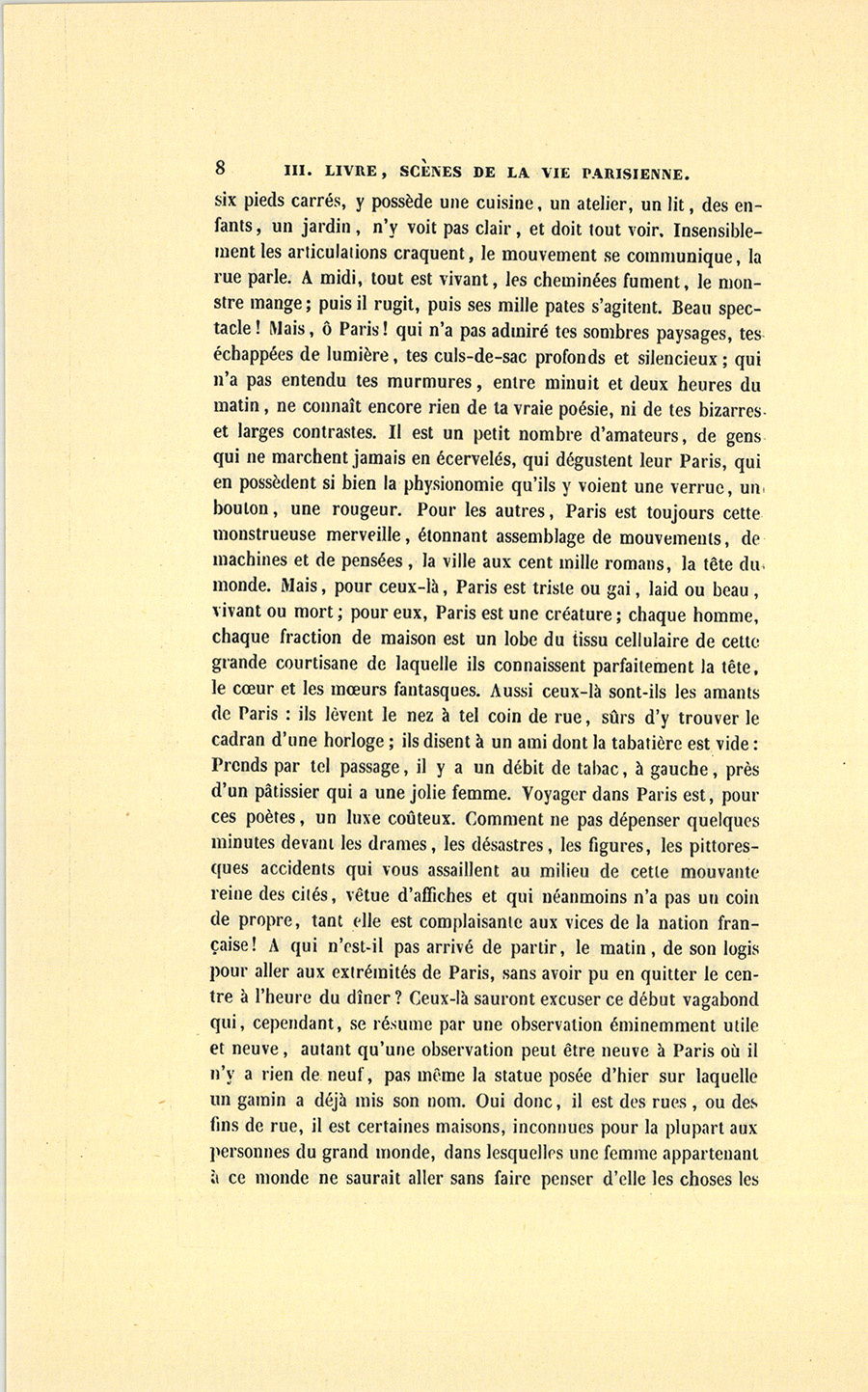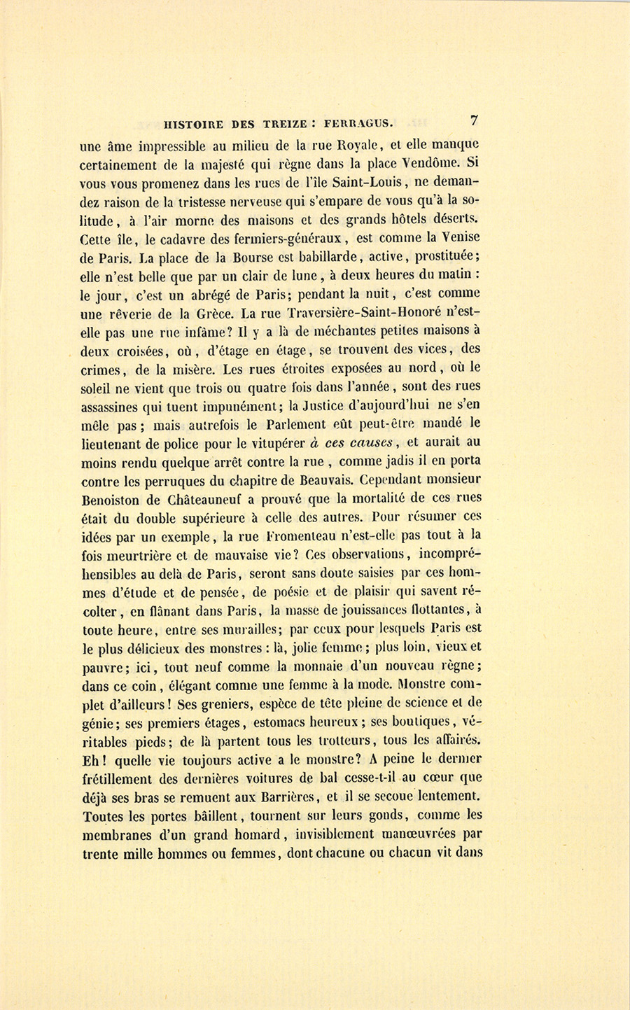 Il est dans Paris certaines rues déshonorées autant que peut l’être un homme coupable d’infamie ; puis il existe des rues nobles, puis des rues simplement honnêtes, puis de jeunes rues sur la moralité desquelles le public ne s’est pas encore formé d’opinion ; puis des rues assassines, des rues plus vieilles que de vieilles douairières ne sont vieilles, des rues estimables, des rues toujours propres, des rues toujours sales, des rues ouvrières, travailleuses, mercantiles. Enfin, les rues de Paris ont des qualités humaines, et nous impriment par leur physionomie certaines idées contre lesquelles nous sommes sans défense. Il y a des rues de mauvaise compagnie où vous ne voudriez pas demeurer, et des rues où vous placeriez volontiers votre séjour. Quelques rues, ainsi que la rue Montmartre, ont une belle tête et finissent en queue de poisson. La rue de la Paix est une large rue, une grande rue ; mais elle ne réveille aucune des pensées gracieusement nobles qui surprennent {p. 7} une âme impressible au milieu de la rue Royale, et elle manque certainement de la majesté qui règne dans la place Vendôme. Si vous vous promenez dans les rues de l’île Saint-Louis, ne demandez raison de la tristesse nerveuse qui s’empare de vous qu’à la solitude, à l’air morne des maisons et des grands hôtels déserts. Cette île, le cadavre des fermiers-généraux, est comme la Venise de Paris. La place de la Bourse est babillarde, active, prostituée ; elle n’est belle que par un clair de lune, à deux heures du matin : le jour, c’est un abrégé de Paris ; pendant la nuit, c’est comme une rêverie de la Grèce. La rue Traversière-Saint-Honoré n’est-elle pas une rue infâme ? Il y a là de méchantes petites maisons à deux croisées, où, d’étage en étage, se trouvent des vices, des crimes, de la misère. Les rues étroites exposées au nord, où le soleil ne vient que trois ou quatre fois dans l’année, sont des rues assassines qui tuent impunément ; la Justice d’aujourd’hui ne s’en mêle pas ; mais autrefois le Parlement eût peut-être mandé le lieutenant de police pour le vitupérer à ces causes, et aurait au moins rendu quelque arrêt contre la rue, comme jadis il en porta contre les perruques du chapitre de Beauvais. Cependant monsieur Benoiston de Châteauneuf a prouvé que la mortalité de ces rues était du double supérieure à celle des autres. Pour résumer ces idées par un exemple, la rue Fromenteau n’est-elle pas tout à la fois meurtrière et de mauvaise vie ? Ces observations, incompréhensibles au delà de Paris, seront sans doute saisies par ces hommes d’étude et de pensée, de poésie et de plaisir qui savent récolter, en flânant dans Paris, la masse de jouissances flottantes, à toute heure, entre ses murailles ; par ceux pour lesquels Paris est le plus délicieux des monstres : là, jolie femme ; plus loin, vieux et pauvre ; ici, tout neuf comme la monnaie d’un nouveau règne ; dans ce coin, élégant comme une femme à la mode. Monstre complet d’ailleurs ! Ses greniers, espèce de tête pleine de science et de génie ; ses premiers étages, estomacs heureux ; ses boutiques, véritables pieds ; de là partent tous les trotteurs, tous les affairés. Eh ! quelle vie toujours active a le monstre ? À peine le dernier frétillement des dernières voitures de bal cesse-t-il au cœur que déjà ses bras se remuent aux Barrières, et il se secoue lentement. Toutes les portes bâillent, tournent sur leurs gonds, comme les membranes d’un grand homard, invisiblement manœuvrées par trente mille hommes ou femmes, dont chacune ou chacun vit dans {p. 8} six pieds carrés, y possède une cuisine, un atelier, un lit, des enfants, un jardin, n’y voit pas clair, et doit tout voir. Insensiblement les articulations craquent, le mouvement se communique, la rue parle. À midi, tout est vivant, les cheminées fument, le monstre mange ; puis il rugit, puis ses mille pates s’agitent. Beau spectacle ! Mais, ô Paris ! qui n’a pas admiré tes sombres paysages, tes échappées de lumière, tes culs-de-sac profonds et silencieux ; qui n’a pas entendu tes murmures, entre minuit et deux heures du matin, ne connaît encore rien de ta vraie poésie, ni de tes bizarres et larges contrastes. Il est un petit nombre d’amateurs, de gens qui ne marchent jamais en écervelés, qui dégustent leur Paris, qui en possèdent si bien la physionomie qu’ils y voient une verrue, un bouton, une rougeur. Pour les autres, Paris est toujours cette monstrueuse merveille, étonnant assemblage de mouvements, de machines et de pensées, la ville aux cent mille romans, la tête du monde. Mais, pour ceux-là, Paris est triste ou gai, laid ou beau, vivant ou mort ; pour eux, Paris est une créature ; chaque homme, chaque fraction de maison est un lobe du tissu cellulaire de cette grande courtisane de laquelle ils connaissent parfaitement la tête, le cœur et les mœurs fantasques. Aussi ceux-là sont-ils les amants de Paris : ils lèvent le nez à tel coin de rue, sûrs d’y trouver le cadran d’une horloge ; ils disent à un ami dont la tabatière est vide : Prends par tel passage, il y a un débit de tabac, à gauche, près d’un pâtissier qui a une jolie femme. Voyager dans Paris est, pour ces poètes, un luxe coûteux. Comment ne pas dépenser quelques minutes devant les drames, les désastres, les figures, les pittoresques accidents qui vous assaillent au milieu de cette mouvante reine des cités, vêtue d’affiches et qui néanmoins n’a pas un coin de propre, tant elle est complaisante aux vices de la nation française ! À qui n’est-il pas arrivé de partir, le matin, de son logis pour aller aux extrémités de Paris, sans avoir pu en quitter le centre à l’heure du dîner ? Ceux-là sauront excuser ce début vagabond qui, cependant, se résume par une observation éminemment utile et neuve, autant qu’une observation peut être neuve à P