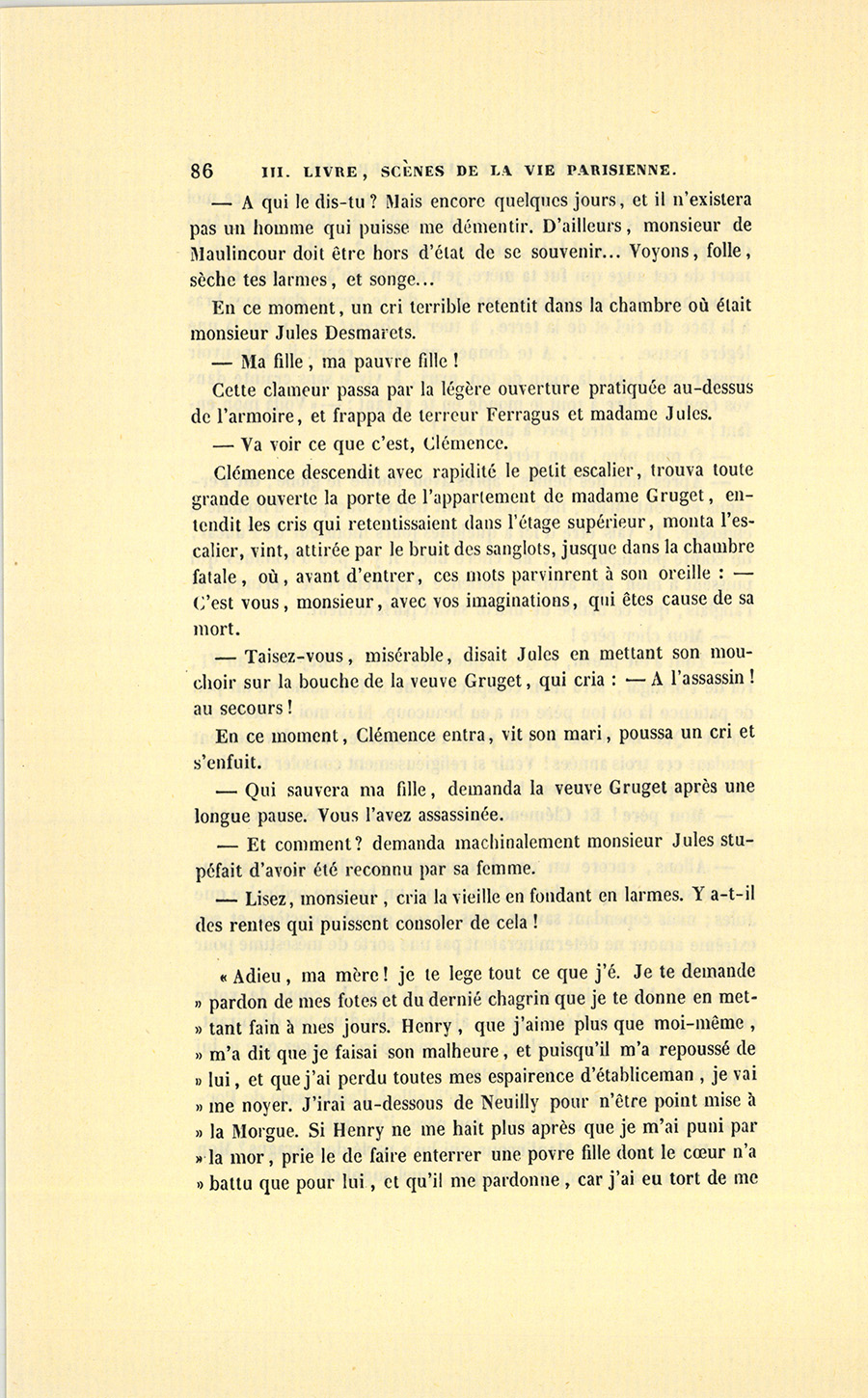 Adieu, ma mère ! je te lege tout ce que j’é. Je te demande pardon de mes fotes et du dernié chagrin que je te donne en mettant fain à mes jours. Henry, que j’aime plus que moi-même, m’a dit que je faisai son malheure, et puisqu’il m’a repoussé de lui, et que j’ai perdu toutes mes espairence d’établiceman, je vai me noyer. J’irai au-dessous de Neuilly pour n’être point mise à la Morgue. Si Henry ne me hait plus après que je m’ai puni par la mor, prie le de faire enterrer une povre fille dont le cœur n’a battu que pour lui, et qu’il me pardonne, car j’ai eu tort de me {p. 87} mélair de ce qui ne me regardai pas. Panse-lui bien ses moqca. Comme il a souffert ce povre cha. Mais j’orai pour me détruir le couraje qu’il a eu pour se faire brulai. Fais porter les corsets finis chez mes pratiques. Et prie Dieu pour votre fille.