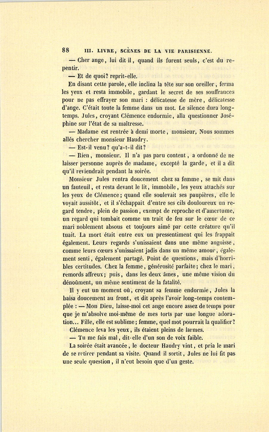 En disant cette parole, elle inclina la tête sur son oreiller, ferma les yeux et resta immobile, gardant le secret de ses souffrances pour ne pas effrayer son mari : délicatesse de mère, délicatesse d’ange. C’était toute la femme dans un mot. Le silence dura long-temps. Jules, croyant Clémence endormie, alla questionner Joséphine sur l’état de sa maîtresse.