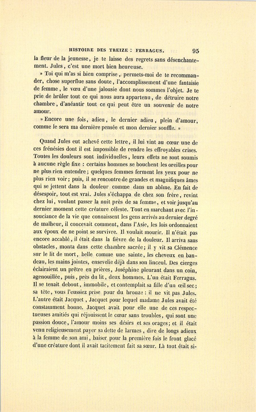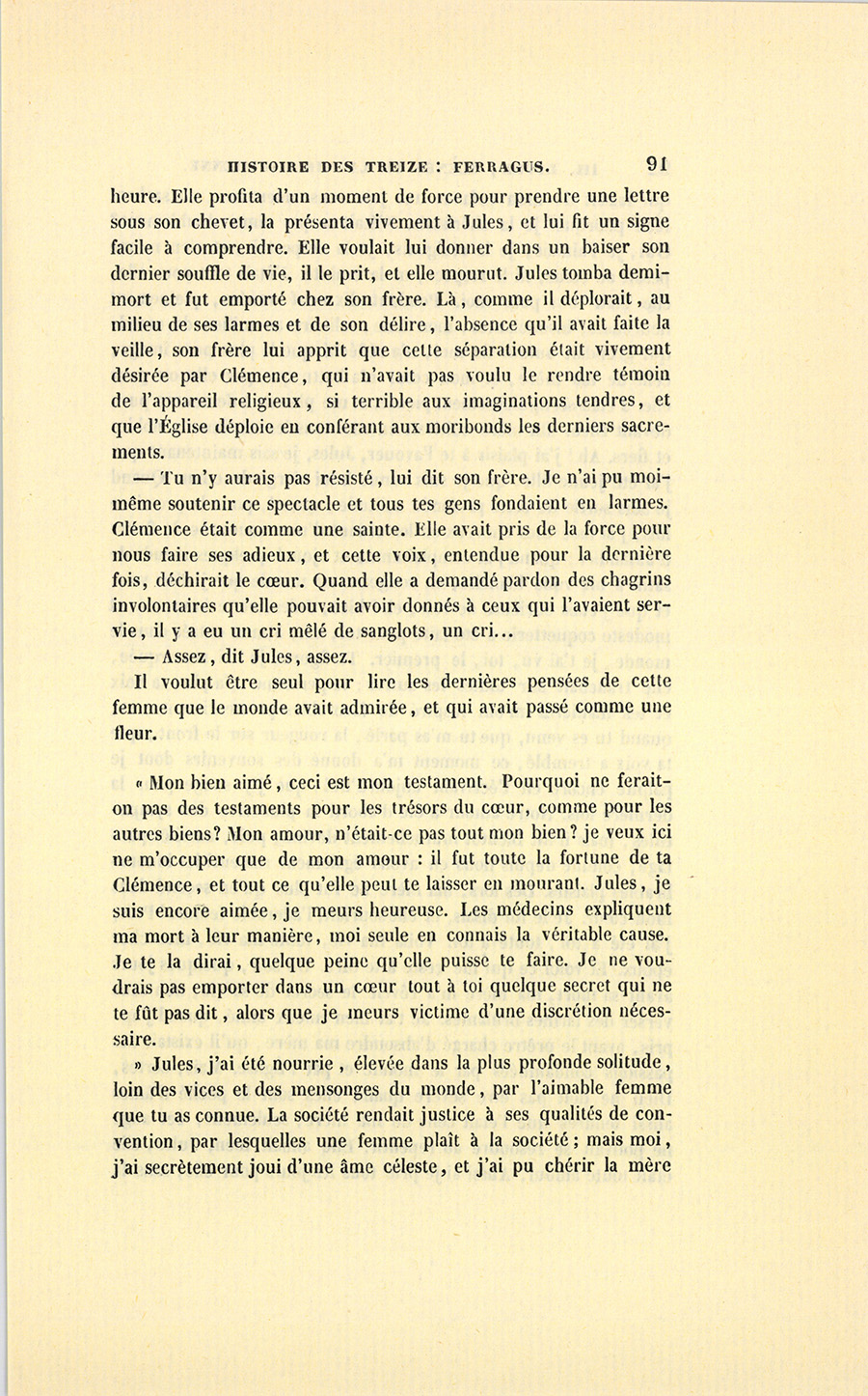 Le lendemain de cette visite, madame Jules empira d’heure en {p. 91} heure. Elle profita d’un moment de force pour prendre une lettre sous son chevet, la présenta vivement à Jules, et lui fit un signe facile à comprendre. Elle voulait lui donner dans un baiser son dernier souffle de vie, il le prit, et elle mourut. Jules tomba demi-mort et fut emporté chez son frère. Là, comme il déplorait, au milieu de ses larmes et de son délire, l’absence qu’il avait faite la veille, son frère lui apprit que cette séparation était vivement désirée par Clémence, qui n’avait pas voulu le rendre témoin de l’appareil religieux, si terrible aux imaginations tendres, et que l’Église déploie en conférant aux moribonds les derniers sacrements.