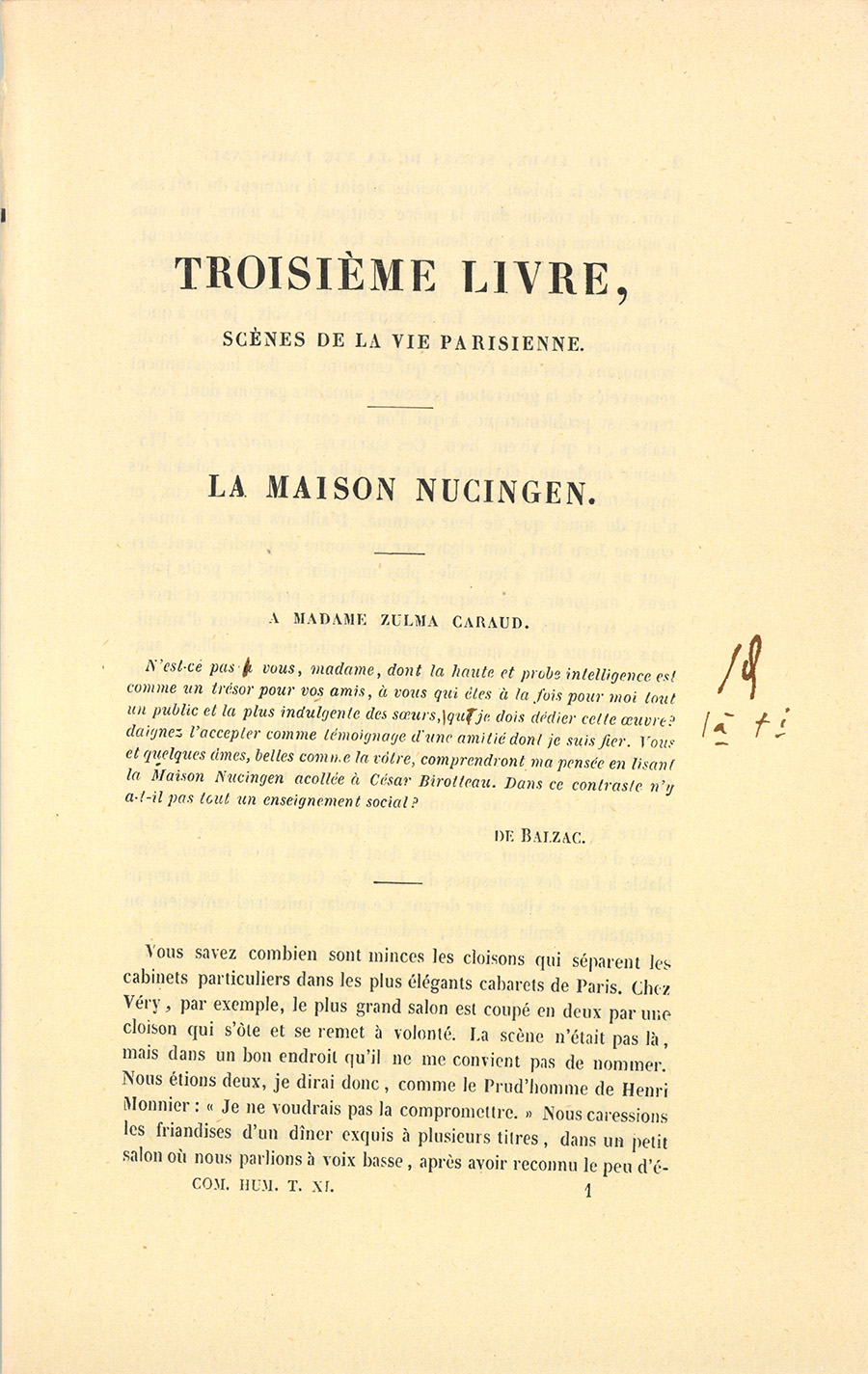 N’est-ce pas vous, madame, dont la haute et probe intelligence est comme un trésor pour vos amis, vous1 qui êtes à la fois pour moi tout un public et la plus indulgente des sœurs, à qui je dois dédier cette œuvre ? daignez l’accepter comme témoignage d’une amitié dont je suis fier. Vous et quelques âmes, belles comme la vôtre, comprendront ma pensée en lisant la Maison Nucingen acollée à César Birotteau. Dans ce contraste n’y a-t-il pas tout un enseignement social ?