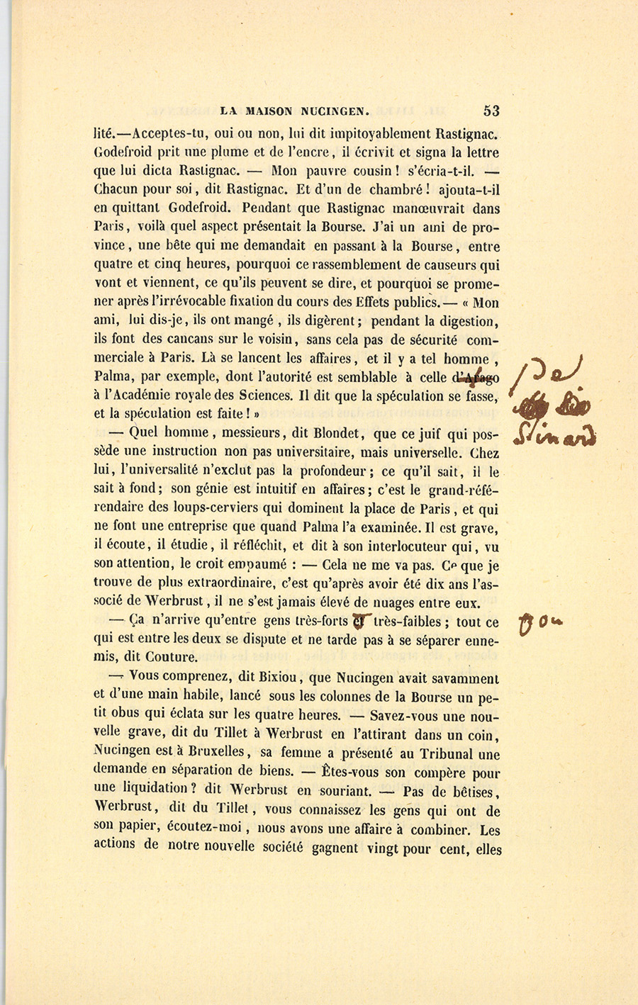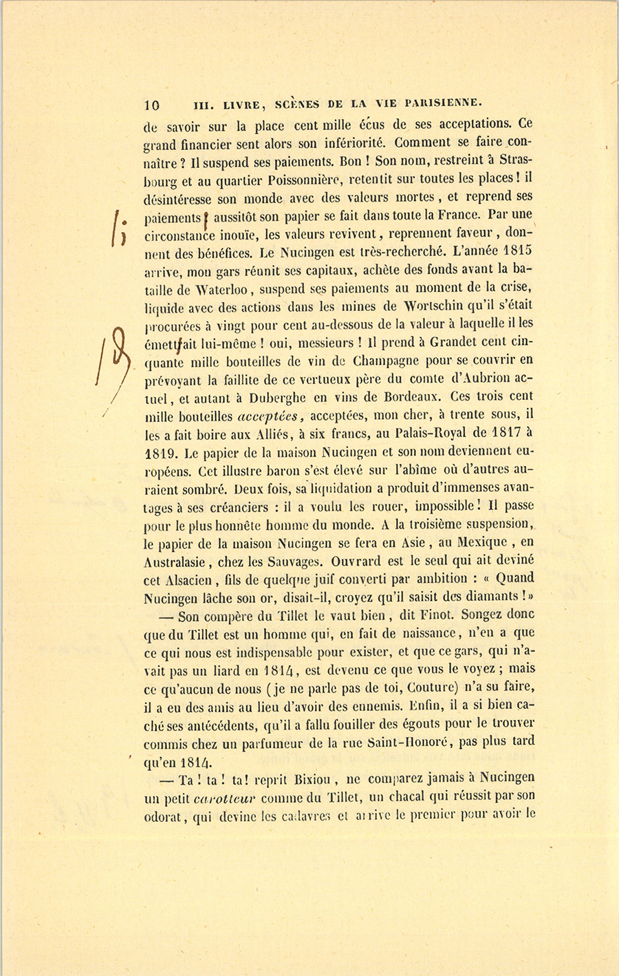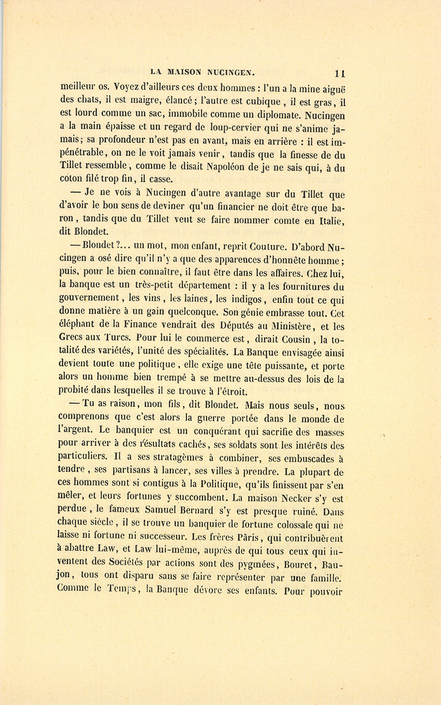 – Ta ! ta ! ta ! reprit Bixiou, ne comparez jamais à Nucingen un petit carotteur comme du Tillet, un chacal qui réussit par son odorat, qui devine les cadavres et arrive le premier pour avoir le {p. 11} meilleur os. Voyez d’ailleurs ces deux hommes : l’un a la mine aiguë des chats, il est maigre, élancé ; l’autre est cubique, il est gras, il est lourd comme un sac, immobile comme un diplomate. Nucingen a la main épaisse et un regard de loup-cervier qui ne s’anime jamais ; sa profondeur n’est pas en avant, mais en arrière : il est impénétrable, on ne le voit jamais venir, tandis que la finesse de du Tillet ressemble, comme le disait Napoléon de je ne sais qui, à du coton filé trop fin, il casse.