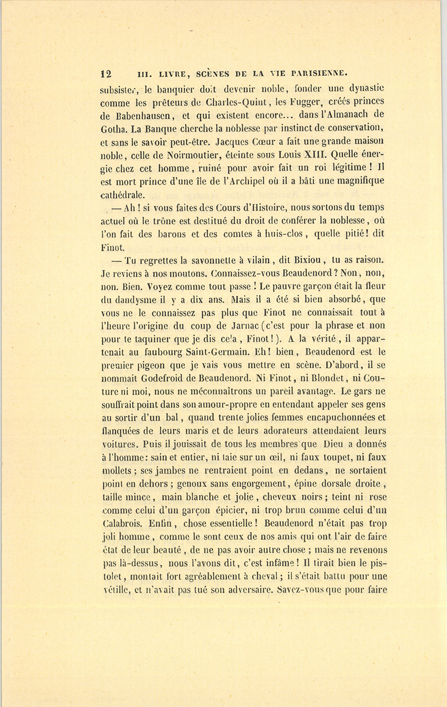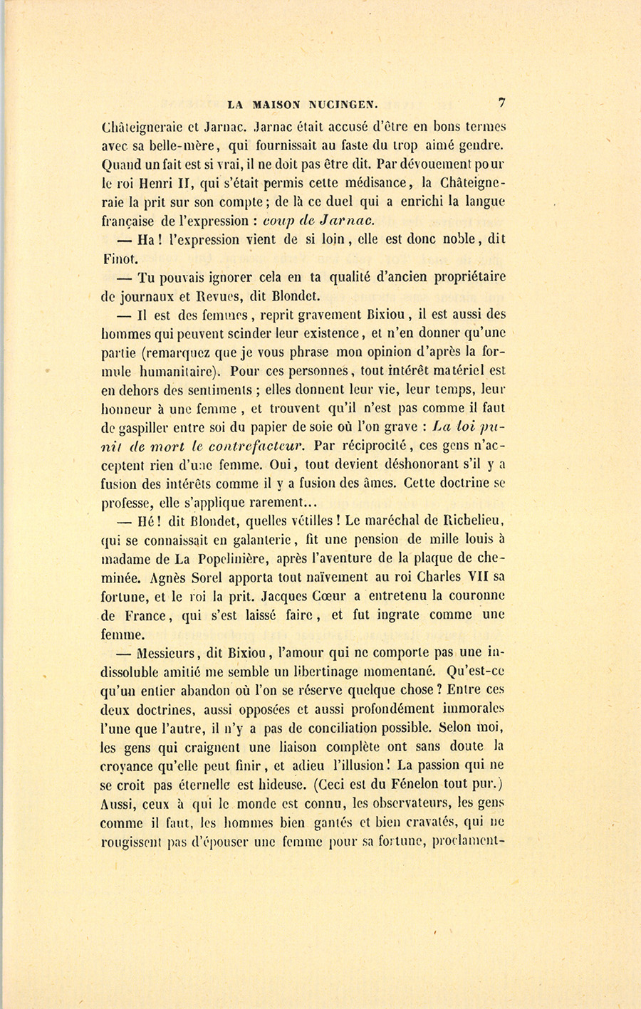 – Mais, s’écria Blondet, il a raison. La question est très-ancienne, elle fut le grand mot du fameux duel à mort entre la {p. 7} Châteigneraie et Jarnac. Jarnac était accusé d’être en bons termes avec sa belle-mère, qui fournissait au faste du trop aimé gendre. Quand un fait est si vrai, il ne doit pas être dit. Par dévouement pour le roi Henri II, qui s’était permis cette médisance, la Châteigneraie la prit sur son compte ; de là ce duel qui a enrichi la langue française de l’expression : coup de Jarnac.