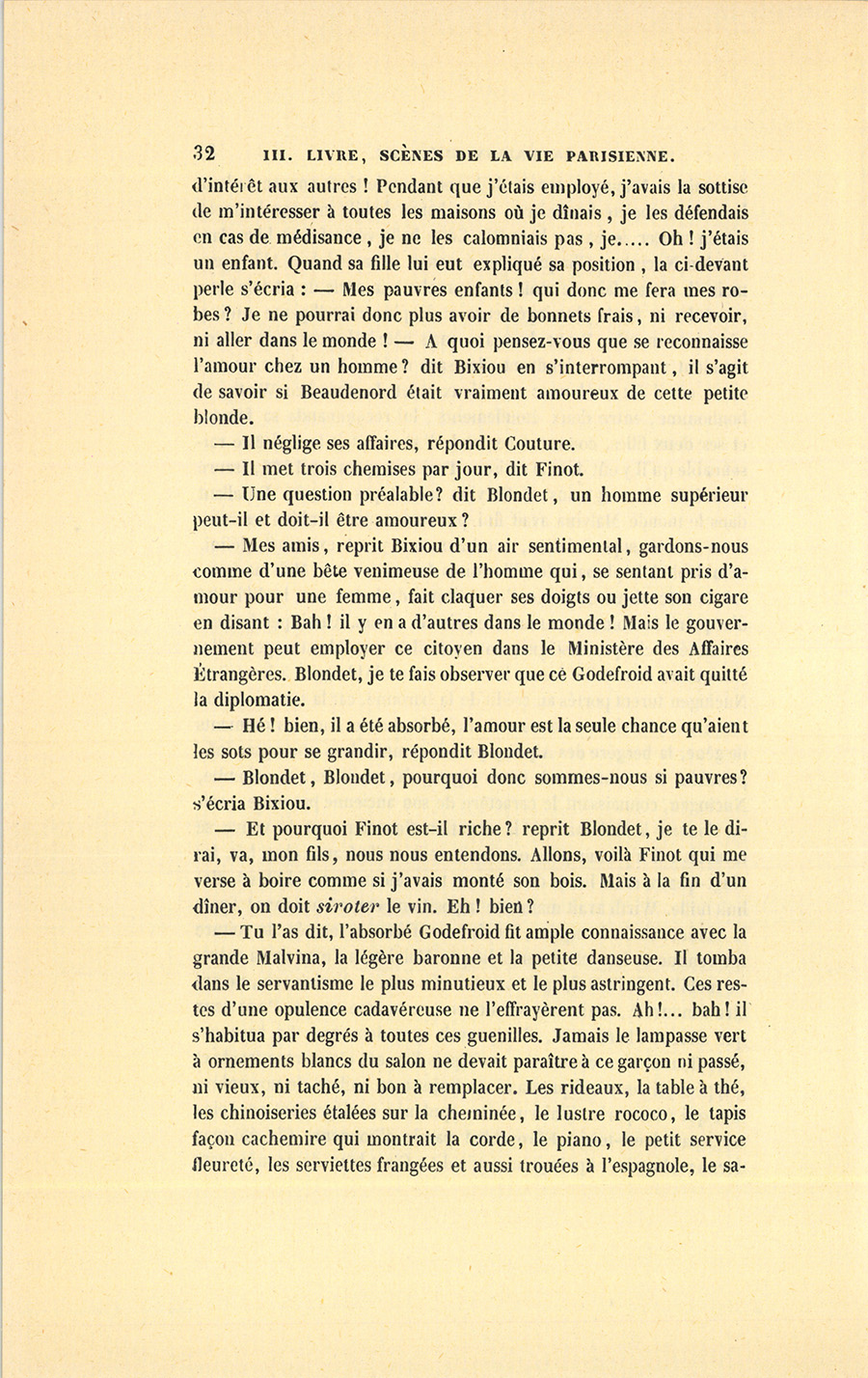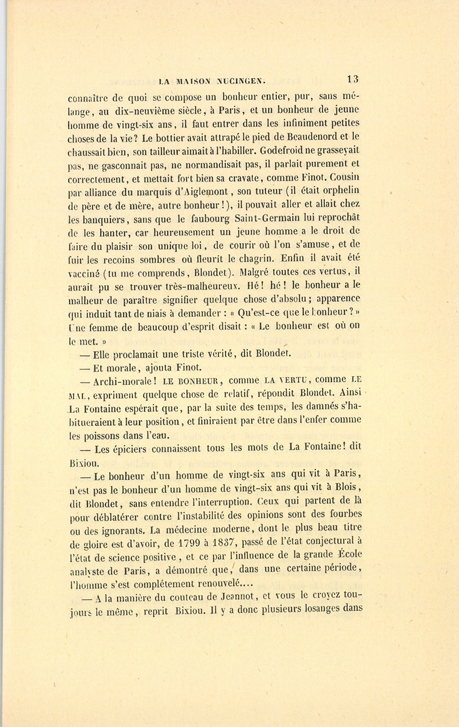 – Le bonheur d’un homme de vingt-six ans qui vit à Paris, n’est pas le bonheur d’un homme de vingt-six ans qui vit à Blois, dit Blondet, sans entendre l’interruption. Ceux qui partent de là pour déblatérer contre l’instabilité des opinions sont des fourbes ou des ignorants. La médecine moderne, dont le plus beau titre de gloire est d’avoir, de 1799 à 1837, passé de l’état conjectural à l’état de science positive, et ce par l’influence de la grande École analyste de Paris, a démontré que, dans une certaine période, l’homme s’est complètement renouvelé…