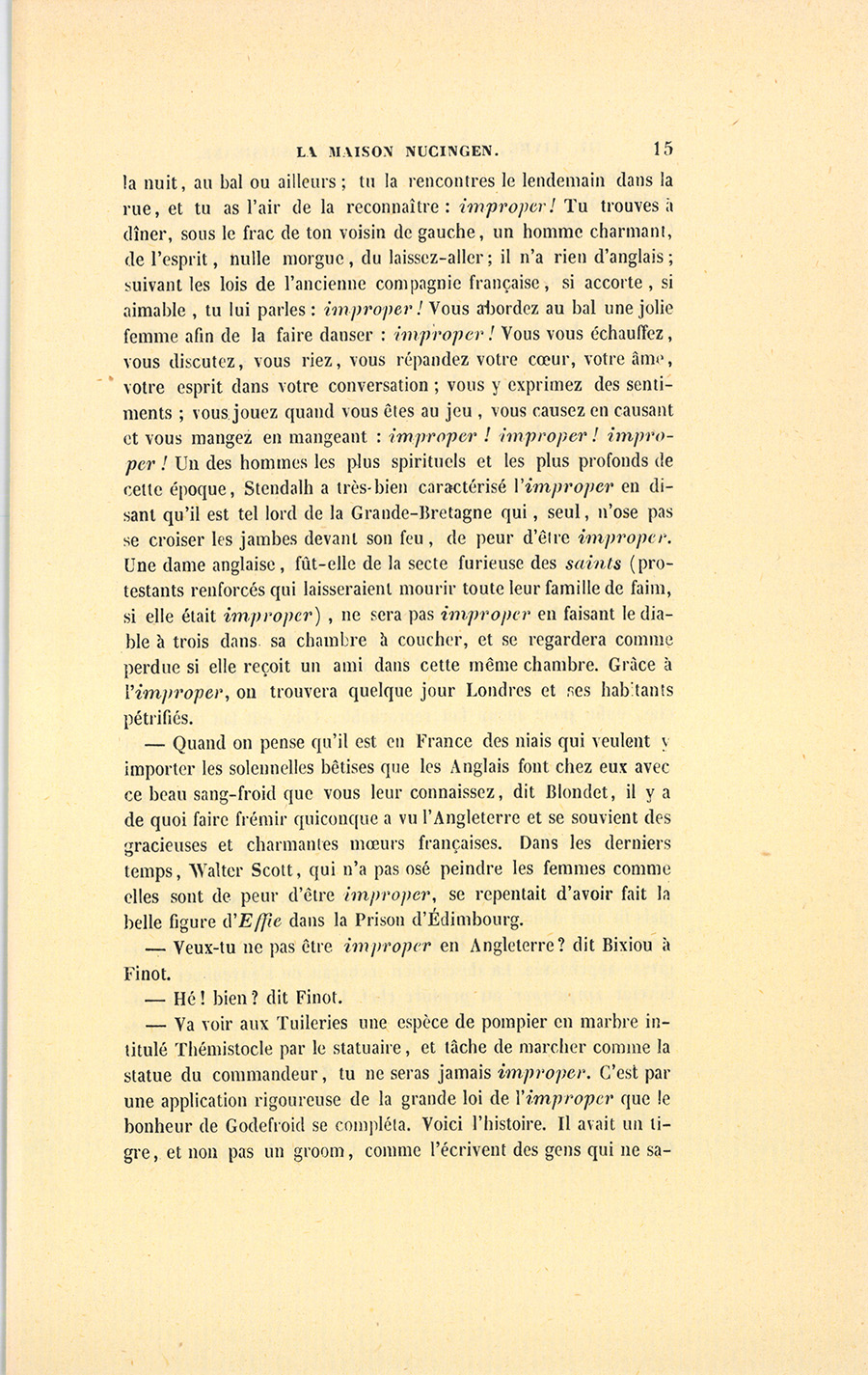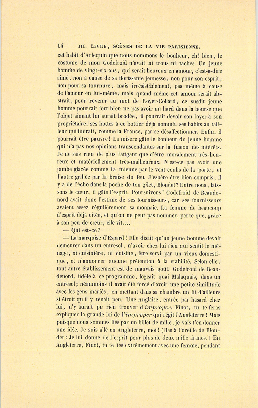 – La marquise d’Espard ! Elle disait qu’un jeune homme devait demeurer dans un entresol, n’avoir chez lui rien qui sentît le ménage, ni cuisinière, ni cuisine, être servi par un vieux domestique, et n’annoncer aucune prétention à la stabilité. Selon elle, tout autre établissement est de mauvais goût. Godefroid de Beaudenord, fidèle à ce programme, logeait quai Malaquais, dans un entresol ; néanmoins il avait été forcé d’avoir une petite similitude avec les gens mariés, en mettant dans sa chambre un lit d’ailleurs si étroit qu’il y tenait peu. Une Anglaise, entrée par hasard chez lui, n’y aurait pu rien trouver d’improper. Finot, tu te feras expliquer la grande loi de l’improper qui régit l’Angleterre ! Mais puisque nous sommes liés par un billet de mille, je vais t’en donner une idée. Je suis allé en Angleterre, moi ! (Bas à l’oreille de Blondet : Je lui donne de l’esprit pour plus de deux mille francs.) En Angleterre, Finot, tu te lies extrêmement avec une femme, pendant {p. 15} la nuit, au bal ou ailleurs ; tu la rencontres le lendemain dans la rue, et tu as l’air de la reconnaître : improper ! Tu trouves à dîner, sous le frac de ton voisin de gauche, un homme charmant, de l’esprit, nulle morgue, du laissez-aller ; il n’a rien d’anglais ; suivant les lois de l’ancienne compagnie française, si accorte, si aimable, tu lui parles : improper ! Vous abordez au bal une jolie femme afin de la faire danser : improper ! Vous vous échauffez, vous discutez, vous riez, vous répandez votre cœur, votre âme, votre esprit dans votre conversation ; vous y exprimez des sentiments ; vous jouez quand vous êtes au jeu, vous causez en causant et vous mangez en mangeant : improper ! improper ! improper ! Un des hommes les plus spirituels et les plus profonds de cette époque, Stendalh, a très-bien caractérisé l’improper en disant qu’il est tel lord de la Grande-Bretagne qui, seul, n’ose pas se croiser les jambes devant son feu, de peur d’être improper. Une dame anglaise, fût-elle de la secte furieuse des saints (protestants renforcés qui laisseraient mourir toute leur famille de faim, si elle était improper), ne sera pas improper en faisant le diable à trois dans sa chambre à coucher, et se regardera comme perdue si elle reçoit un ami dans cette même chambre. Grâce à l’improper, on trouvera quelque jour Londres et ses habitants pétrifiés.