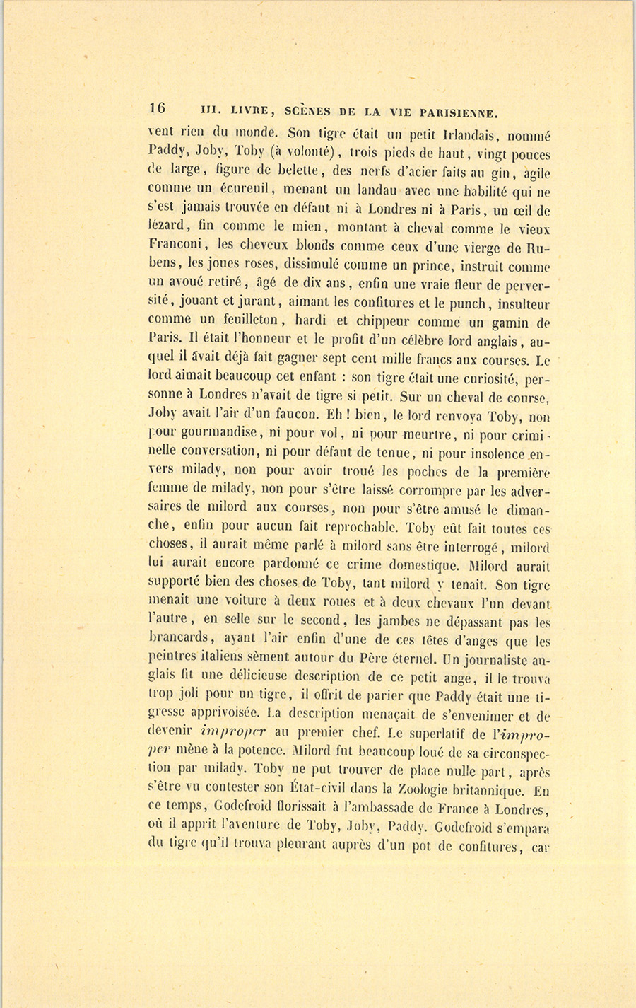 – Va voir aux Tuileries une espèce de pompier en marbre intitulé Thémistocle par le statuaire, et tâche de marcher comme la statue du commandeur, tu ne seras jamais improper. C’est par une application rigoureuse de la grande loi de l’improper que le bonheur de Godefroid se compléta. Voici l’histoire. Il avait un tigre, et non pas un groom, comme l’écrivent des gens qui ne {p. 16} savent rien du monde. Son tigre était un petit Irlandais, nommé Paddy, Joby, Toby (à volonté), trois pieds de haut, vingt pouces de large, figure de belette, des nerfs d’acier faits au gin, agile comme un écureuil, menant un landau avec une habilité qui ne s’est jamais trouvée en défaut ni à Londres ni à Paris, un œil de lézard, fin comme le mien, montant à cheval comme le vieux Franconi, les cheveux blonds comme ceux d’une vierge de Rubens, les joues roses, dissimulé comme un prince, instruit comme un avoué retiré, âgé de dix ans, enfin une vraie fleur de perversité, jouant et jurant, aimant les confitures et le punch, insulteur comme un feuilleton, hardi et chippeur comme un gamin de Paris. Il était l’honneur et le profit d’un célèbre lord anglais, auquel il avait déjà fait gagner sept cent mille francs aux courses. Le lord aimait beaucoup cet enfant : son tigre était une curiosité, personne à Londres n’avait de tigre si petit. Sur un cheval de course, Joby avait l’air d’un faucon. Eh ! bien, le lord renvoya Toby, non pour gourmandise, ni pour vol, ni pour meurtre, ni pour criminelle conversation, ni pour défaut de tenue, ni pour insolence envers milady, non pour avoir troué les poches de la première femme de milady, non pour s’être laissé corrompre par les adversaires de milord aux courses, non pour s’être amusé le dimanche, enfin pour aucun fait reprochable. Toby eût fait toutes ces choses, il aurait même parlé à milord sans être interrogé, milord lui aurait encore pardonné ce crime domestique. Milord aurait supporté bien des choses de Toby, tant milord y tenait. Son tigre menait une voiture à deux roues et à deux chevaux l’un devant l’autre, en selle sur le second, les jambes ne dépassant pas les brancards, ayant l’air enfin d’une de ces têtes d’anges que les peintres italiens sèment autour du Père éternel. Un journaliste anglais fit une délicieuse description de ce petit ange, il le trouva trop joli pour un tigre, il offrit de parier que Paddy était une tigresse apprivoisée. La description menaçait de s’envenimer et de devenir improper au premier chef. Le superlatif de l’improper mène à la potence. Milord fut beaucoup loué de sa circonspection par milady. Toby ne put trouver de place nulle part, après s’être vu contester son État-civil dans la Zoologie britannique. En ce temps, Godefroid florissait à l’ambassade de France à Londres, où il apprit l’aventure de Toby, Joby, Paddy. Godefroid s’empara du tigre qu’il trouva pleurant auprès d’un pot de confitures, car {p. 17} l’enfant avait déjà perdu les guinées par lesquelles milord avait doré son malheur. À son retour, Godefroid de Beaudenord importa donc chez nous le plus charmant tigre de l’Angleterre, il fut connu par son tigre comme Couture s’est fait remarquer par ses gilets. Aussi entra-t-il facilement dans la confédération du club dit aujourd’hui de Grammont. Il n’inquiétait aucune ambition après avoir renoncé à la carrière diplomatique, il n’avait pas un esprit dangereux, il fut bien reçu de tout le monde. Nous autres, nous serions offensés dans notre amour-propre en ne rencontrant que des visages riants. Nous nous plaisons à voir la grimace amère de l’Envieux. Godefroid n’aimait pas être haï. À chacun son goût ! Arrivons au solide, à la vie matérielle ? Son appartement, où j’ai léché plus d’un déjeuner, se recommandait par un cabinet de toilette mystérieux, bien orné, plein de choses comfortables, à cheminée, à baignoire ; sortie sur un petit escalier, portes battantes assourdies, serrures faciles, gonds discrets, fenêtres à carreaux dépolis, à rideaux impassibles. Si la chambre offrait et devait offrir le plus beau désordre que puisse souhaiter le peintre d’aquarelle le plus exigeant, si tout y respirait l’allure bohémienne d’une vie de jeune homme élégant, le cabinet de toilette était comme un sanctuaire : blanc, propre, rangé, chaud, point de vent coulis, tapis fait pour y sauter pieds nus, en chemise et effrayée. Là est la signature du garçon vraiment petit-maître et sachant la vie ! car là, pendant quelques minutes, il peut paraître ou sot ou grand dans les petits détails de l’existence qui révèlent le caractère. La marquise déjà citée, non, c’est la marquise de Rochefide, est sortie furieuse d’un cabinet de toilette, et n’y est jamais revenue, elle n’y avait rien trouvé d’improper. Godefroid y avait une petite armoire pleine…