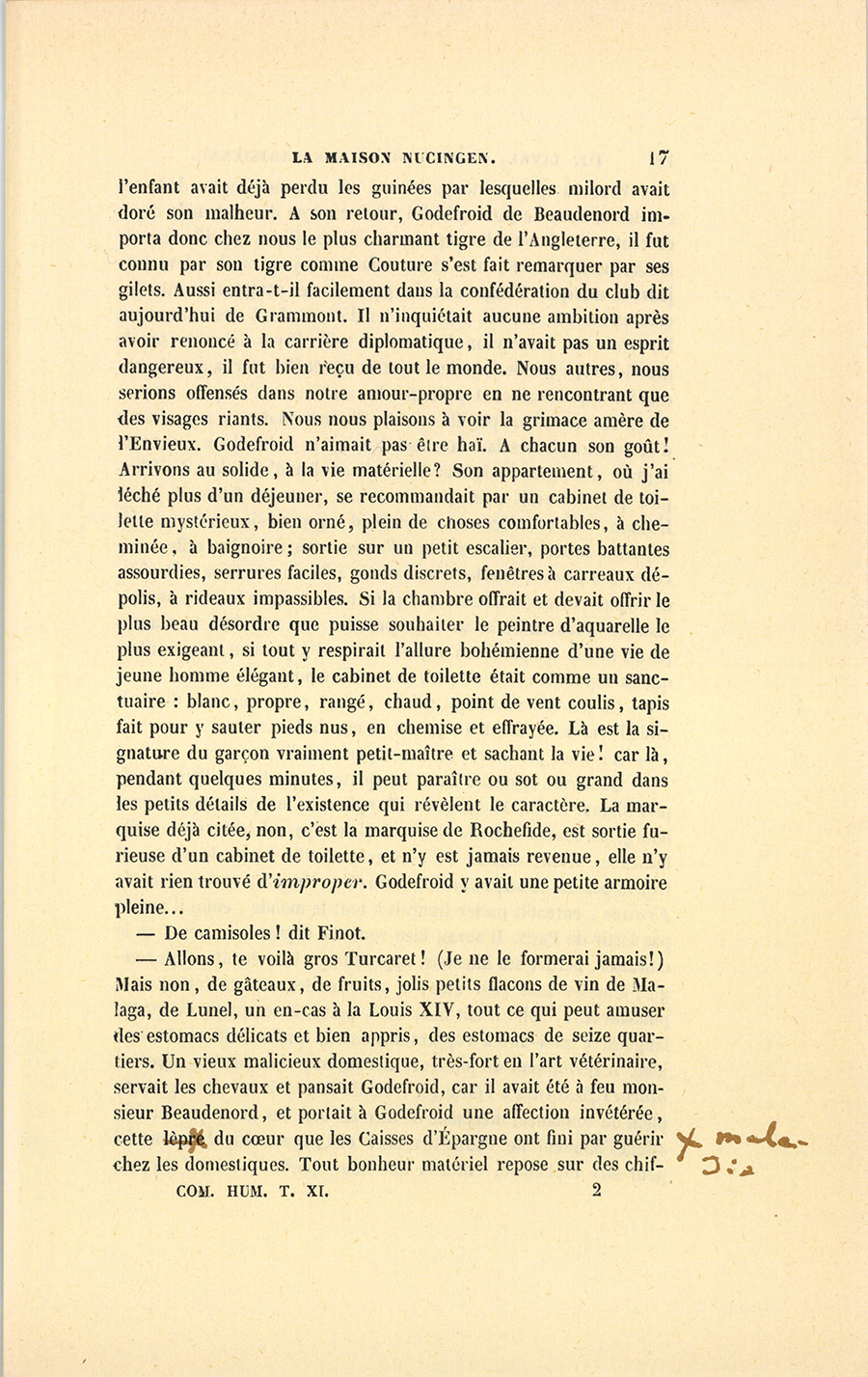 – Ah ! je ne marivaude donc plus, dit Bixiou jouissant de son succès et regardant ses auditeurs surpris. – Depuis deux mois, reprit-il après cette interruption, Godefroid se livrait à {p. 51} tous les petits bonheurs d’un homme qui se marie. On ressemble alors à ces oiseaux qui font leurs nids au printemps, vont et viennent, ramassent des brins de paille, les portent dans leur bec, et cotonnent le domicile de leurs œufs. Le futur d’Isaure avait loué rue de la Planche un petit hôtel de mille écus, commode, convenable, ni trop grand, ni trop petit. Il allait tous les matins voir les ouvriers travaillant, et y surveiller les peintures. Il y avait introduit le comfort, la seule bonne chose qu’il y ait en Angleterre : calorifère pour maintenir une température égale dans la maison ; mobilier bien choisi, ni trop brillant, ni trop élégant ; couleurs fraîches et douces à l’œil, stores intérieurs et extérieurs à toutes les croisées ; argenterie, voitures neuves. Il avait fait arranger l’écurie, la sellerie, les remises où Toby, Joby, Paddy se démenait et frétillait comme une marmotte déchaînée, en paraissant très-heureux de savoir qu’il y aurait des femmes au logis et une lady ! Cette passion de l’homme qui se met en ménage, qui choisit des pendules, qui vient chez sa future les poches pleines d’échantillons d’étoffes, la consulte sur l’ameublement de la chambre à coucher, qui va, vient, trotte, quand il va, vient et trotte animé par l’amour, est une des choses qui réjouissent le plus un cœur honnête et surtout les fournisseurs. Et comme rien ne plaît plus au monde que le mariage d’un joli jeune homme de vingt-sept ans avec une charmante personne de vingt ans qui danse bien, Godefroid, embarrassé pour la corbeille, invita Rastignac et madame de Nucingen à déjeuner, pour les consulter sur cette affaire majeure. Il eut l’excellente idée de prier son cousin d’Aiglemont et sa femme, ainsi que madame de Serisy. Les femmes du monde aiment assez à se dissiper une fois par hasard chez les garçons, à y déjeuner.