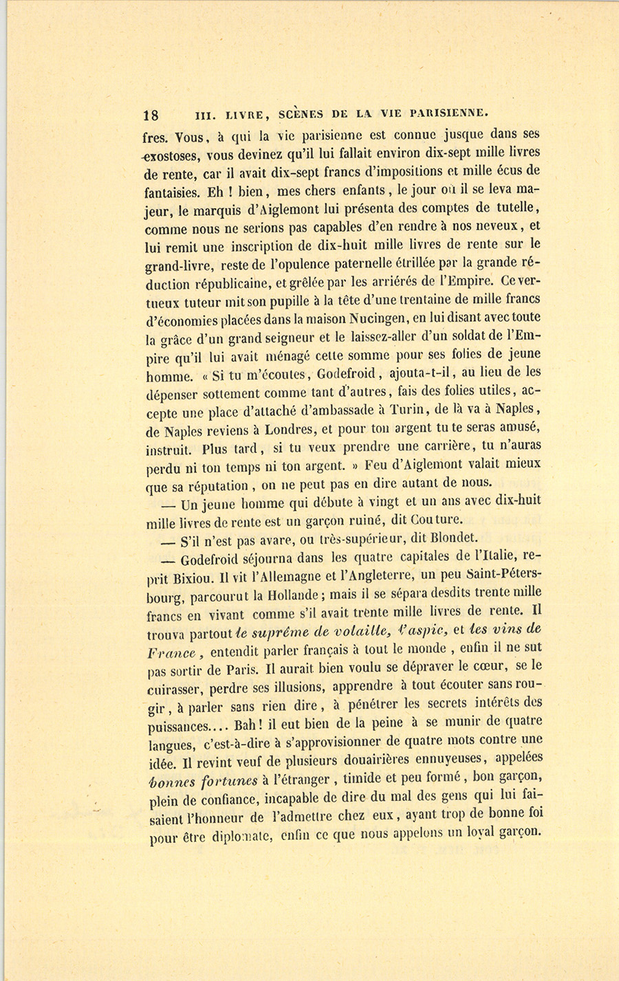 – Allons, te voilà gros Turcaret ! (Je ne le formerai jamais !) Mais non, de gâteaux, de fruits, jolis petits flacons de vin de Malaga, de Lunel, un en-cas à la Louis XIV, tout ce qui peut amuser des estomacs délicats et bien appris, des estomacs de seize quartiers. Un vieux malicieux domestique, très-fort en l’art vétérinaire, servait les chevaux et pansait Godefroid, car il avait été à feu monsieur Beaudenord, et portait à Godefroid une affection invétérée, cette maladie du cœur que les Caisses d’Épargne ont fini par guérir chez les domestiques. Tout bonheur matériel repose sur des {p. 18} chiffres. Vous, à qui la vie parisienne est connue jusque dans ses exostoses, vous devinez qu’il lui fallait environ dix-sept mille livres de rente, car il avait dix-sept francs d’impositions et mille écus de fantaisies. Eh ! bien, mes chers enfants, le jour où il se leva majeur, le marquis d’Aiglemont lui présenta des comptes de tutelle, comme nous ne serions pas capables d’en rendre à nos neveux, et lui remit une inscription de dix-huit mille livres de rente sur le grand-livre, reste de l’opulence paternelle étrillée par la grande réduction républicaine, et grêlée par les arriérés de l’Empire. Ce vertueux tuteur mit son pupille à la tête d’une trentaine de mille francs d’économies placées dans la maison Nucingen, en lui disant avec toute la grâce d’un grand seigneur et le laissez-aller d’un soldat de l’Empire qu’il lui avait ménagé cette somme pour ses folies de jeune homme. « Si tu m’écoutes, Godefroid, ajouta-t-il, au lieu de les dépenser sottement comme tant d’autres, fais des folies utiles, accepte une place d’attaché d’ambassade à Turin, de là va à Naples, de Naples reviens à Londres, et pour ton argent tu te seras amusé, instruit. Plus tard, si tu veux prendre une carrière, tu n’auras perdu ni ton temps ni ton argent. » Feu d’Aiglemont valait mieux que sa réputation, on ne peut pas en dire autant de nous.