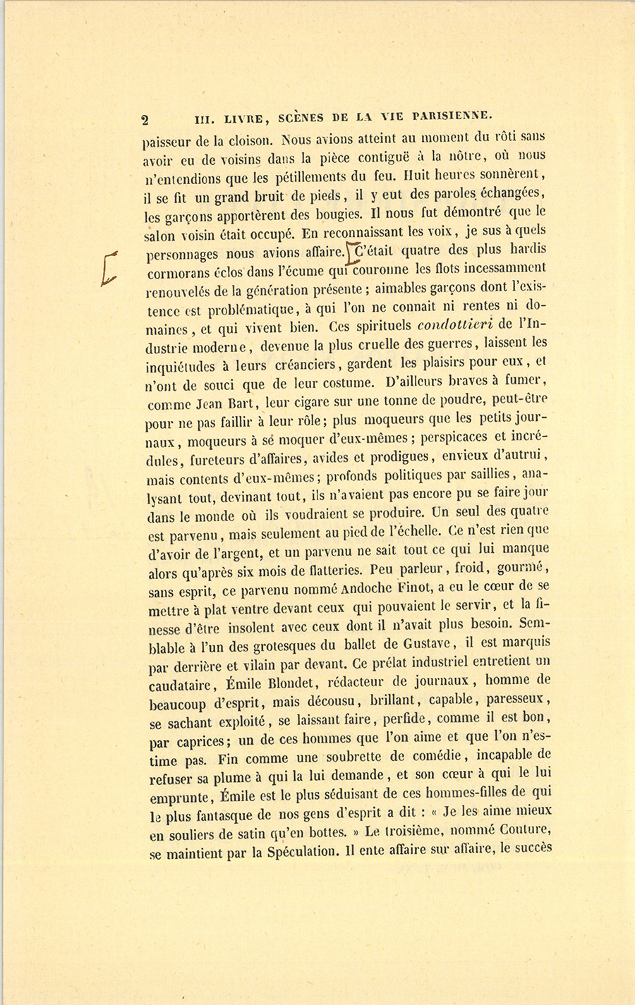 C’était quatre des plus hardis cormorans éclos dans l’écume qui couronne les flots incessamment renouvelés de la génération présente ; aimables garçons dont l’existence est problématique, à qui l’on ne connaît ni rentes ni domaines, et qui vivent bien. Ces spirituels condottieri de l’Industrie moderne, devenue la plus cruelle des guerres, laissent les inquiétudes à leurs créanciers, gardent les plaisirs pour eux, et n’ont de souci que de leur costume. D’ailleurs braves à fumer, comme Jean Bart, leur cigare sur une tonne de poudre, peut-être pour ne pas faillir à leur rôle ; plus moqueurs que les petits journaux, moqueurs à se moquer d’eux-mêmes ; perspicaces et incrédules, fureteurs d’affaires, avides et prodigues, envieux d’autrui, mais contents d’eux-mêmes ; profonds politiques par saillies, analysant tout, devinant tout, ils n’avaient pas encore pu se faire jour dans le monde où ils voudraient se produire. Un seul des quatre est parvenu, mais seulement au pied de l’échelle. Ce n’est rien que d’avoir de l’argent, et un parvenu ne sait tout ce qui lui manque alors qu’après six mois de flatteries. Peu parleur, froid, gourmé, sans esprit, ce parvenu nommé Andoche Finot, a eu le cœur de se mettre à plat ventre devant ceux qui pouvaient le servir, et la finesse d’être insolent avec ceux dont il n’avait plus besoin. Semblable à l’un des grotesques du ballet de Gustave, il est marquis par derrière et vilain par devant. Ce prélat industriel entretient un caudataire, Émile Blondet, rédacteur de journaux, homme de beaucoup d’esprit, mais décousu, brillant, capable, paresseux, se sachant exploité, se laissant faire, perfide, comme il est bon, par caprices ; un de ces hommes que l’on aime et que l’on n’estime pas. Fin comme une soubrette de comédie, incapable de refuser sa plume à qui la lui demande, et son cœur à qui le lui emprunte, Émile est le plus séduisant de ces hommes-filles de qui le plus fantasque de nos gens d’esprit a dit : « Je les aime mieux en souliers de satin qu’en bottes. » Le troisième, nommé Couture, se maintient par la Spéculation. Il ente affaire sur affaire, le succès {p. 3} de l’une couvre l’insuccès de l’autre. Aussi vit-il à fleur d’eau soutenu par la force nerveuse de son jeu, par une coupe roide et audacieuse. Il nage de ci, de là, cherchant dans l’immense mer des intérêts parisiens un îlot assez contestable pour pouvoir s’y loger. Évidemment, il n’est pas à sa place. Quant au dernier, le plus malicieux des quatre, son nom suffira : Bixiou ! Hélas ! ce n’est plus le Bixiou de 1825, mais celui de 1836, le misanthrope bouffon à qui l’on connaît le plus de verve et de mordant, un diable enragé d’avoir dépensé tant d’esprit en pure perte, furieux de ne pas avoir ramassé son épave dans la dernière révolution, donnant son coup de pied à chacun en vrai Pierrot des Funambules, sachant son époque et les aventures scandaleuses sur le bout de son doigt, les ornant de ses inventions drôlatiques, sautant sur toutes les épaules comme un clown, et tâchant d’y laisser une marque à la façon du bourreau.