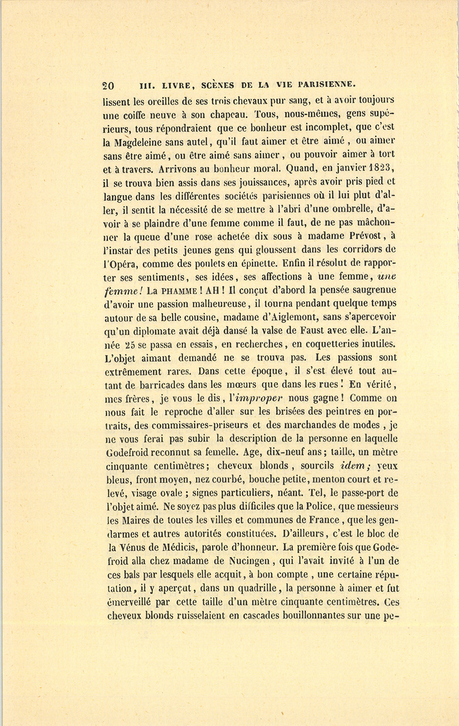 – Ce diable de Couture a tellement l’habitude d’anticiper les dividendes, qu’il anticipe le dénoûment de mon histoire. Où en étais-je ? Au retour de Beaudenord. Quand il fut installé quai Malaquais, il arriva que mille francs au-dessus de ses besoins furent insuffisants pour sa part de loge aux Italiens et à l’Opéra. Quand il perdait vingt-cinq ou trente louis au jeu dans un pari, naturellement il payait ; puis il les dépensait en cas de gain, ce qui nous arriverait si nous étions assez bêtes pour nous laisser prendre à parier. Beaudenord, gêné dans ses dix-huit mille livres de rente, sentit la nécessité de créer ce que nous appelons aujourd’hui le fond de roulement. Il tenait beaucoup à ne pas s’enfoncer lui-même. Il alla consulter son tuteur : « Mon cher enfant, lui dit d’Aiglemont, les rentes arrivent au pair, vends tes rentes, j’ai vendu les miennes et celles de ma femme. Nucingen a tous mes capitaux et m’en donne six pour cent ; fais comme moi, tu auras un pour cent de plus, et ce un pour cent te permettra d’être tout à fait à ton aise. » En trois jours, notre Godefroid fut à son aise. Ses revenus étant dans un équilibre parfait avec son superflu, son bonheur matériel fut complet. S’il était possible d’interroger tous les jeunes gens de Paris d’un seul regard, comme il paraît que la chose se fera lors du jugement dernier pour les milliards de générations qui auront pataugé sur tous les globes, en gardes nationaux ou en sauvages, et de leur demander si le bonheur d’un jeune homme de vingt-six ans ne consiste pas : à pouvoir sortir à cheval, en tilbury, ou en cabriolet avec un tigre gros comme le poing, frais et rose comme Toby, Joby, Paddy ; à avoir, le soir, pour douze francs, un coupé de louage très-convenable ; à se montrer élégamment tenu suivant les lois vestimentales qui régissent huit heures, midi, quatre heures et le soir ; à être bien reçu dans toutes les ambassades, et y recueillir les fleurs éphémères d’amitiés cosmopolites et superficielles ; à être d’une beauté supportable, et à bien porter son nom, son habit et sa tête ; à loger dans un charmant petit entresol arrangé comme je vous ai dit que l’était l’entresol du quai Malaquais ; à pouvoir inviter des amis à vous accompagner au Rocher de Cancale sans avoir interrogé préalablement son gousset, et n’être arrêté dans aucun de ses mouvements raisonnables par ce mot : Ah ! et de l’argent ? à pouvoir renouveler les bouffettes roses qui {p. 20} embellissent les oreilles de ses trois chevaux pur sang, et à avoir toujours une coiffe neuve à son chapeau. Tous, nous-mêmes, gens supérieurs, tous répondraient que ce bonheur est incomplet, que c’est la Magdeleine sans autel, qu’il faut aimer et être aimé, ou aimer sans être aimé, ou être aimé sans aimer, ou pouvoir aimer à tort et à travers. Arrivons au bonheur moral. Quand, en janvier 1823, il se trouva bien assis dans ses jouissances, après avoir pris pied et langue dans les différentes sociétés parisiennes où il lui plut d’aller, il sentit la nécessité de se mettre à l’abri d’une ombrelle, d’avoir à se plaindre d’une femme comme il faut, de ne pas mâchonner la queue d’une rose achetée dix sous à madame Prévost, à l’instar des petits jeunes gens qui gloussent dans les corridors de l’Opéra, comme des poulets en épinette. Enfin il résolut de rapporter ses sentiments, ses idées, ses affections à une femme, une femme ! La phamme ! AH ! Il conçut d’abord la pensée saugrenue d’avoir une passion malheureuse, il tourna pendant quelque temps autour de sa belle cousine, madame d’Aiglemont, sans s’apercevoir qu’un diplomate avait déjà dansé la valse de Faust avec elle. L’année 25 se passa en essais, en recherches, en coquetteries inutiles. L’objet aimant demandé ne se trouva pas. Les passions sont extrêmement rares. Dans cette époque, il s’est élevé tout autant de barricades dans les mœurs que dans les rues ! En vérité, mes frères, je vous le dis, l’improper nous gagne ! Comme on nous fait le reproche d’aller sur les brisées des peintres en portraits, des commissaires-priseurs et des marchandes de modes, je ne vous ferai pas subir la description de la personne en laquelle Godefroid reconnut sa femelle. Âge, dix-neuf ans ; taille, un mètre cinquante centimètres ; cheveux blonds, sourcils idem ; yeux bleus, front moyen, nez courbé, bouche petite, menton court et relevé, visage ovale ; signes particuliers, néant. Tel, le passe-port de l’objet aimé. Ne soyez pas plus difficiles que la Police, que messieurs les Maires de toutes les villes et communes de France, que les gendarmes et autres autorités constituées. D’ailleurs, c’est le bloc de la Vénus de Médicis, parole d’honneur. La première fois que Godefroid alla chez madame de Nucingen, qui l’avait invité à l’un de ces bals par lesquels elle acquit, à bon compte, une certaine réputation, il y aperçut, dans un quadrille, la personne à aimer et fut émerveillé par cette taille d’un mètre cinquante centimètres. Ces cheveux blonds ruisselaient en cascades bouillonnantes sur une {p. 21} petite tête ingénue et fraîche comme celle d’une naïade qui aurait mis le nez à la fenêtre cristalline de sa source, pour voir les fleurs du printemps. (Ceci est notre nouveau style, des phrases qui filent comme notre macaroni tout à l’heure.) L’idem des sourcils, n’en déplaise à la Préfecture de Police, aurait pu demander six vers à l’aimable Parny, ce poète badin les eût fort agréablement comparés à l’arc de Cupidon, en faisant observer que le trait était au-dessous, mais un trait sans force, épointé, car il y règne encore aujourd’hui la moutonne douceur que les devants de cheminée attribuent à madame de la Vallière, au moment où elle signe sa tendresse par-devant Dieu, faute d’avoir pu la signer par-d
