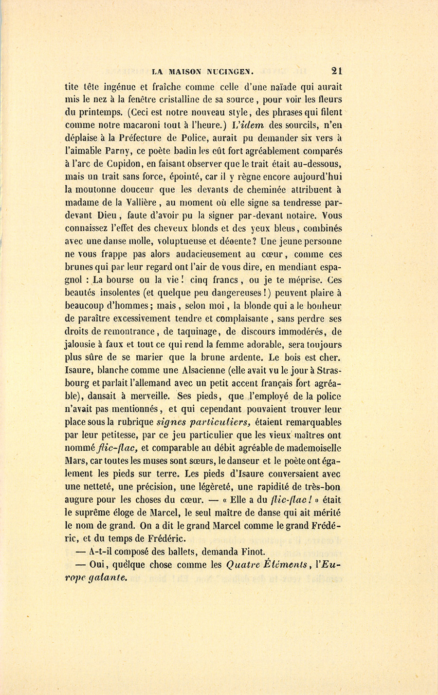 – Godefroid, reprit Bixiou, n’avait pas eu l’avantage de parcourir l’Europe sans observer à fond les danses étrangères. Sans cette profonde connaissance en chorégraphie, qualifiée de futile, peut-être n’eût-il pas aimé cette jeune personne ; mais des trois cents invités qui se pressaient dans les beaux salons de la rue Saint-Lazare, il fut le seul à comprendre l’amour inédit que trahissait une danse bavarde. On remarqua bien la manière d’Isaure d’Aldrigger ; mais, dans ce siècle où chacun s’écrie : Glissons, n’appuyons pas ! l’un dit : Voilà une jeune fille qui danse fameusement bien (c’était un clerc de notaire) ; l’autre : Voilà une jeune personne qui danse à ravir (c’était une dame en turban) ; la troisième, une femme de trente ans : Voilà une petite personne qui ne danse pas mal ! Revenons au grand Marcel, et disons en parodiant son plus fameux mot : Que de choses dans un avant-deux !