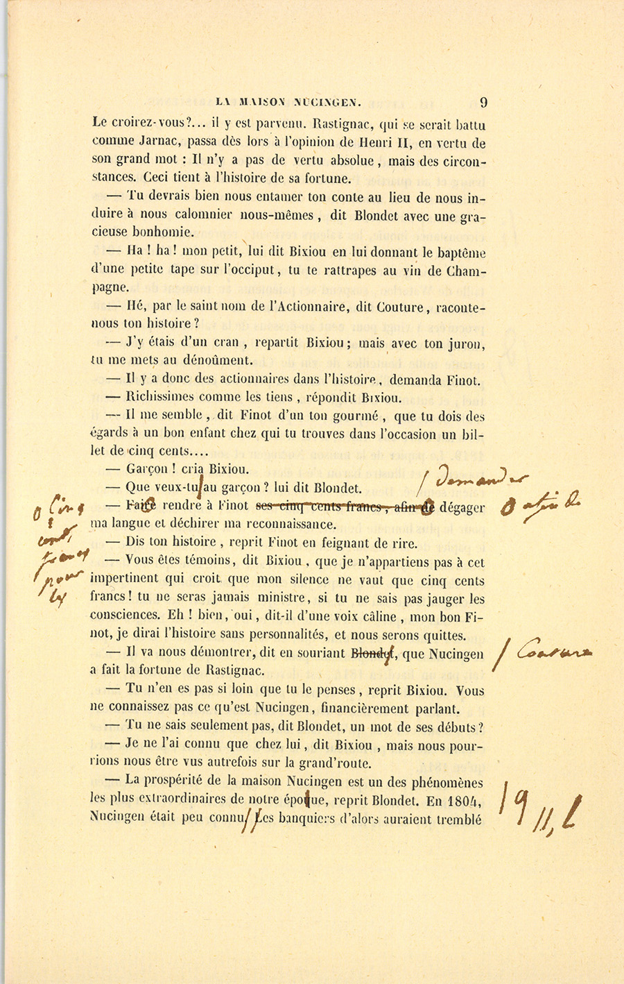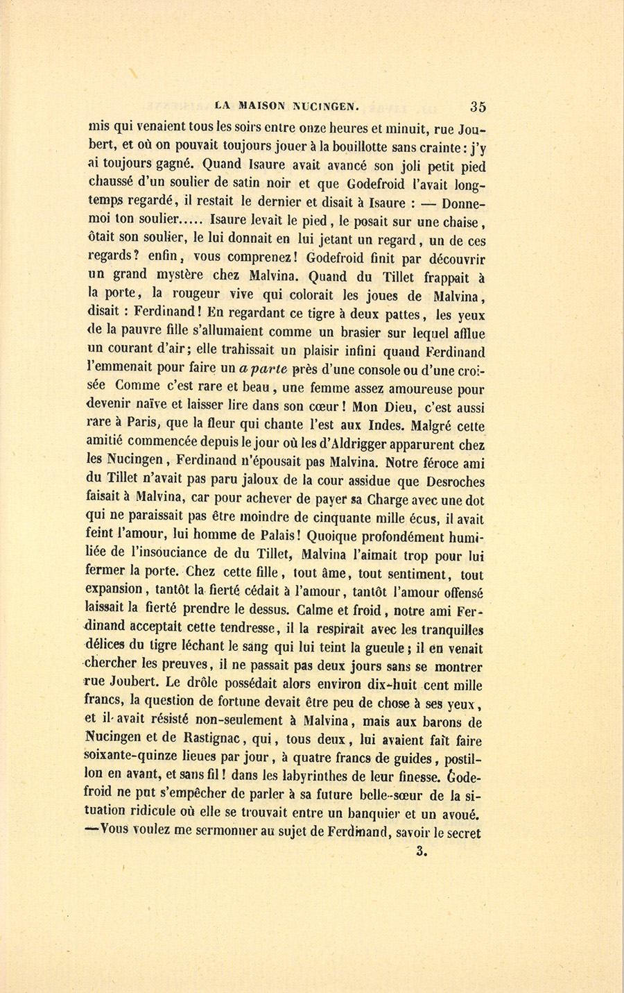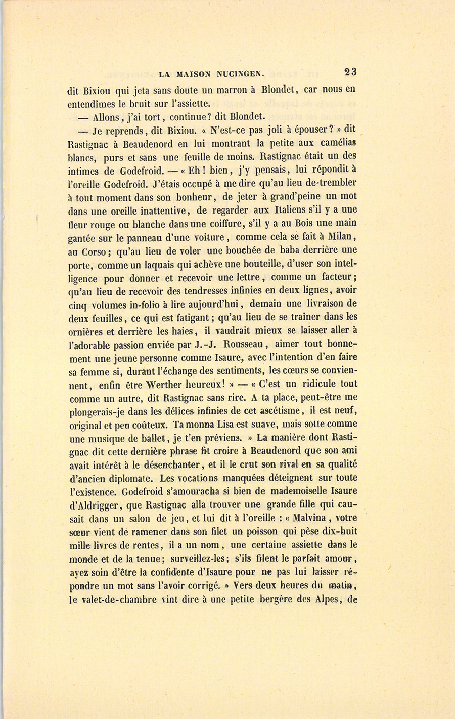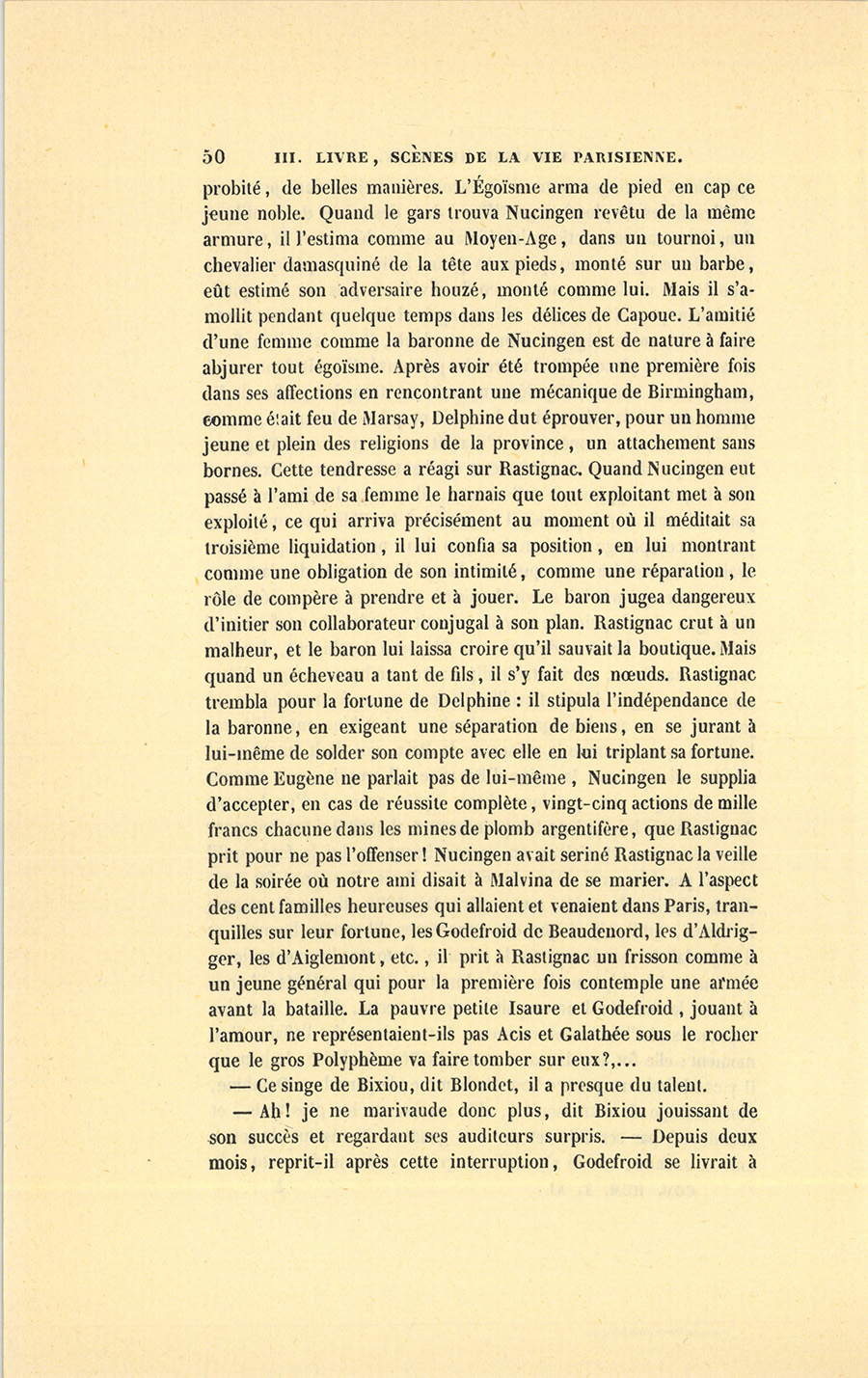 – Tu connais bien Nucingen, dit Bixiou, dans les premiers temps, Delphine et Rastignac le trouvaient bon ; une femme semblait être, pour lui, dans sa maison, un joujou, un ornement. Et voilà ce qui, pour moi, rend cet homme carré de base comme de hauteur : Nucingen ne se cache pas pour dire que sa femme est la représentation de sa fortune, une chose indispensable, mais {p. 5} secondaire dans la vie à haute pression des hommes politiques et des grands financiers. Il a dit, devant moi, que Bonaparte avait été bête comme un bourgeois dans ses premières relations avec Joséphine, et qu’après avoir eu le courage de la prendre comme un marchepied, il avait été ridicule en voulant faire d’elle une compagne.