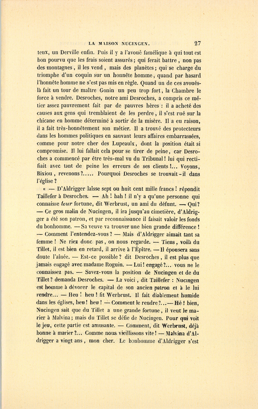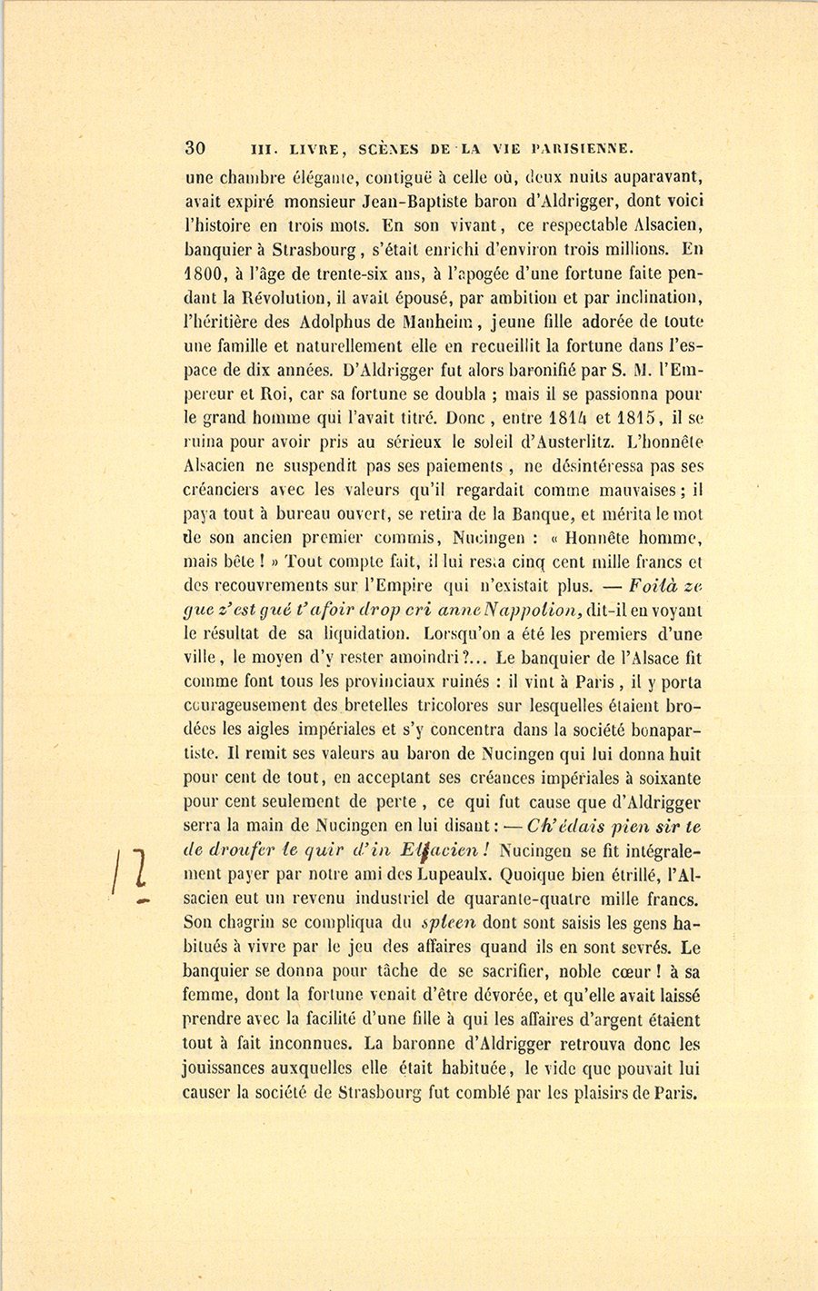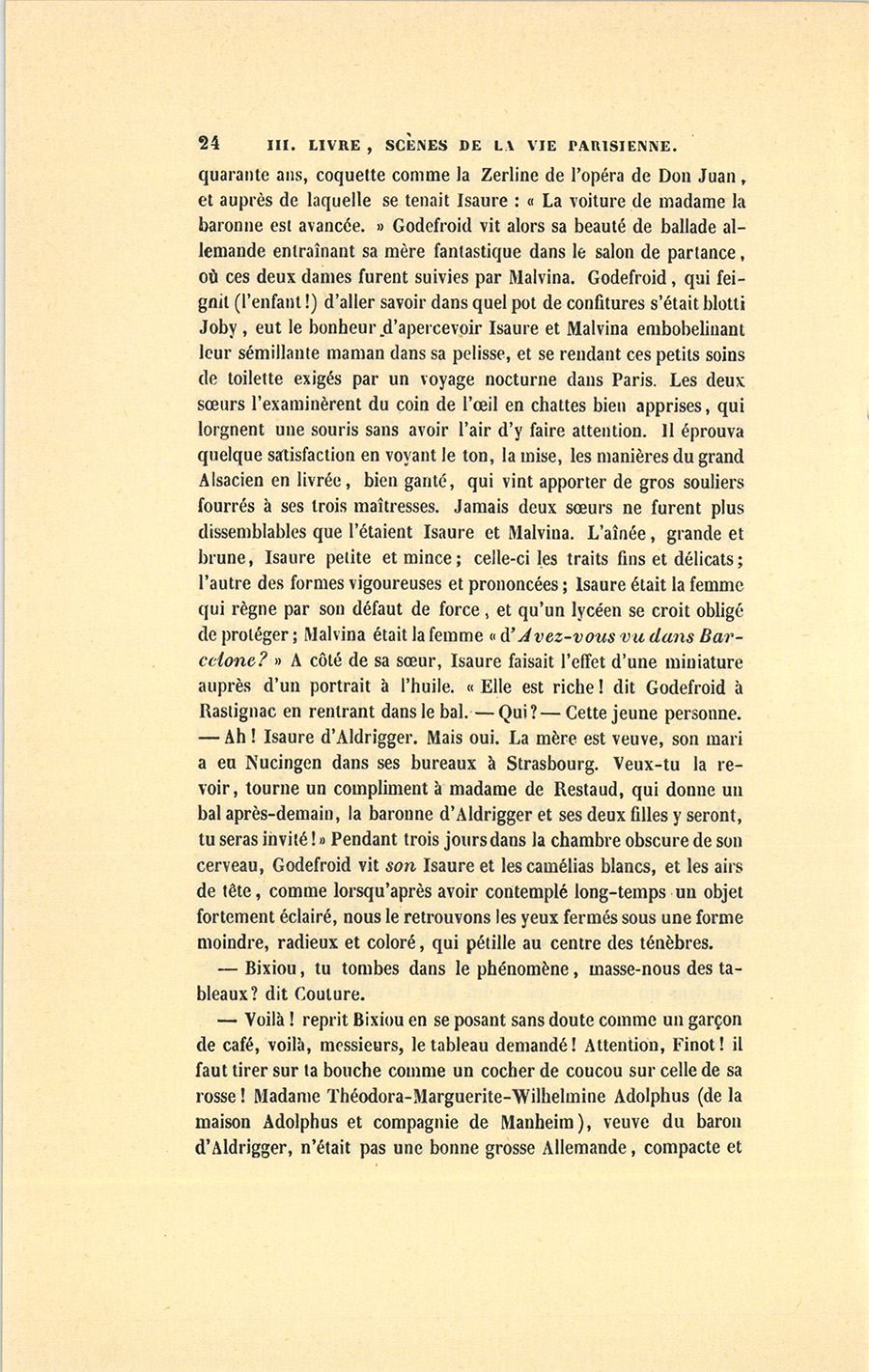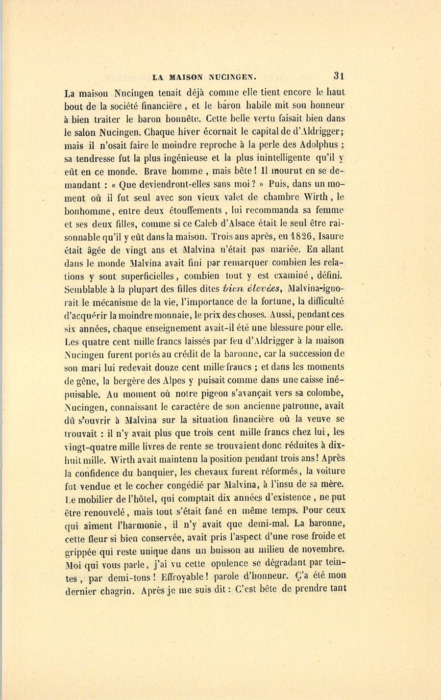 « – Elle peut paraître laide à ceux qui ne la connaissent pas, mais, je l’avoue, elle a de l’âme, disait du Tillet. – Ed tu quir, c’esd le pon te l’iffire, mon cher, il aura ti téfuement et te l’indelligence. Tans nodre chin te médier, on ne said ni ki fit, ni ki mire ; c’esd eine crant ponhire ki te pufoir se gonvier au quir te sa femme. Che droguerais bienne Telvine qui, fous le safez, m’a abordé plis d’eine million, gondre Malfina qui n’a pas ine taude si crante. – Mais qu’a-t-elle ? – Che ne sais bas au chiste, dit le baron de Nucingen, mais il a keke chausse. – Elle a une mère qui aime bien le rose ! » dit du Tillet. Ce mot mit fin aux tentatives de Nucingen. Après le dîner, le baron apprit alors à la Wilhelmine-Adolphus qu’il lui restait à peine quatre cent mille francs chez lui. La fille des Adolphus de Manheim, réduite à vingt-quatre mille livres de rente, se perdit dans des calculs qui se brouillaient dans sa tête. « – Comment ! disait-elle à Malvina, comment ! j’ai toujours eu six mille francs pour nous chez la couturière ! mais où ton père prenait-il de l’argent ? Nous n’aurons rien avec vingt-quatre mille francs, nous sommes dans la misère. Ah ! si mon père me voyait ainsi déchue, il en mourrait, s’il n’était pas mort déjà ! Pauvre Wilhelmine ! » Et elle se mit à pleurer. Malvina, ne sachant comment consoler sa mère, lui représenta qu’elle était encore jeune et jolie, le rose lui seyait toujours, elle irait à l’Opéra, aux Bouffons dans la loge de madame de Nucingen. Elle endormit sa mère dans un rêve de fêtes, de bals, de musique, de belles toilettes et de succès, qui commença sous les rideaux d’un lit en soie bleue, dans {p. 30} une chambre élégante, contiguë à celle où, deux nuits auparavant, avait expiré monsieur Jean-Baptiste baron d’Aldrigger, dont voici l’histoire en trois mots. En son vivant, ce respectable Alsacien, banquier à Strasbourg, s’était enrichi d’environ trois millions. En 1800, à l’âge de trente-six ans, à l’apogée d’une fortune faite pendant la Révolution, il avait épousé, par ambition et par inclination, l’héritière des Adolphus de Manheim, jeune fille adorée de toute une famille et naturellement elle en recueillit la fortune dans l’espace de dix années. D’Aldrigger fut alors baronifié par S. M. l’Empereur et Roi, car sa fortune se doubla ; mais il se passionna pour le grand homme qui l’avait titré. Donc, entre 1814 et 1815, il se ruina pour avoir pris au sérieux le soleil d’Austerlitz. L’honnête Alsacien ne suspendit pas ses paiements, ne désintéressa pas ses créanciers avec les valeurs qu’il regardait comme mauvaises ; il paya tout à bureau ouvert, se retira de la Banque, et mérita le mot de son ancien premier commis, Nucingen : « Honnête homme, mais bête ! » Tout compte fait, il lui resta cinq cent mille francs et des recouvrements sur l’Empire qui n’existait plus. – Foilà ze gue z’est gué t’afoir drop cri anne Nappolion, dit-il en voyant le résultat de sa liquidation. Lorsqu’on a été les premiers d’une ville, le moyen d’y rester amoindri ?… Le banquier de l’Alsace fit comme font tous les provinciaux ruinés : il vint à Paris, il y porta courageusement des bretelles tricolores sur lesquelles étaient brodées les aigles impériales et s’y concentra dans la société bonapartiste. Il remit ses valeurs au baron de Nucingen qui lui donna huit pour cent de tout, en acceptant ses créances impériales à soixante pour cent seulement de perte, ce qui fut cause que d’Aldrigger serra la main de Nucingen en lui disant : – Ch’édais pien sir te de droufer le quir d’in Elzacien ! Nucingen se fit intégralement payer par notre ami des Lupeaulx. Quoique bien étrillé, l’Alsacien eut un revenu industriel de quarante-quatre mille francs. Son chagrin se compliqua du spleen dont sont saisis les gens habitués à vivre par le jeu des affaires quand ils en sont sevrés. Le banquier se donna pour tâche de se sacrifier, noble cœur ! à sa femme, dont la fortune venait d’être dévorée, et qu’elle avait laissé prendre avec la facilité d’une fille à qui les affaires d’argent étaient tout à fait inconnues. La baronne d’Aldrigger retrouva donc les jouissances auxquelles elle était habituée, le vide que pouvait lui causer la société de Strasbourg fut comblé par les plaisirs de Paris. {p. 31} La maison Nucingen tenait déjà comme elle tient encore le haut bout de la société financière, et le baron habile mit son honneur à bien traiter le baron honnête. Cette belle vertu faisait bien dans le salon Nucingen. Chaque hiver écornait le capital de d’Aldrigger ; mais il n’osait faire le moindre reproche à la perle des Adolphus ; sa tendresse fut la plus ingénieuse et la plus inintelligente qu’il y eût en ce monde. Brave homme, mais bête ! Il mourut en se demandant : « Que deviendront-elles sans moi ? » Puis, dans un moment où il fut seul avec son vieux valet de chambre Wirth, le bonhomme, entre deux étouffements, lui recommanda sa femme et ses deux filles, comme si ce Caleb d’Alsace était le seul être raisonnable qu’il y eût dans la maison. Trois ans après, en 1826, Isaure était âgée de vingt ans et Malvina n’était pas mariée. En allant dans le monde Malvina avait fini par remarquer combien les relations y sont superficielles, combien tout y est examiné, défini. Semblable à la plupart des filles dites bien élevées, Malvina ignorait le mécanisme de la vie, l’importance de la fortune, la difficulté d’acquérir la moindre monnaie, le prix des choses. Aussi, pendant ces six années, chaque enseignement avait-il été une blessure pour elle. Les quatre cent mille francs laissés par feu d’Aldrigger à la maison Nucingen furent portés au crédit de la baronne, car la succession de son mari lui redevait douze cent mille francs ; et da