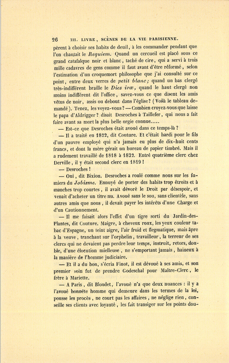 – À Paris, dit Blondet, l’avoué n’a que deux nuances : il y a l’avoué honnête homme qui demeure dans les termes de la loi, pousse les procès, ne court pas les affaires, ne néglige rien, conseille ses clients avec loyauté, les fait transiger sur les points {p. 27} douteux, un Derville enfin. Puis il y a l’avoué famélique à qui tout est bon pourvu que les frais soient assurés ; qui ferait battre, non pas des montagnes, il les vend, mais des planètes ; qui se charge du triomphe d’un coquin sur un honnête homme, quand par hasard l’honnête homme ne s’est pas mis en règle. Quand un de ces avoués-là fait un tour de maître Gonin un peu trop fort, la Chambre le force à vendre. Desroches, notre ami Desroches, a compris ce métier assez pauvrement fait par de pauvres hères : il a acheté des causes aux gens qui tremblaient de les perdre, il s’est rué sur la chicane en homme déterminé à sortir de la misère. Il a eu raison, il a fait très-honnêtement son métier. Il a trouvé des protecteurs dans les hommes politiques en sauvant leurs affaires embarrassées, comme pour notre cher des Lupeaulx, dont la position était si compromise. Il lui fallait cela pour se tirer de peine, car Desroches a commencé par être très-mal vu du Tribunal ! lui qui rectifiait avec tant de peine les erreurs de ses clients !… Voyons, Bixiou, revenons ?… Pourquoi Desroches se trouvait-il dans l’église ?