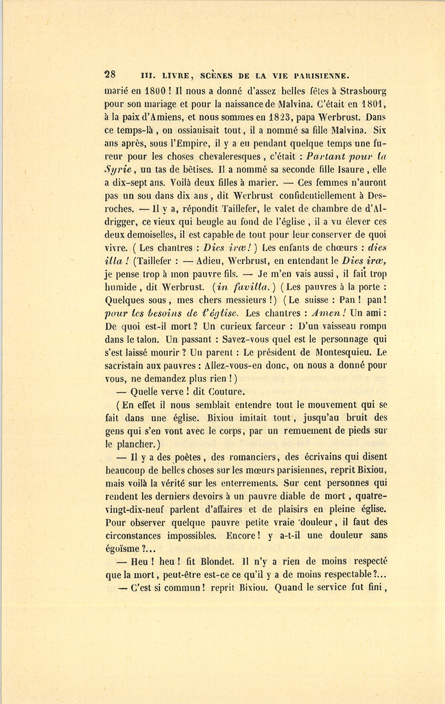 « – D’Aldrigger laisse sept ou huit cent mille francs ! répondit Taillefer à Desroches. – Ah ! bah ! il n’y a qu’une personne qui connaisse leur fortune, dit Werbrust, un ami du défunt. – Qui ? – Ce gros malin de Nucingen, il ira jusqu’au cimetière, d’Aldrigger a été son patron, et par reconnaissance il faisait valoir les fonds du bonhomme. – Sa veuve va trouver une bien grande différence ! – Comment l’entendez-vous ? – Mais d’Aldrigger aimait tant sa femme ! Ne riez donc pas, on nous regarde. – Tiens, voilà du Tillet, il est bien en retard, il arrive à l’Épître. – Il épousera sans doute l’aînée. – Est-ce possible ? dit Desroches, il est plus que jamais engagé avec madame Roguin. – Lui ! engagé ?… vous ne le connaissez pas. – Savez-vous la position de Nucingen et de du Tillet ? demanda Desroches. – La voici, dit Taillefer : Nucingen est homme à dévorer le capital de son ancien patron et à le lui rendre… – Heu ! heu ! fit Werbrust. Il fait diablement humide dans les églises, heu ! heu ! – Comment le rendre ?… – Hé ! bien, Nucingen sait que du Tillet a une grande fortune, il veut le marier à Malvina ; mais du Tillet se défie de Nucingen. Pour qui voit le jeu, cette partie est amusante. – Comment, dit Werbrust, déjà bonne à marier ?… Comme nous vieillissons vite ! – Malvina d’Aldrigger a vingt ans, mon cher. Le bonhomme d’Aldrigger s’est {p. 28} marié en 1800 ! Il nous a donné d’assez belles fêtes à Strasbourg pour son mariage et pour la naissance de Malvina. C’était en 1801, à la paix d’Amiens, et nous sommes en 1823, papa Werbrust. Dans ce temps-là, on ossianisait tout, il a nommé sa fille Malvina. Six ans après, sous l’Empire, il y a eu pendant quelque temps une fureur pour les choses chevaleresques, c’était : Partant pour la Syrie, un tas de bêtises. Il a nommé sa seconde fille Isaure, elle a dix-sept ans. Voilà deux filles à marier. – Ces femmes n’auront pas un sou dans dix ans, dit Werbrust confidentiellement à Desroches. – Il y a, répondit Taillefer, le valet de chambre de d’Aldrigger, ce vieux qui beugle au fond de l’église, il a vu élever ces deux demoiselles, il est capable de tout pour leur conserver de quoi vivre. (Les chantres : Dies iræ !) Les enfants de chœur4 : dies illa ! Taillefer5 : – Adieu, Werbrust, en entendant le Dies iræ, je pense trop à mon pauvre fils. – Je m’en vais aussi, il fait trop humide, dit Werbrust. (In favilla6.) (Les pauvres à la porte : Quelques sous, mes chers messieurs !) (Le suisse : Pan ! pan ! pour les besoins de l’église. Les chantres : Amen ! Un ami : De quoi est-il mort ? Un curieux farceur : D’un vaisseau rompu dans le talon. Un passant : Savez-vous quel est le personnage qui s’est laissé mourir ? Un parent : Le président de Montesquieu. Le sacristain aux pauvres : Allez-vous-en donc, on nous a donné pour vous, ne demandez plus rien !)