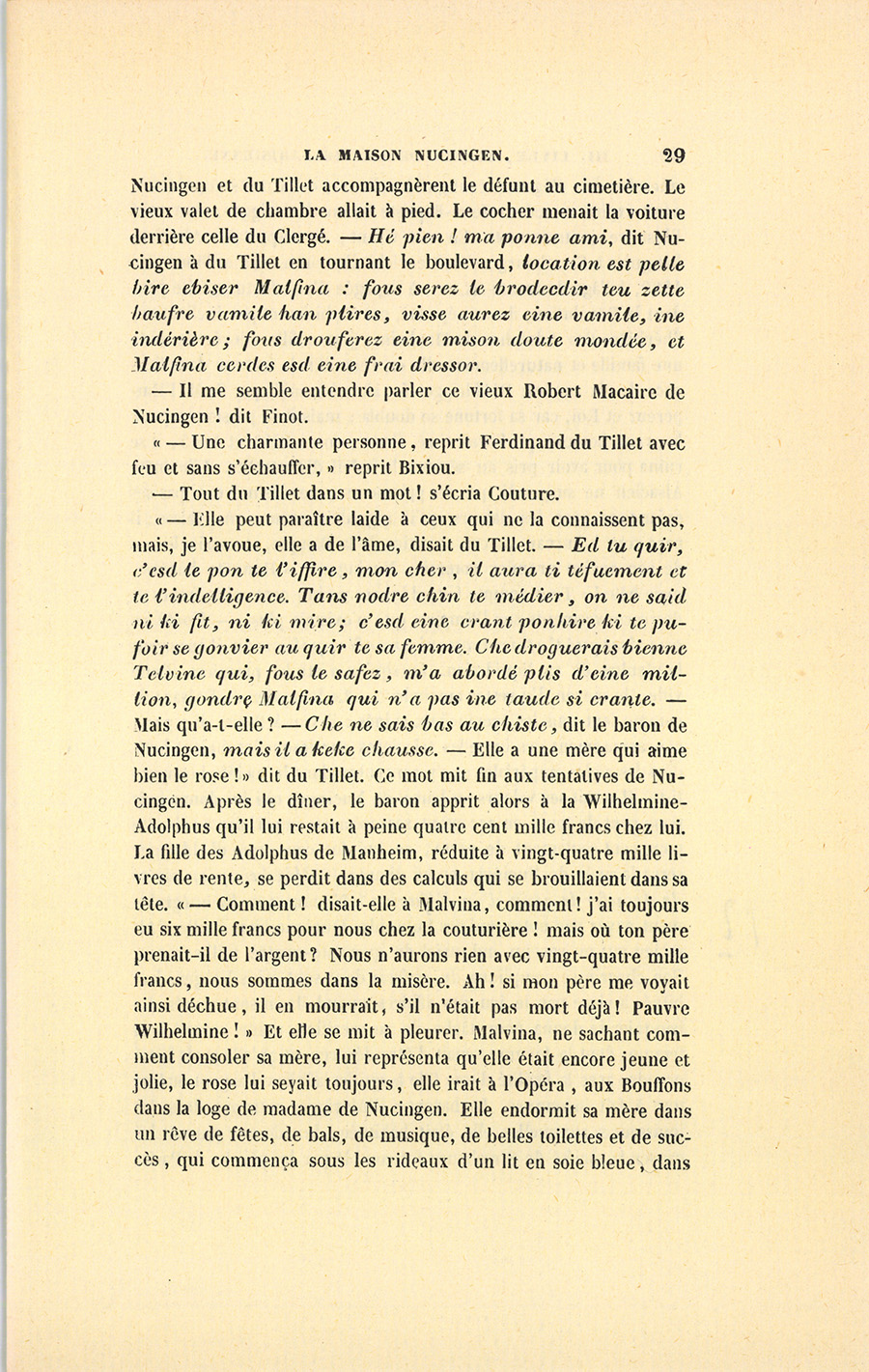 – C’est si commun ! reprit Bixiou. Quand le service fut fini, {p. 29} Nucingen et du Tillet accompagnèrent le défunt au cimetière. Le vieux valet de chambre allait à pied. Le cocher menait la voiture derrière celle du Clergé. – Hé pien ! ma ponne ami, dit Nucingen à du Tillet en tournant le boulevard, location est pelle bire ebiser Malfina : fous serez le brodecdir teu zette baufre vamile han plires, visse aurez eine vamile, ine indérière ; fous drouferez eine mison doute mondée, et Malfina cerdes esd eine frai dressor.
