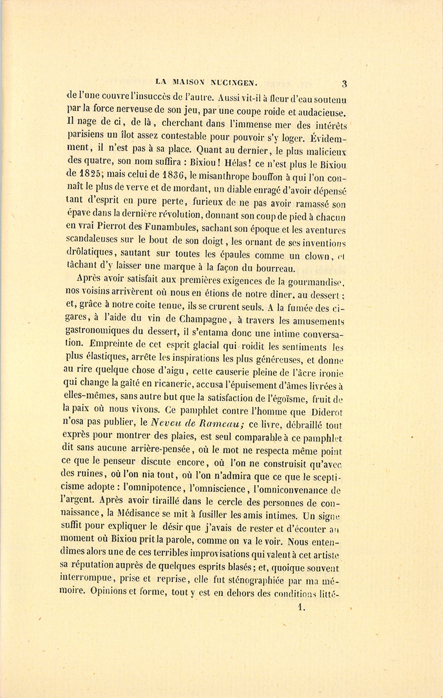 Après avoir satisfait aux premières exigences de la gourmandise, nos voisins arrivèrent où nous en étions de notre dîner, au dessert ; et, grâce à notre coite tenue, ils se crurent seuls. À la fumée des cigares, à l’aide du vin de Champagne, à travers les amusements gastronomiques du dessert, il s’entama donc une intime conversation. Empreinte de cet esprit glacial qui roidit les sentiments les plus élastiques, arrête les inspirations les plus généreuses, et donne au rire quelque chose d’aigu, cette causerie pleine de l’âcre ironie qui change la gaîté en ricanerie, accusa l’épuisement d’âmes livrées à elles-mêmes, sans autre but que la satisfaction de l’égoïsme, fruit de la paix où nous vivons. Ce pamphlet contre l’homme que Diderot n’osa pas publier, le Neveu de Rameau ; ce livre, débraillé tout exprès pour montrer des plaies, est seul comparable à ce pamphlet dit sans aucune arrière-pensée, où le mot ne respecta même point ce que le penseur discute encore, où l’on ne construisit qu’avec des ruines, où l’on nia tout, où l’on n’admira que ce que le scepticisme adopte : l’omnipotence, l’omniscience, l’omniconvenance de l’argent. Après avoir tiraillé dans le cercle des personnes de connaissance, la Médisance se mit à fusiller les amis intimes. Un signe suffit pour expliquer le désir que j’avais de rester et d’écouter au moment où Bixiou prit la parole, comme on va le voir. Nous entendîmes alors une de ces terribles improvisations qui valent à cet artiste sa réputation auprès de quelques esprits blasés ; et, quoique souvent interrompue, prise et reprise, elle fut sténographiée par ma mémoire. Opinions et forme, tout y est en dehors des conditions {p. 4} littéraires. Mais c’est ce que cela fut : un pot-pourri de choses sinistres qui peint notre temps, auquel l’on ne devrait raconter que de semblables histoires, et j’en laisse d’ailleurs la responsabilité au narrateur principal. La pantomime, les gestes, en rapport avec les fréquents changements de voix par lesquels Bixiou peignait les interlocuteurs mis en scène, devaient être parfaits, car ses trois auditeurs laissaient échapper des exclamations approbatives et des interjections de contentement.