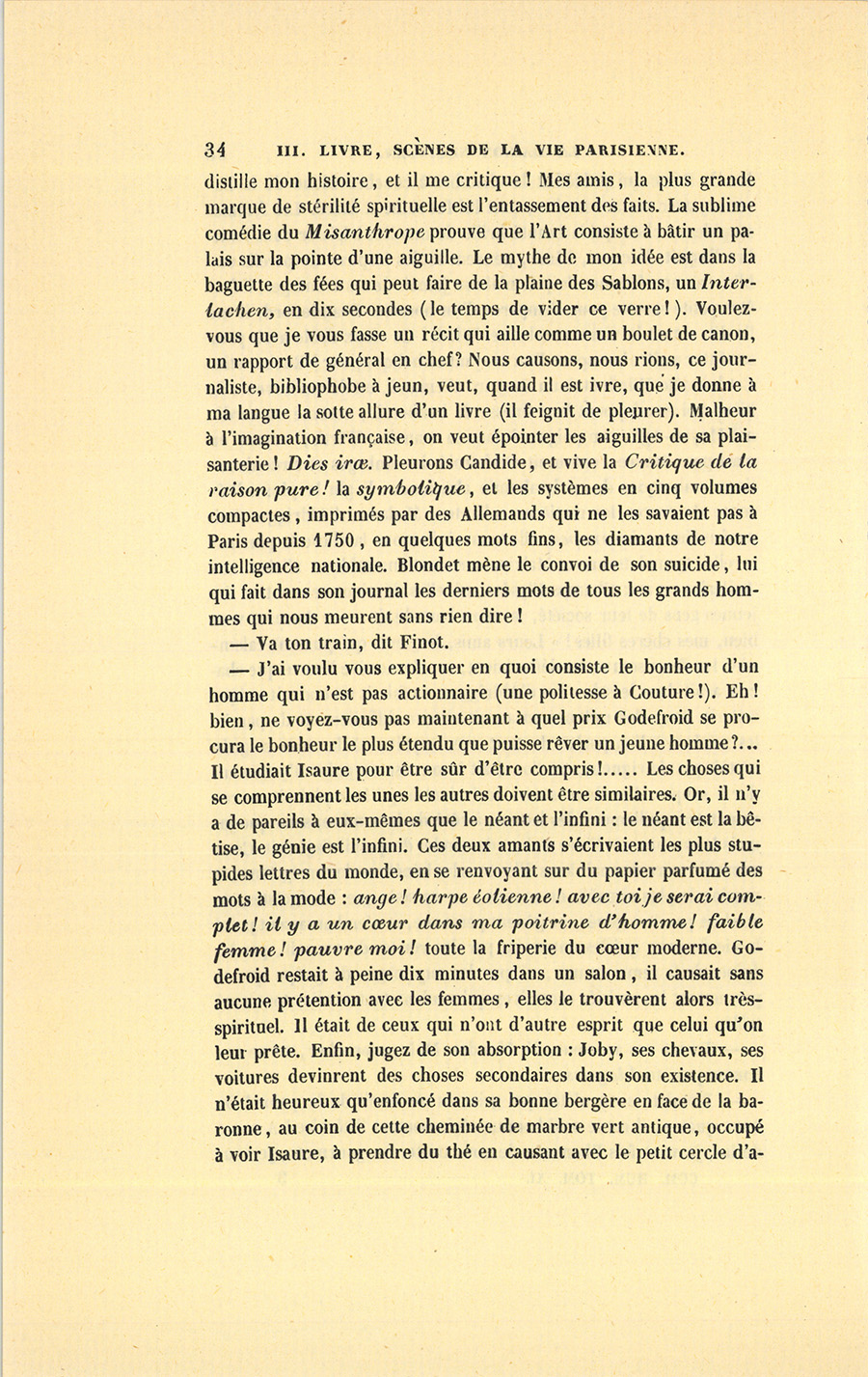 – Blondet, si tu n’étais pas gris, tu me ferais de la peine ! De nous quatre, il est le seul homme sérieusement littéraire ! À cause de lui, je vous fais l’honneur de vous traiter en gourmets, je vous {p. 34} distille mon histoire, et il me critique ! Mes amis, la plus grande marque de stérilité spirituelle est l’entassement des faits. La sublime comédie du Misanthrope prouve que l’Art consiste à bâtir un palais sur la pointe d’une aiguille. Le mythe de mon idée est dans la baguette des fées qui peut faire de la plaine des Sablons, un Interlachen, en dix secondes (le temps de vider ce verre !). Voulez-vous que je vous fasse un récit qui aille comme un boulet de canon, un rapport de général en chef ? Nous causons, nous rions, ce journaliste, bibliophobe à jeun, veut, quand il est ivre, que je donne à ma langue la sotte allure d’un livre (il feignit de pleurer). Malheur à l’imagination française, on veut épointer les aiguilles de sa plaisanterie ! Dies iræ. Pleurons Candide, et vive la Critique de la raison pure ! la symbolique, et les systèmes en cinq volumes compacts7, imprimés par des Allemands qui ne les savaient pas à Paris depuis 1750, en quelques mots fins, les diamants de notre intelligence nationale. Blondet mène le convoi de son suicide, lui qui fait dans son journal les derniers mots de tous les grands hommes qui nous meurent sans rien dire !