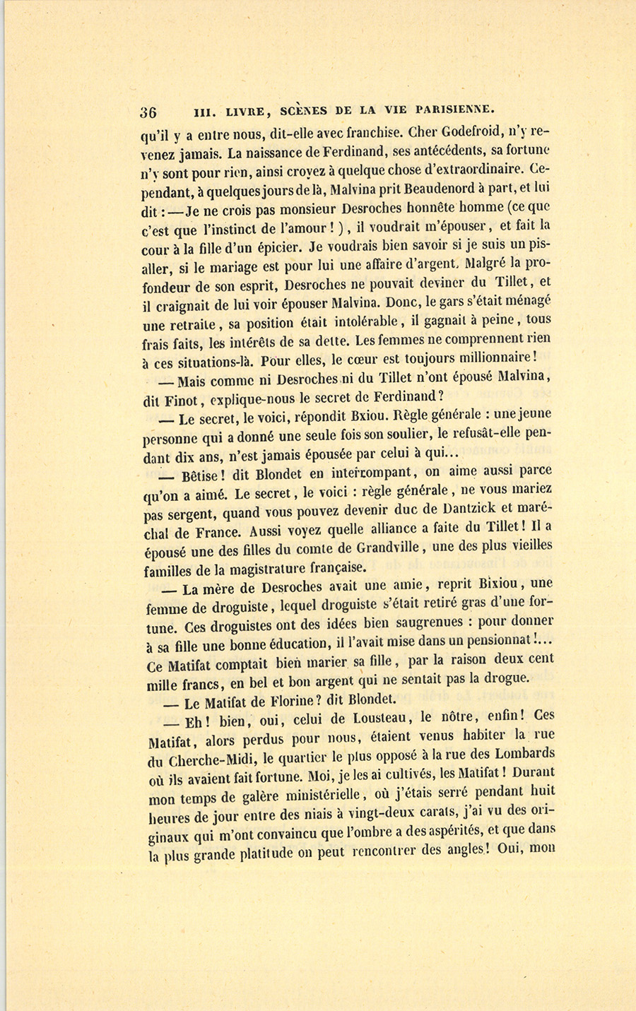 – Eh ! bien, oui, celui de Lousteau, le nôtre, enfin ! Ces Matifat, alors perdus pour nous, étaient venus habiter la rue du Cherche-Midi, le quartier le plus opposé à la rue des Lombards où ils avaient fait fortune. Moi, je les ai cultivés, les Matifat ! Durant mon temps de galère ministérielle, où j’étais serré pendant huit heures de jour entre des niais à vingt-deux carats, j’ai vu des originaux qui m’ont convaincu que l’ombre a des aspérités, et que dans la plus grande platitude on peut rencontrer des angles ! Oui, mon {p. 37} cher, tel bourgeois est à tel autre ce que Raphaël est à Natoire. Madame veuve Desroches avait moyenné de longue main ce mariage à son fils, malgré l’obstacle énorme que présentait un certain Cochin, fils de l’associé commanditaire des Matifat, jeune employé au Ministère des Finances. Aux yeux de monsieur et madame Matifat, l’état d’avoué paraissait, selon leur mot, offrir des garanties pour le bonheur d’une femme. Desroches s’était prêté aux plans de sa mère afin d’avoir un pis-aller. Il ménageait donc les droguistes de la rue du Cherche-Midi. Pour vous faire comprendre un autre genre de bonheur, il faudrait vous peindre ces deux négociants mâle et femelle, jouissant d’un jardinet, logés à un beau rez-de-chaussée, s’amusant à regarder un jet d’eau, mince et long comme un épi, qui allait perpétuellement et s’élançait d’une petite table ronde en pierre de liais, située au milieu d’un bassin de six pieds de diamètre, se levant de bon matin pour voir si les fleurs de leur jardin avaient poussé, désœuvrés et inquiets, s’habillant pour s’habiller, s’ennuyant au spectacle, et toujours entre Paris et Luzarches où ils avaient une maison de campagne et où j’ai dîné. Blondet, un jour ils ont voulu me faire poser, je leur ai raconté une histoire depuis neuf heures du soir jusqu’à minuit, une aventure à tiroirs ! J’en étais à l’introduction de mon vingt-neuvième personnage (les romans en feuilletons m’ont volé !), quand le père Matifat, qui en qualité de maître de maison, tenait encore bon, a ronflé comme les autres, après avoir clignoté pendant cinq minutes. Le lendemain, tous m’ont fait des compliments sur le dénoûment de mon histoire. Ces épiciers avaient pour société monsieur et madame Cochin, Adolphe Cochin, madame Desroches, un petit Popinot, droguiste en exercice, qui leur donnait des nouvelles de la rue des Lombards (un homme de ta connaissance, Finot !). Madame Matifat, qui aimait les Arts, achetait des lithographies, des lithochromies, des dessins coloriés, tout ce qu’il y avait de meilleur marché. Le sieur Matifat se distrayait en examinant les entreprises nouvelles et en essayant de jouer quelques capitaux, afin de ressentir des émotions (Florine l’avait guéri du genre Régence). Un seul mot vous fera comprendre la profondeur de mon Matifat. Le bonhomme souhaitait ainsi le bonsoir à ses nièces : « Va te coucher, mes nièces ! » Il avait peur, disait-il, de les affliger en leur disant vous. Leur fille était une jeune personne sans manières, ayant l’air d’une femme de chambre de bonne maison, jouant tant bien que mal une sonate, {p. 38} ayant une jolie écriture anglaise, sachant le français et l’orthographe, enfin une complète éducation bourgeoise. Elle était assez impatiente d’être mariée, afin de quitter la maison paternelle, où elle s’ennuyait comme un officier de marine au quart de nuit, il faut dire aussi que le quart durait toute la journée. Desroches ou Cochin fils, un notaire ou un garde-du-corps, un faux lord anglais, tout mari lui était bon. Comme évidemment elle ne savait rien de la vie, j’en ai eu pitié, j’ai voulu lui en révéler le grand mystère. Bah ! les Matifat m’ont fermé leur porte : les bourgeois et moi nous ne nous comprendrons jamais.