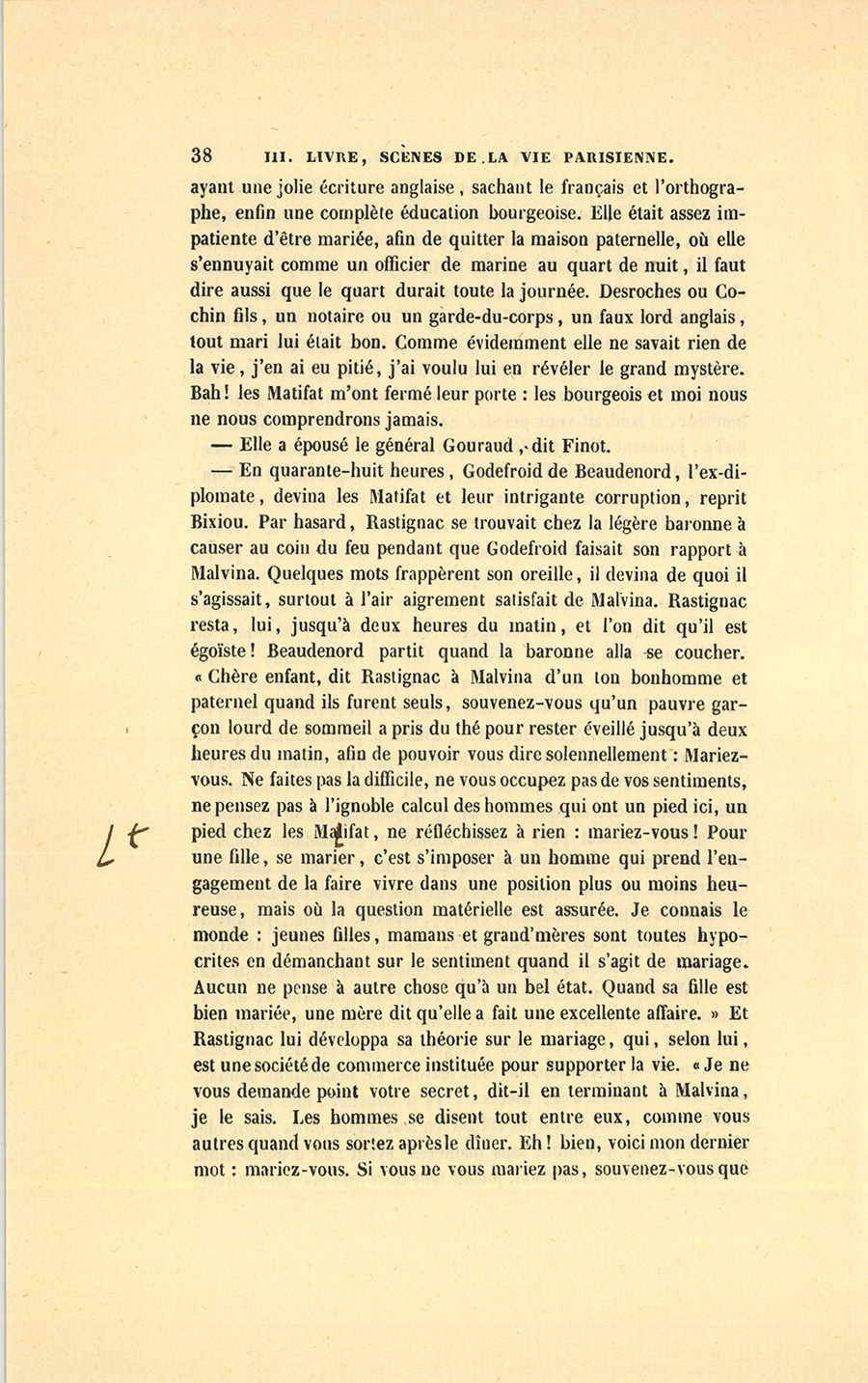 – En quarante-huit heures, Godefroid de Beaudenord, l’ex-diplomate, devina les Matifat et leur intrigante corruption, reprit Bixiou. Par hasard, Rastignac se trouvait chez la légère baronne à causer au coin du feu pendant que Godefroid faisait son rapport à Malvina. Quelques mots frappèrent son oreille, il devina de quoi il s’agissait, surtout à l’air aigrement satisfait de Malvina. Rastignac resta, lui, jusqu’à deux heures du matin, et l’on dit qu’il est égoïste ! Beaudenord partit quand la baronne alla se coucher. « Chère enfant, dit Rastignac à Malvina d’un ton bonhomme et paternel quand ils furent seuls, souvenez-vous qu’un pauvre garçon lourd de sommeil a pris du thé pour rester éveillé jusqu’à deux heures du matin, afin de pouvoir vous dire solennellement : Mariez-vous. Ne faites pas la difficile, ne vous occupez pas de vos sentiments, ne pensez pas à l’ignoble calcul des hommes qui ont un pied ici, un pied chez les Matifat, ne réfléchissez à rien : mariez-vous ! Pour une fille, se marier, c’est s’imposer à un homme qui prend l’engagement de la faire vivre dans une position plus ou moins heureuse, mais où la question matérielle est assurée. Je connais le monde : jeunes filles, mamans et grand’mères sont toutes hypocrites en démanchant sur le sentiment quand il s’agit de mariage. Aucun ne pense à autre chose qu’à un bel état. Quand sa fille est bien mariée, une mère dit qu’elle a fait une excellente affaire. » Et Rastignac lui développa sa théorie sur le mariage, qui, selon lui, est une société de commerce instituée pour supporter la vie. « Je ne vous demande point votre secret, dit-il en terminant à Malvina, je le sais. Les hommes se disent tout entre eux, comme vous autres quand vous sortez après le dîner. Eh ! bien, voici mon dernier mot : mariez-vous. Si vous ne vous mariez pas, souvenez-vous que {p. 39} je vous ai suppliée ici, ce soir, de vous marier ! » Rastignac parlait avec un certain accent qui commandait, non pas l’attention, mais la réflexion. Son insistance était de nature à surprendre. Malvina fut alors si bien frappée au vif de l’intelligence, là où Rastignac avait voulu l’atteindre, qu’elle y songeait encore le lendemain, et cherchait inutilement la cause de cet avis.