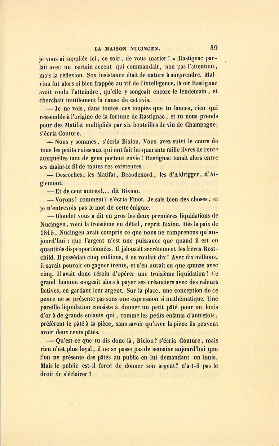 – Je ne vois, dans toutes ces toupies que tu lances, rien qui ressemble à l’origine de la fortune de Rastignac, et tu nous prends pour des Matifat multipliés par six bouteilles de vin de Champagne, s’écria Couture.