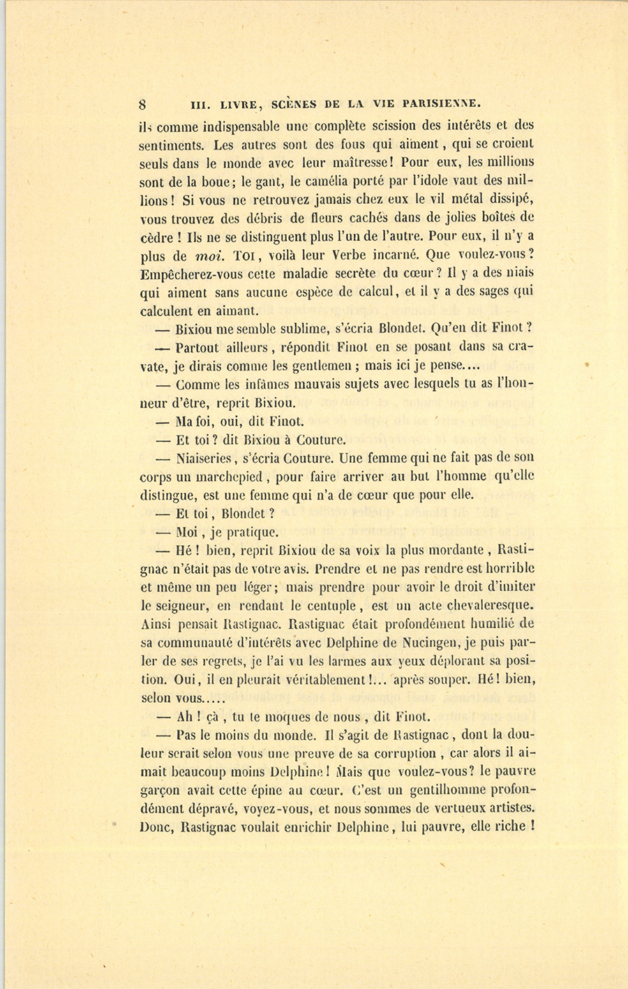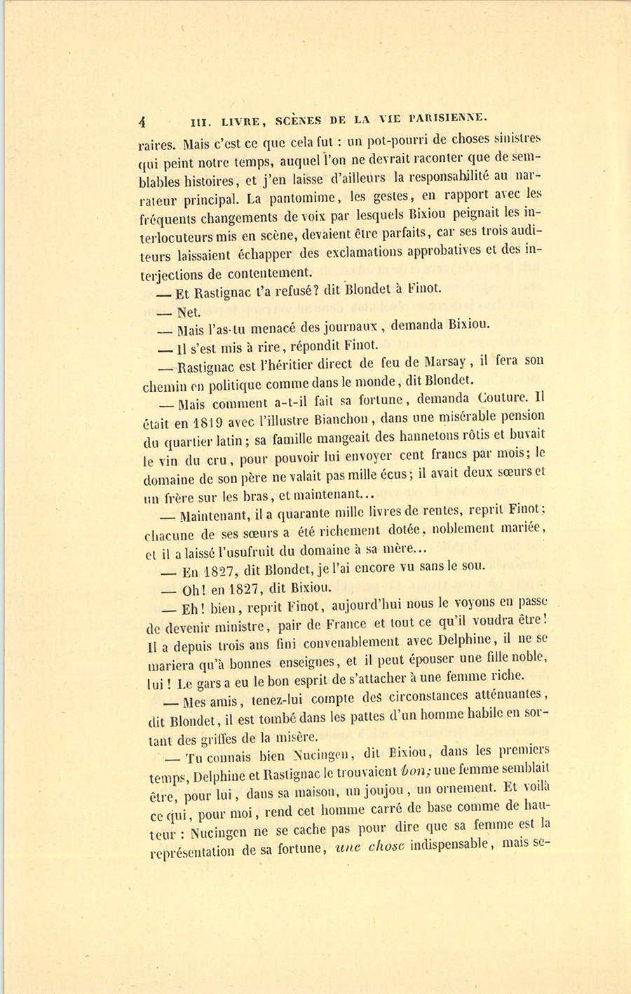 – Pas le moins du monde. Il s’agit de Rastignac, dont la douleur serait selon vous une preuve de sa corruption, car alors il aimait beaucoup moins Delphine ! Mais que voulez-vous ? le pauvre garçon avait cette épine au cœur. C’est un gentilhomme profondément dépravé, voyez-vous, et nous sommes de vertueux artistes. Donc, Rastignac voulait enrichir Delphine, lui pauvre, elle riche ! {p. 9} Le croirez-vous ?… il y est parvenu. Rastignac, qui se serait battu comme Jarnac, passa dès lors à l’opinion de Henri II, en vertu de son grand mot : Il n’y a pas de vertu absolue, mais des circonstances. Ceci tient à l’histoire de sa fortune.