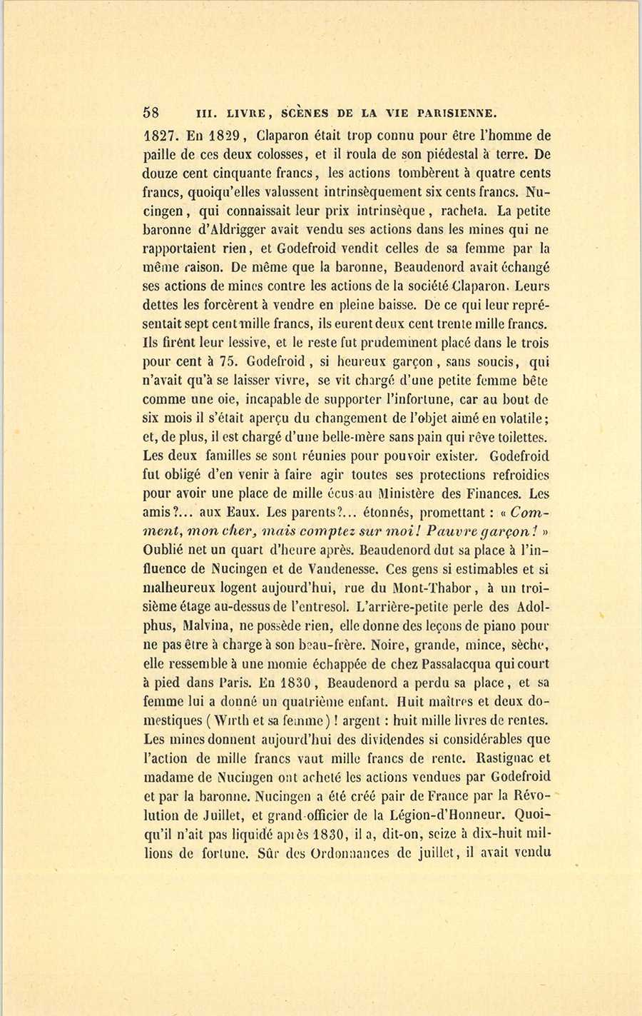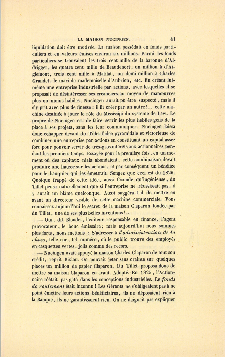 – Nucingen avait appuyé la maison Charles Claparon de tout son crédit, reprit Bixiou. On pouvait jeter sans crainte sur quelques places un million de papier Claparon. Du Tillet proposa donc de mettre sa maison Claparon en avant. Adopté. En 1825, l’Actionnaire n’était pas gâté dans les conceptions industrielles. Le fonds de roulement était inconnu ! Les Gérants ne s’obligeaient pas à ne point émettre leurs actions bénéficiaires, ils ne déposaient rien à la Banque, ils ne garantissaient rien. On ne daignait pas expliquer {p. 42} la commandite en disant à l’Actionnaire qu’on avait la bonté de ne pas lui demander plus de mille, de cinq cents, ou même de deux cent cinquante francs ! On ne publiait pas que l’expérience in ære publico ne durerait que sept ans, cinq ans, ou même trois ans, et qu’ainsi le dénoûment ne se ferait pas long-temps attendre. C’était l’enfance de l’art ! On n’avait même pas fait intervenir la publicité de ces gigantesques annonces par lesquelles on stimule les imaginations, en demandant de l’argent à tout le monde9…