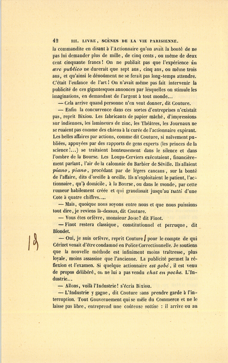 – Enfin la concurrence dans ces sortes d’entreprises n’existait pas, reprit Bixiou. Les fabricants de papier mâché, d’impressions sur indiennes, les lamineurs de zinc, les Théâtres, les Journaux ne se ruaient pas comme des chiens à la curée de l’actionnaire expirant. Les belles affaires par actions, comme dit Couture, si naïvement publiées, appuyées par des rapports de gens experts (les princes de la science !…), se traitaient honteusement dans le silence et dans l’ombre de la Bourse. Les Loups-Cerviers exécutaient, financièrement parlant, l’air de la calomnie du Barbier de Séville. Ils allaient piano, piano, procédant par de légers cancans, sur la bonté de l’affaire, dits d’oreille à oreille. Ils n’exploitaient le patient, l’actionnaire, qu’à domicile, à la Bourse, ou dans le monde, par cette rumeur habilement créée et qui grandissait jusqu’au tutti d’une Cote à quatre chiffres…