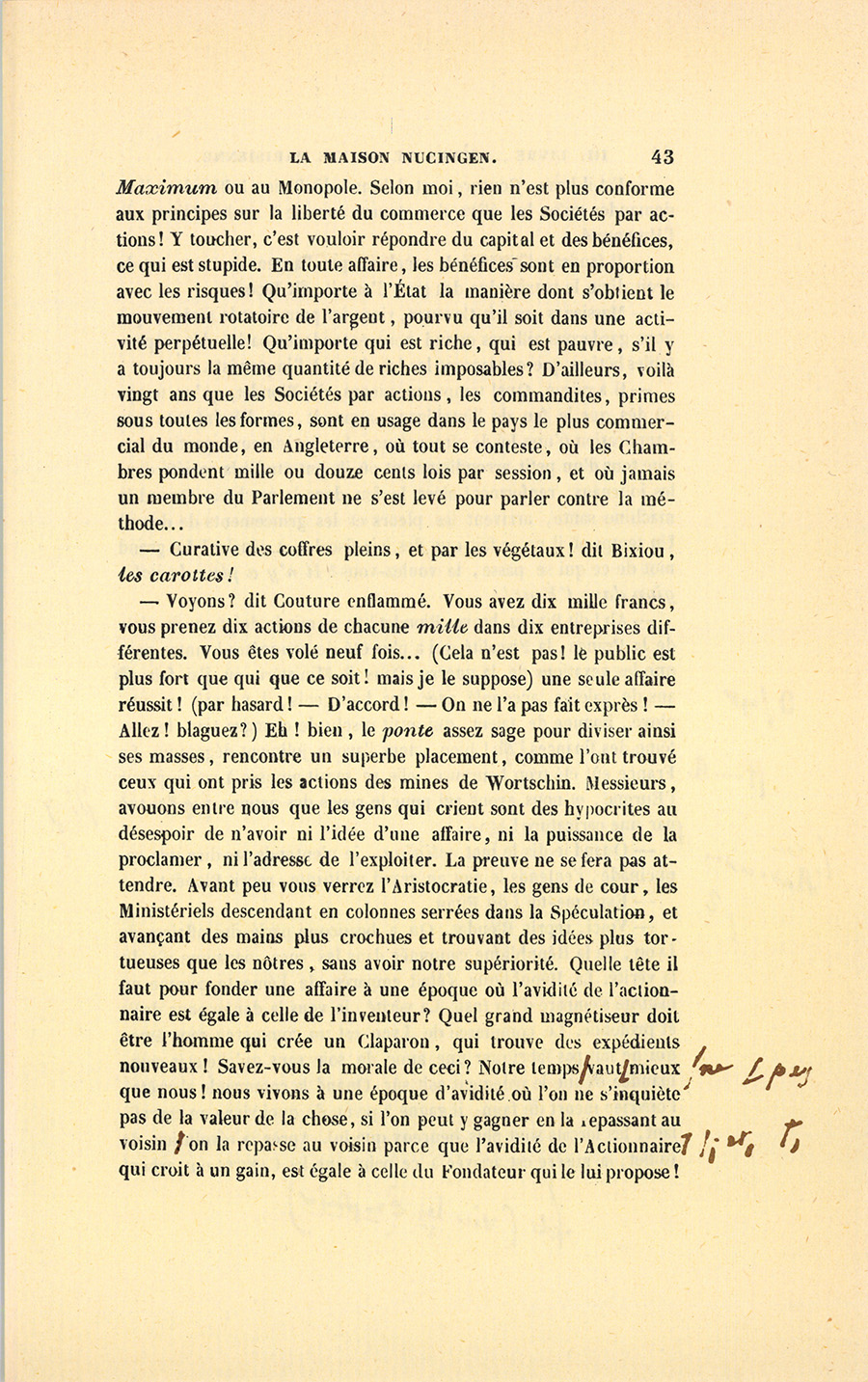– L’Industrie y gagne, dit Couture sans prendre garde à l’interruption. Tout Gouvernement qui se mêle du Commerce et ne le laisse pas libre, entreprend une coûteuse sottise : il arrive ou au {p. 43} Maximum ou au Monopole. Selon moi, rien n’est plus conforme aux principes sur la liberté du commerce que les Sociétés par actions ! Y toucher, c’est vouloir répondre du capital et des bénéfices, ce qui est stupide. En toute affaire, les bénéfices sont en proportion avec les risques ! Qu’importe à l’État la manière dont s’obtient le mouvement rotatoire de l’argent, pourvu qu’il soit dans une activité perpétuelle ! Qu’importe qui est riche, qui est pauvre, s’il y a toujours la même quantité de riches imposables ? D’ailleurs, voilà vingt ans que les Sociétés par actions, les commandites, primes sous toutes les formes, sont en usage dans le pays le plus commercial du monde, en Angleterre, où tout se conteste, où les Chambres pondent mille ou douze cents lois par session, et où jamais un membre du Parlement ne s’est levé pour parler contre la méthode…