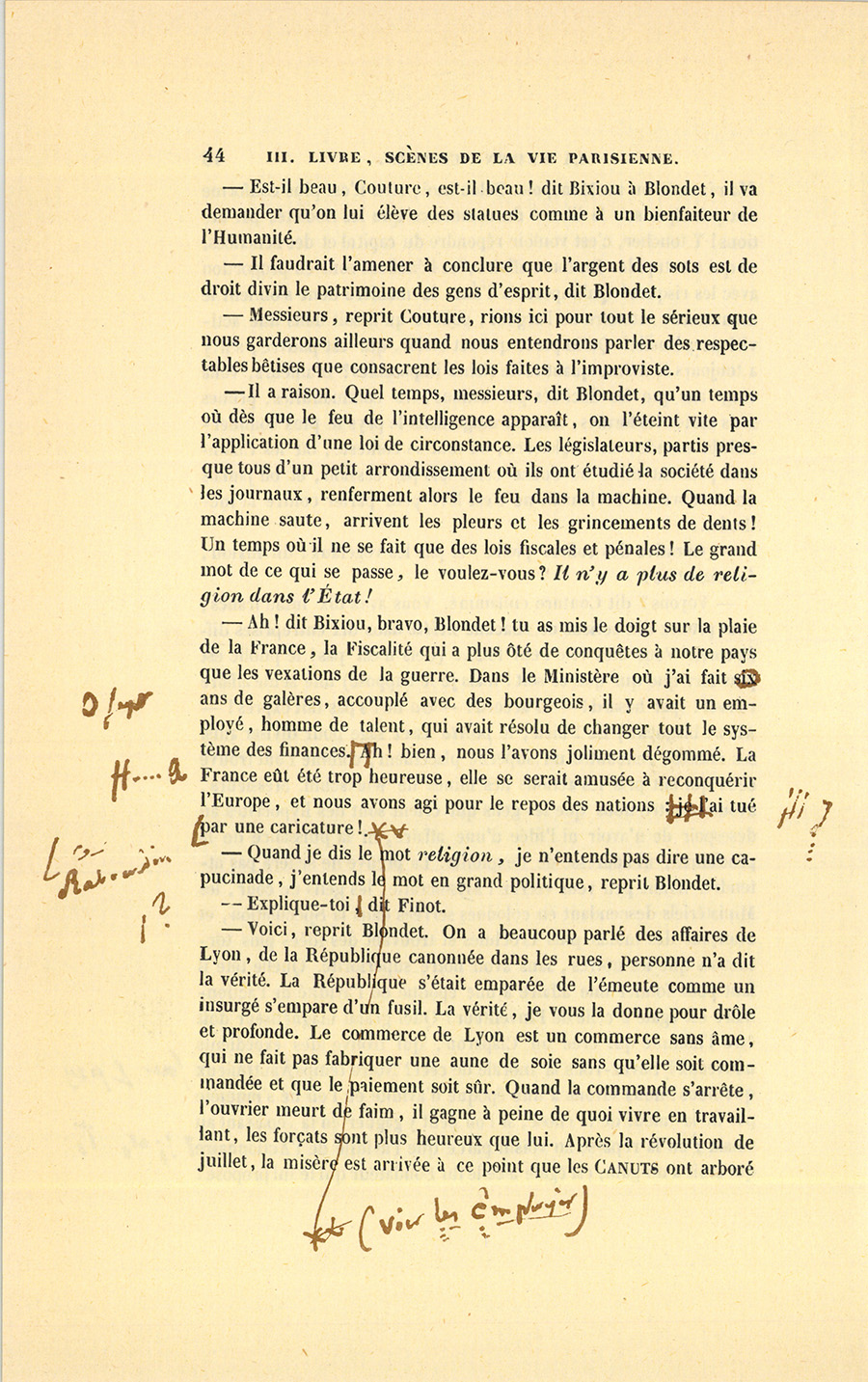 – Voici, reprit Blondet. On a beaucoup parlé des affaires de Lyon, de la République canonnée dans les rues, personne n’a dit la vérité. La République s’était emparée de l’émeute comme un insurgé s’empare d’un fusil. La vérité, je vous la donne pour drôle et profonde. Le commerce de Lyon est un commerce sans âme, qui ne fait pas fabriquer une aune de soie sans qu’elle soit commandée et que le paiement soit sûr. Quand la commande s’arrête, l’ouvrier meurt de faim, il gagne à peine de quoi vivre en travaillant, les forçats sont plus heureux que lui. Après la révolution de juillet, la misère est arrivée à ce point que les Canuts ont arboré {p. 45} le drapeau : Du pain ou la mort ! une de ces proclamations que le gouvernement aurait dû étudier, elle était produite par la cherté de la vie à Lyon. Lyon veut bâtir des théâtres et devenir une capitale, de là des Octrois insensés. Les républicains ont flairé cette révolte à propos du pain, et ils ont organisé les Canuts qui se sont battus en partie double. Lyon a eu ses trois jours, mais tout est rentré dans l’ordre, et le Canut dans son taudis. Le Canut, probe jusque-là, rendant en étoffe la soie qu’on lui pesait en bottes, a mis la probité à la porte en songeant que les négociants le victimaient, et a mis de l’huile à ses doigts : il a rendu poids pour poids, mais il a vendu la soie représentée par l’huile, et le commerce des soieries françaises a été infesté d’étoffes graissées, ce qui aurait pu entraîner la perte de Lyon et celle d’une branche de commerce français. Les fabricants et le gouvernement, au lieu de supprimer la cause du mal, ont fait, comme certains médecins, rentrer le mal par un violent topique. Il fallait envoyer à Lyon un homme habile, un de ces gens qu’on appelle immoraux, un abbé Terray, mais l’on a vu le côté militaire ! Les troubles ont donc produit les gros de Naples à quarante sous l’aune. Ces gros de Naples sont aujourd’hui vendus, on peut le dire, et les fabricants ont sans doute inventé je ne sais quel moyen de contrôle. Ce système de fabrication sans prévoyance devait arriver dans un pays où Richard Lenoir, un des plus grands citoyens que la France ait eus, s’est ruiné pour avoir fait travailler six mille ouvriers sans commande, les avoir nourris, et avoir rencontré des ministres assez stupides pour le laisser succomber à la révolution que 1814 a faite dans le prix des tissus. Voilà le seul cas où le négociant mérite une statue. Eh ! bien, cet homme est aujourd’hui l’objet d’une souscription sans souscripteurs, tandis que l’on a donné un million aux enfants du général Foy. Lyon est conséquent : il connaît la France, elle est sans aucun sentiment religieux. L’histoire de Richard Lenoir est une de ces fautes que Fouché trouvait pires10 qu’un crime.
