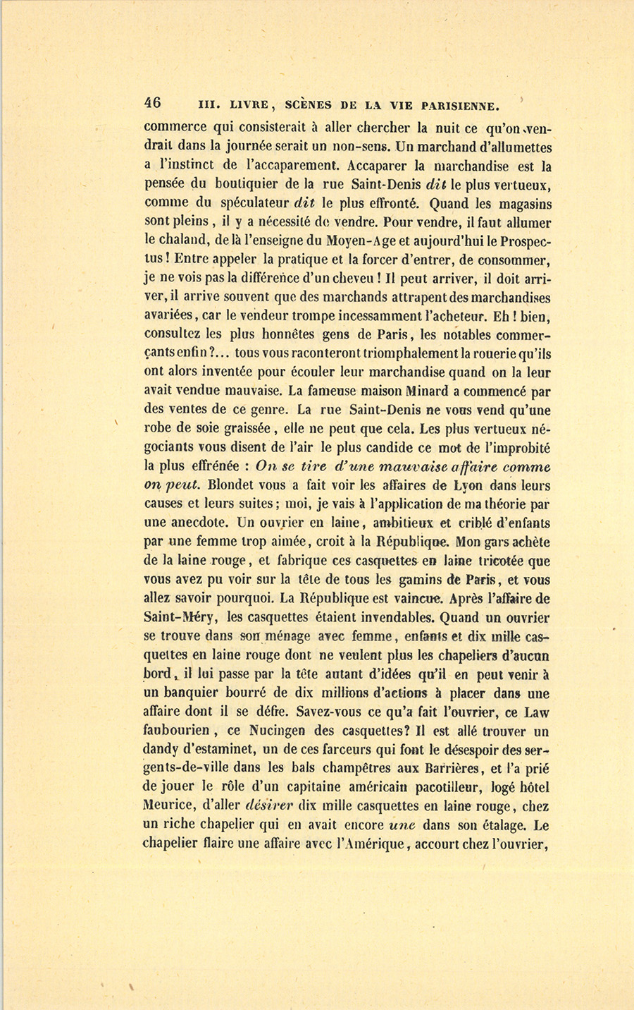 – Si dans la manière dont les affaires se présentent, reprit Couture en se remettant au point où il était avant l’interruption, il y a une teinte de charlatanisme, mot devenu flétrissant et mis à cheval sur le mur mitoyen du juste et de l’injuste, car je demande où commence, où finit le charlatanisme, ce qu’est le charlatanisme ? Faites-moi l’amitié de me dire qui n’est pas charlatan ? Voyons ? un peu de bonne foi, l’ingrédient social le plus rare ! Le {p. 46} commerce qui consisterait à aller chercher la nuit ce qu’on vendrait dans la journée serait un non-sens. Un marchand d’allumettes a l’instinct de l’accaparement. Accaparer la marchandise est la pensée du boutiquier de la rue Saint-Denis dit le plus vertueux, comme du spéculateur dit le plus effronté. Quand les magasins sont pleins, il y a nécessité de vendre. Pour vendre, il faut allumer le chaland, de là l’enseigne du Moyen-Âge et aujourd’hui le Prospectus ! Entre appeler la pratique et la force d’entrer, de consommer, je ne vois pas la différence d’un cheveu ! Il peut arriver, il doit arriver, il arrive souvent que des marchands attrapent des marchandises avariées, car le vendeur trompe incessamment l’acheteur. Eh ! bien, consultez les plus honnêtes gens de Paris, les notables commerçants enfin ?… tous vous raconteront triomphalement la rouerie qu’ils ont alors inventée pour écouler leur marchandise quand on la leur avait vendue mauvaise. La fameuse maison Minard a commencé par des ventes de ce genre. La rue Saint-Denis ne vous vend qu’une robe de soie graissée, elle ne peut que cela. Les plus vertueux négociants vous disent de l’air le plus candide ce mot de l’improbité la plus effrénée : On se tire d’une mauvaise affaire comme on peut. Blondet vous a fait voir les affaires de Lyon dans leurs causes et leurs suites ; moi, je vais à l’application de ma théorie par une anecdote. Un ouvrier en laine, ambitieux et criblé d’enfants par une femme trop aimée, croit à la République. Mon gars achète de la laine rouge, et fabrique ces casquettes en laine tricotée que vous avez pu voir sur la tête de tous les gamins de Paris, et vous allez savoir pourquoi. La République est vaincue. Après l’affaire de Saint-Méry, les casquettes étaient invendables. Quand un ouvrier se trouve dans son ménage avec femme, enfants et dix mille casquettes en laine rouge dont ne veulent plus les chapeliers d’aucun bord, il lui passe par la tête autant d’idées qu’il en peut venir à un banquier bourré de dix millions d’actions à placer dans une affaire dont il se défie. Savez-vous ce qu’a fait l’ouvrier, ce Law faubourien, ce Nucingen des casquettes ? Il est allé trouver un dandy d’estaminet, un de ces farceurs qui font le désespoir des sergents-de-ville dans les bals champêtres aux Barrières, et l’a prié de jouer le rôle d’un capitaine américain pacotilleur, logé hôtel Meurice, d’aller désirer dix mille casquettes en laine rouge, chez un riche chapelier qui en avait encore une dans son étalage. Le chapelier flaire une affaire avec l’Amérique, accourt chez l’ouvrier, {p. 47} et se rue au comptant sur les casquettes. Vous comprenez : plus de capitaine américain, mais beaucoup de casquettes. Attaquer la liberté commerciale à cause de ces inconvénients, ce serait attaquer la Justice sous prétexte qu’il y a des délits qu’elle ne punit pas, ou accuser la Société d’être mal organisée à cause des malheurs qu’elle engendre ! Des casquettes et de la rue Saint-Denis, aux Actions et à la Banque, concluez !