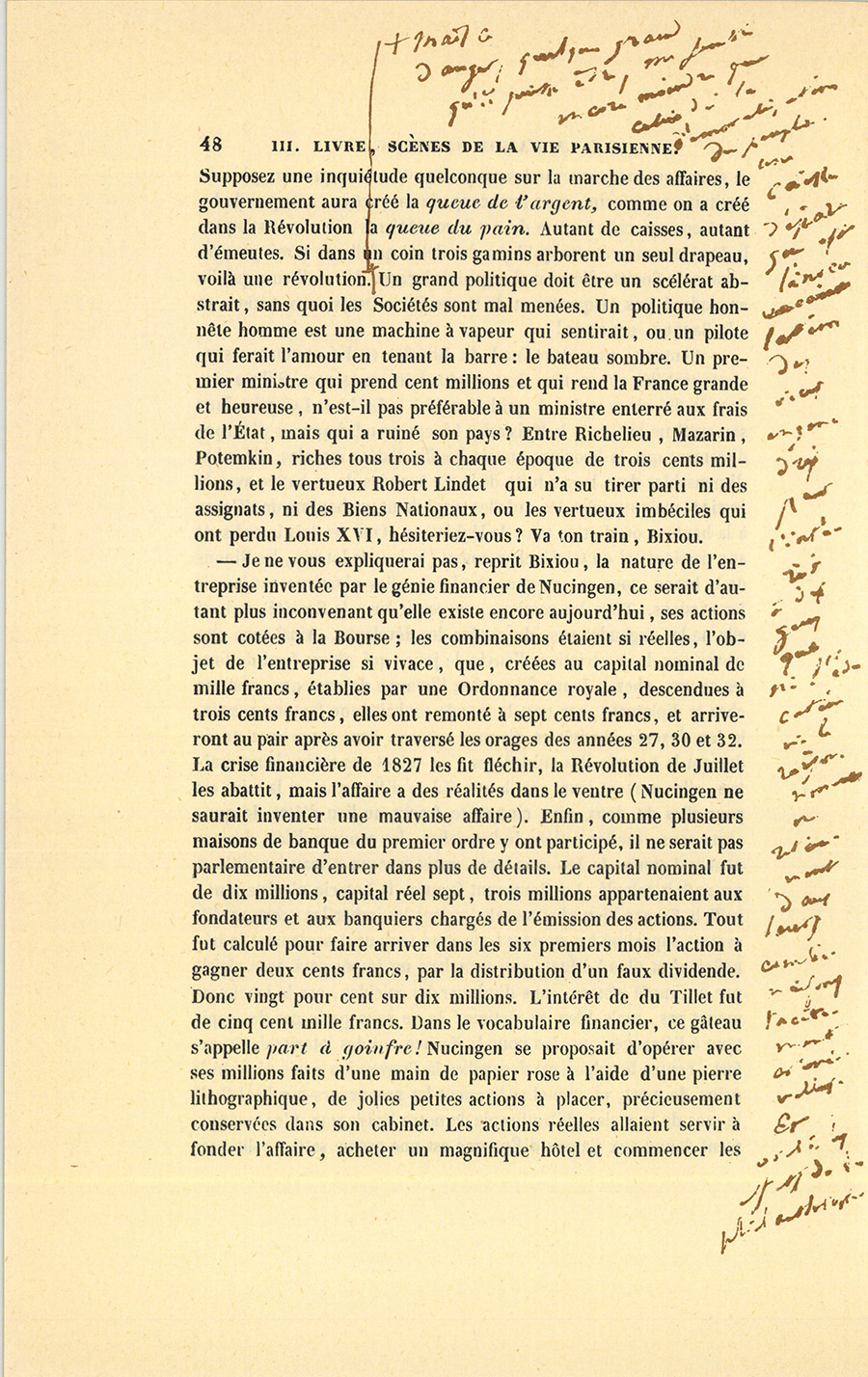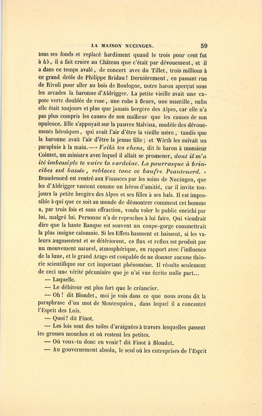 – En petit, dit Blondet, l’affaire peut paraître singulière ; mais en grand, c’est de la haute finance. Il y a des actes arbitraires qui sont criminels d’individu à individu, lesquels arrivent à rien quand ils sont étendus à une multitude quelconque, comme une goutte d’acide prussique devient innocente dans un baquet d’eau. Vous tuez un homme, on vous guillotine. Mais avec une conviction gouvernementale quelconque, vous tuez cinq cents hommes, on respecte le crime politique. Vous prenez cinq mille francs dans mon secrétaire, vous allez au Bagne. Mais avec le piment d’un gain à faire habilement mis dans la gueule de mille boursiers, vous les forcez à prendre les rentes de je ne sais quelle république ou monarchie en faillite, émises, comme dit Couture, pour payer les intérêts de ces mêmes rentes : personne ne peut se plaindre. Voilà les vrais principes de l’âge d’or où nous vivons !