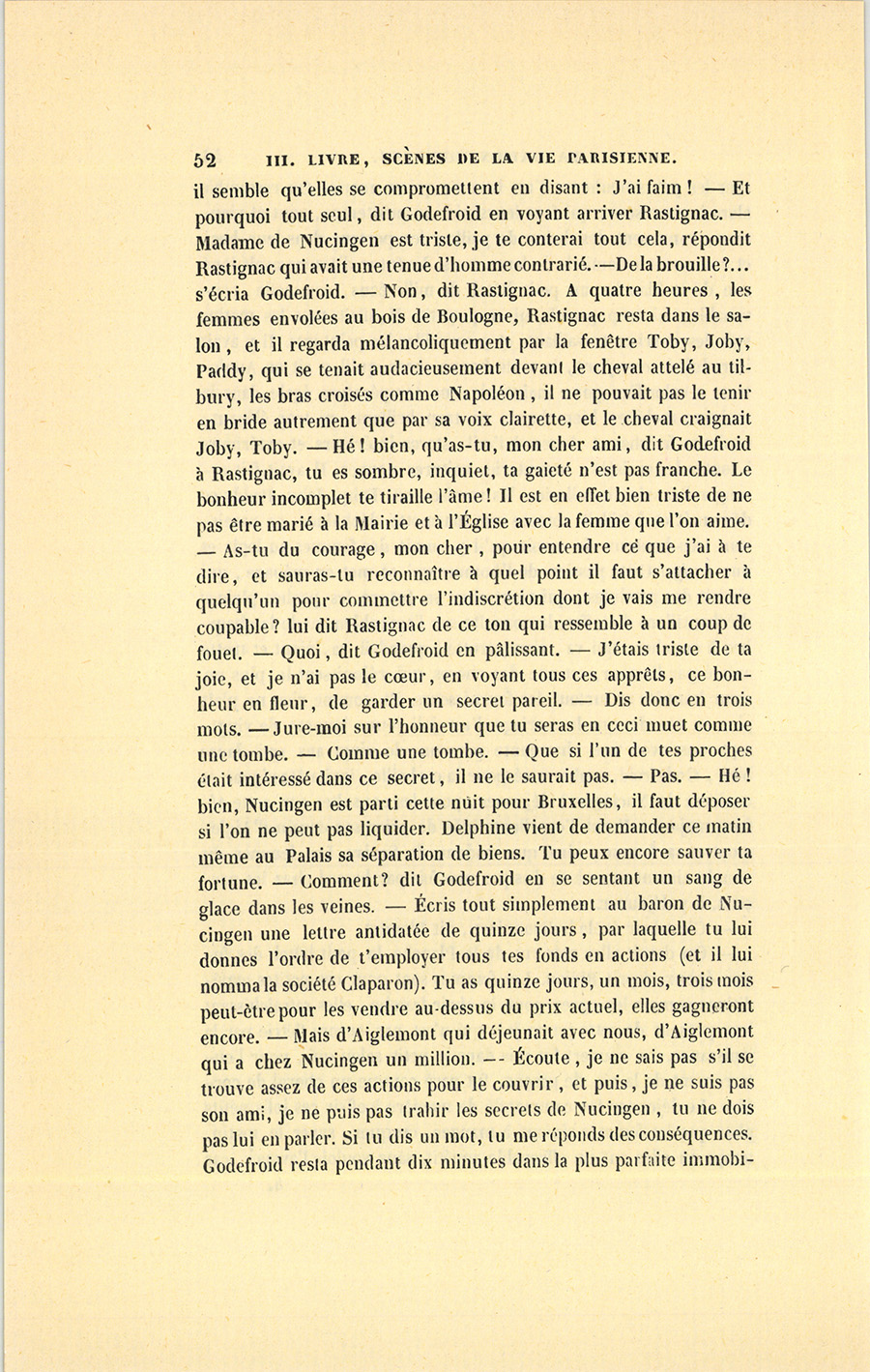 – On devait aller voir rue de la Planche le petit hôtel des futurs époux, reprit Bixiou. Les femmes sont pour ces petites expéditions comme les ogres pour la chair fraîche, elles rafraîchissent leur présent de cette jeune joie qui n’est pas encore flétrie par la jouissance. Le couvert fut mis dans le petit salon qui, pour l’enterrement de la vie de garçon, fut paré comme un cheval de cortége. Le déjeuner fut commandé de manière à offrir ces jolis petits plats que les femmes aiment à manger, croquer, sucer le matin, temps où elles ont un effroyable appétit, sans vouloir l’avouer, car {p. 52} il semble qu’elles se compromettent en disant : J’ai faim ! – Et pourquoi tout seul, dit Godefroid en voyant arriver Rastignac. – Madame de Nucingen est triste, je te conterai tout cela, répondit Rastignac qui avait une tenue d’homme contrarié. – De la brouille ?… s’écria Godefroid. – Non, dit Rastignac. À quatre heures, les femmes envolées au bois de Boulogne, Rastignac resta dans le salon, et il regarda mélancoliquement par la fenêtre Toby, Joby, Paddy, qui se tenait audacieusement devant le cheval attelé au tilbury, les bras croisés comme Napoléon, il ne pouvait pas le tenir en bride autrement que par sa voix clairette, et le cheval craignait Joby, Toby. – Hé ! bien, qu’as-tu, mon cher ami, dit Godefroid à Rastignac, tu es sombre, inquiet, ta gaieté n’est pas franche. Le bonheur incomplet te tiraille l’âme ! Il est en effet bien triste de ne pas être marié à la Mairie et à l’Église avec la femme que l’on aime. – As-tu du courage, mon cher, pour entendre ce que j’ai à te dire, et sauras-tu reconnaître à quel point il faut s’attacher à quelqu’un pour commettre l’indiscrétion dont je vais me rendre coupable ? lui dit Rastignac de ce ton qui ressemble à un coup de fouet. – Quoi, dit Godefroid en pâlissant. – J’étais triste de ta joie, et je n’ai pas le cœur, en voyant tous ces apprêts, ce bonheur en fleur, de garder un secret pareil. – Dis donc en trois mots. – Jure-moi sur l’honneur que tu seras en ceci muet comme une tombe. – Comme une tombe. – Que si l’un de tes proches était intéressé dans ce secret, il ne le saurait pas. – Pas. – Hé ! bien, Nucingen est parti cette nuit pour Bruxelles, il faut déposer si l’on ne peut pas liquider. Delphine vient de demander ce matin même au Palais sa séparation de biens. Tu peux encore sauver ta fortune. – Comment ? dit Godefroid en se sentant un sang de glace dans les veines. – Écris tout simplement au baron de Nucingen une lettre antidatée de quinze jours, par laquelle tu lui donnes l’ordre de t’employer tous tes fonds en actions (et il lui nomma la société Claparon). Tu as quinze jours, un mois, trois mois peut-être pour les vendre au-dessus du prix actuel, elles gagneront encore. – Mais d’Aiglemont qui déjeunait avec nous, d’Aiglemont qui a chez Nucingen un million. – Écoute, je ne sais pas s’il se trouve assez de ces actions pour le couvrir, et puis, je ne suis pas son ami, je ne puis pas trahir les secrets de Nucingen, tu ne dois pas lui en parler. Si tu dis un mot, tu me réponds des conséquences. Godefroid resta pendant dix minutes dans la plus parfaite {p. 53} immobilité. – Acceptes-tu, oui ou non, lui dit impitoyablement Rastignac. Godefroid prit une plume et de l’encre, il écrivit et signa la lettre que lui dicta Rastignac. – Mon pauvre cousin ! s’écria-t-il. – Chacun pour soi, dit Rastignac. Et d’un de chambré ! ajouta-t-il en quittant Godefroid. Pendant que Rastignac manœuvrait dans Paris, voilà quel aspect présentait la Bourse. J’ai un ami de province, une bête qui me demandait en passant à la Bourse, entre quatre et cinq heures, pourquoi ce rassemblement de causeurs qui vont et viennent, ce qu’ils peuvent se dire, et pourquoi se promener après l’irrévocable fixation du cours des Effets publics. – « Mon ami, lui dis-je, ils ont mangé, ils digèrent ; pendant la digestion, ils font des cancans sur le voisin, sans cela pas de sécurité commerciale à Paris. Là se lancent les affaires, et il y a tel homme, Palma, par exemple, dont l’autorité est semblable à celle de Sinard à l’Académie royale des Sciences. Il dit que la spéculation se fasse, et la spéculation est faite ! »