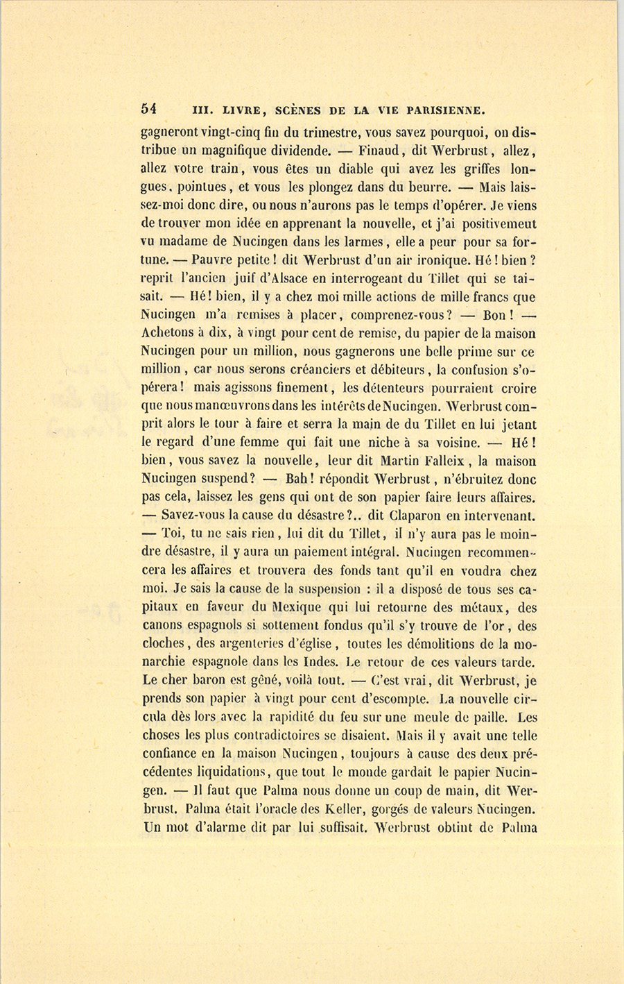 – La mise en scène d’une machine si vaste, reprit Bixiou, exigeait bien des polichinelles. D’abord la maison Nucingen avait sciemment et à dessein employé ses cinq millions dans une affaire en Amérique, dont les profits avaient été calculés de manière à revenir trop tard. Elle s’était dégarnie avec préméditation. Toute {p. 41} liquidation doit être motivée. La maison possédait en fonds particuliers et en valeurs émises environ six millions. Parmi les fonds particuliers se trouvaient les trois cent mille de la baronne d’Aldrigger, les quatre cent mille de Beaudenord, un million à d’Aiglemont, trois cent mille à Matifat, un demi-million à Charles Grandet, le mari de mademoiselle d’Aubrion, etc. En créant lui-même une entreprise industrielle par actions, avec lesquelles il se proposait de désintéresser ses créanciers au moyen de manœuvres plus ou moins habiles, Nucingen aurait pu être suspecté, mais il s’y prit avec plus de finesse : il fit créer par un autre !… cette machine destinée à jouer le rôle du Mississipi du système de Law. Le propre de Nucingen est de faire servir les plus habiles gens de la place à ses projets, sans les leur communiquer. Nucingen laissa donc échapper devant du Tillet l’idée pyramidale et victorieuse de combiner une entreprise par actions en constituant un capital assez fort pour pouvoir servir de très-gros intérêts aux actionnaires pendant les premiers temps. Essayée pour la première fois, en un moment où des capitaux niais abondaient, cette combinaison devait produire une hausse sur les actions, et par conséquent un bénéfice pour le banquier qui les émettrait. Songez que ceci est du 1826. Quoique frappé de cette idée, aussi féconde qu’ingénieuse, du Tillet pensa naturellement que si l’entreprise ne réussissait pas, il y aurait un blâme quelconque. Aussi suggéra-t-il de mettre en avant un directeur visible de cette machine commerciale. Vous connaissez aujourd’hui le secret de la maison Claparon fondée par du Tillet, une de ses plus belles inventions !…