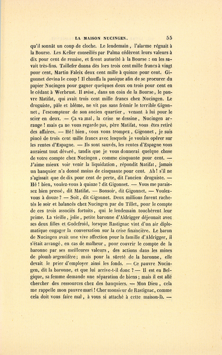 – Vous comprenez, dit Bixiou, que Nucingen avait savamment et d’une main habile, lancé sous les colonnes de la Bourse un petit obus qui éclata sur les quatre heures. – Savez-vous une nouvelle grave, dit du Tillet à Werbrust en l’attirant dans un coin, Nucingen est à Bruxelles, sa femme a présenté au Tribunal une demande en séparation de biens. – Êtes-vous son compère pour une liquidation ? dit Werbrust en souriant. – Pas de bêtises, Werbrust, dit du Tillet, vous connaissez les gens qui ont de son papier, écoutez-moi, nous avons une affaire à combiner. Les actions de notre nouvelle société gagnent vingt pour cent, elles {p. 54} gagneront vingt-cinq fin du trimestre, vous savez pourquoi, on distribue un magnifique dividende. – Finaud, dit Werbrust, allez, allez votre train, vous êtes un diable qui avez les griffes longues, pointues, et vous les plongez dans du beurre. – Mais laissez-moi donc dire, ou nous n’aurons pas le temps d’opérer. Je viens de trouver mon idée en apprenant la nouvelle, et j’ai positivement vu madame de Nucingen dans les larmes, elle a peur pour sa fortune. – Pauvre petite ! dit Werbrust d’un air ironique. Hé ! bien ? reprit l’ancien juif d’Alsace en interrogeant du Tillet qui se taisait. – Hé ! bien, il y a chez moi mille actions de mille francs que Nucingen m’a remises à placer, comprenez-vous ? – Bon ! – Achetons à dix, à vingt pour cent de remise, du papier de la maison Nucingen pour un million, nous gagnerons une belle prime sur ce million, car nous serons créanciers et débiteurs, la confusion s’opérera ! mais agissons finement, les détenteurs pourraient croire que nous manœuvrons dans les intérêts de Nucingen. Werbrust comprit alors le tour à faire et serra la main de du Tillet en lui jetant le regard d’une femme qui fait une niche à sa voisine. – Hé ! bien, vous savez la nouvelle, leur dit Martin Falleix, la maison Nucingen suspend ? – Bah ! répondit Werbrust, n’ébruitez donc pas cela, laissez les gens qui ont de son papier faire leurs affaires. – Savez-vous la cause du désastre ?… dit Claparon en intervenant. – Toi, tu ne sais rien, lui dit du Tillet, il n’y aura pas le moindre désastre, il y aura un paiement intégral. Nucingen recommencera les affaires et trouvera des fonds tant qu’il en voudra chez moi. Je sais la cause de la suspension : il a disposé de tous ses capitaux en faveur du Mexique qui lui retourne des métaux, des canons espagnols si sottement fondus qu’il s’y trouve de l’or, des cloches, des argenteries d’église, toutes les démolitions de la monarchie espagnole dans les Indes. Le retour de ces valeurs tarde. Le cher baron est gêné, voilà tout. – C’est vrai, dit Werbrust, je prends son papier à vingt pour cent d’escompte. La nouvelle circula dès lors avec la rapidité du feu sur une meule de paille. Les choses les plus contradictoires se disaient. Mais il y avait une telle confiance en la maison Nucingen, toujours à cause des deux précédentes liquidations, que tout le monde gardait le papier Nucingen. – Il faut que Palma nous donne un coup de main, dit Werbrust. Palma était l’oracle des Keller, gorgés de valeurs Nucingen. Un mot d’alarme dit par lui suffisait. Werbrust obtint de Palma {p. 55} qu’il sonnât un coup de cloche. Le lendemain, l’alarme régnait à la Bourse. Les Keller conseillés par Palma cédèrent leurs valeurs à dix pour cent de remise, et firent autorité à la Bourse : on les savait très-fins. Taillefer donna dès lors trois cent mille francs à vingt pour cent, Martin Faleix deux cent mille à quinze pour cent. Gigonnet devina le coup ! Il chauffa la panique afin de se procurer du papier Nucingen pour gagner quelques deux ou trois pour cent en le cédant à Werbrust. Il avisa11, dans un coin de la Bourse, le pauvre Matifat, qui avait trois cent mille francs chez Nucingen. Le droguiste, pâle et blême, ne vit pas sans frémir le terrible Gigonnet, l’escompteur de son ancien quartier, venant à lui pour le scier en deux. – Ça va mal, la crise se dessine, Nucingen arrange ! mais ça ne vous regarde pas, père Matifat, vous êtes retiré des affaires. – Hé ! bien, vous vous trompez, Gigonnet, je suis pincé de trois cent mille francs avec lesquels je voulais opérer sur les rentes d’Espagne. – Ils sont sauvés, les rentes d’Espagne vous auraient tout dévoré, tandis que je vous donnerai quelque chose de votre compte chez Nucingen, comme cinquante pour cent. – J’aime mieux voir venir la liquidation, répondit Matifat, jamais un banquier n’a donné moins de cinquante pour cent. Ah ! s’il ne s’agissait que de dix pour cent de perte, dit l’ancien droguiste. – Hé ! bien, voulez-vous à quinze ? dit Gigonnet. – Vous me paraissez bien pressé, dit Matifat. – Bonsoir, dit Gigonnet. – Voulez-vous à douze ? – Soit, dit Gigonnet. Deux millions furent rachetés le soir et balancés chez Nucingen par du Tillet, pour le compte de ces trois associés fortuits, qui le lendemain touchèrent leur prime. La vieille, jolie, petite baronne d’Aldrigger déjeunait avec ses deux filles et Godefroid, lorsque Rastignac vint d’un air diplomatique engager la conversation sur la crise financière. Le baron de Nucingen avait une vive affection pour la famille d’Aldrigger, il s’était arrangé, en cas de malheur, pour couvrir le compte de la baronne par ses meilleures valeurs, des actions dans les mines de plomb argentifère ; mais pour la sûreté de la baronne, elle devait le prier d’employer ainsi les fonds. – Ce pauvre Nucingen, dit la baronne, et que lui arrive-t-il donc ? – Il est en Belgique, sa femme demande une séparation de biens ; mais il est allé chercher des ressources chez des banquiers. – Mon Dieu, cela me rappelle mon pauvre mari ! Cher monsieur de Rastignac, comme cela doit vous faire mal, à vous si attaché à cette maison-là. {p. 56} – Pourvu que tous