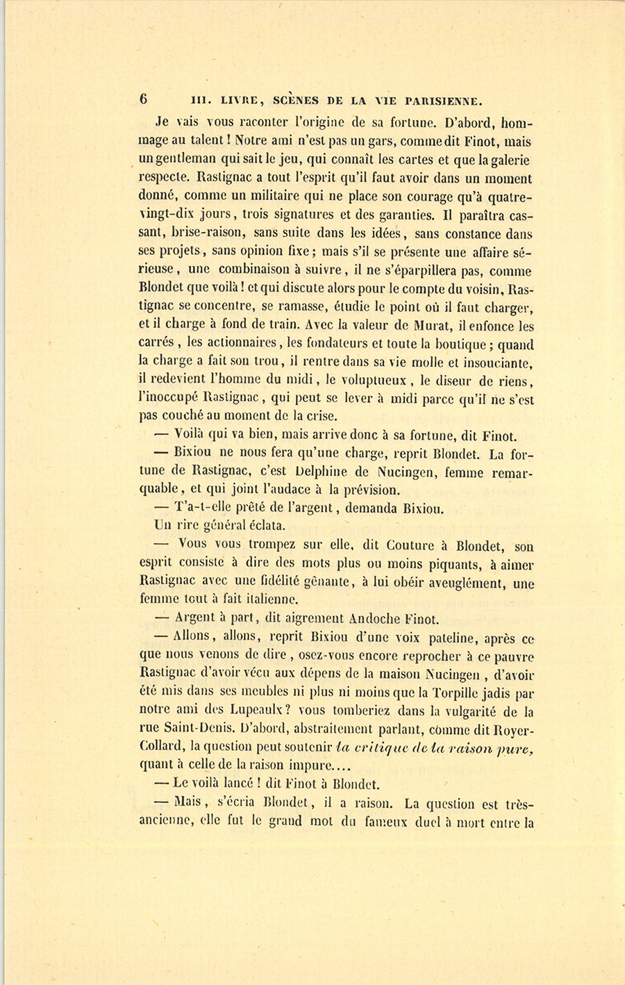 – Allons, allons, reprit Bixiou d’une voix pateline, après ce que nous venons de dire, osez-vous encore reprocher à ce pauvre Rastignac d’avoir vécu aux dépens de la maison Nucingen, d’avoir été mis dans ses meubles ni plus ni moins que la Torpille jadis par notre ami des Lupeaulx ? vous tomberiez dans la vulgarité de la rue Saint-Denis. D’abord, abstraitement parlant, comme dit Royer-Collard, la question peut soutenir la critique de la raison pure, quant à celle de la raison impure…