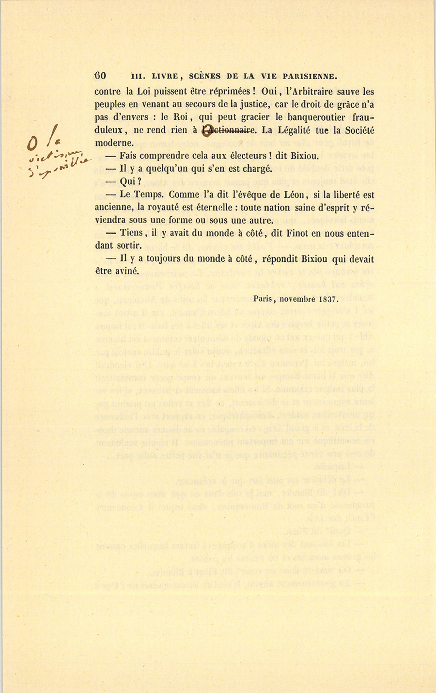– Couture, une couronne ! dit Blondet en lui mettant sa serviette tortillée sur sa tête. Je vais plus loin, messieurs. S’il y a vice dans la théorie actuelle, à qui la faute ? à la Loi ! à la Loi prise dans son système entier, à la législation ! à ces grands hommes d’Arrondissement que la Province envoie bouffis d’idées morales, idées indispensables dans la conduite de la vie à moins de se battre avec la justice, mais stupides dès qu’elles empêchent un homme de s’élever à la hauteur où doit se tenir le législateur. Que les lois interdisent aux passions tel ou tel développement (le jeu, la loterie, les Ninons de la borne, tout ce que vous voudrez), elles n’extirperont jamais les passions. Tuer les passions, ce serait tuer la Société, qui, si elle ne les engendre pas, du moins les développe. Ainsi vous entravez par des restrictions l’envie de jouer qui gît au fond de tous les cœurs, chez la jeune fille, chez l’homme de province, comme chez le diplomate, car tout le monde souhaite une fortune gratis, le Jeu s’exerce aussitôt en d’autres sphères. Vous supprimez stupidement la Loterie, les cuisinières n’en volent pas moins leurs maîtres, elles portent leurs vols à une Caisse d’Épargne, et la mise est pour elles de deux cent cinquante francs au lieu d’être de quarante sous, car les actions industrielles, les commandites, deviennent la Loterie, le Jeu sans tapis, mais avec un râteau invisible et un refait calculé. Les Jeux sont fermés, la Loterie n’existe plus, voilà la France bien plus morale, crient les imbéciles, comme s’ils avaient supprimé les pontes ! On joue toujours ! seulement le bénéfice n’est plus à l’État, qui remplace un impôt payé avec plaisir par un impôt gênant, sans diminuer les suicides, car le joueur ne meurt pas, mais bien sa victime ! Je ne vous parle pas des capitaux à l’étranger, perdus pour la France, ni des loteries de Francfort, contre le colportage desquelles la Convention avait décerné la peine de mort, et auquel se livraient les procureurs-syndics ! Voilà le sens de la niaise philanthropie de notre législateur. L’encouragement donné aux Caisses d’Épargne est une grosse sottise politique. {p. 48} Supposez une inquiétude quelconque sur la marche des affaires, le gouvernement aura créé la queue de l’argent, comme on a créé dans la Révolution la queue du pain. Autant de caisses, autant d’émeutes. Si dans un coin trois gamins arborent un seul drapeau, voilà une révolution. Mais ce danger, quelque grand qu’il puisse être, me semble encore moindre que celui de la démoralisation du peuple. Une caisse d’épargne est l’inoculation des vices engendrés par l’intérêt à des gens que ni l’éducation ni le raisonnement ne retiennent dans leurs combinaisons tacitement criminelles. Et voilà les effets de la philanthropie. Un grand politique doit être un scélérat abstrait, sans quoi les Sociétés sont mal menées. Un politique honnête homme est une machine à vapeur qui sentirait, ou un pilote qui ferait l’amour en tenant la barre : le bateau sombre. Un premier ministre qui prend cent millions et qui rend la France grande et heureuse, n’est-il pas préférable à un ministre enterré aux frais de l’État, mais qui a ruiné son pays ? Entre Richelieu, Mazarin, Potemkin, riches tous trois à chaque époque de trois cents millions, et le vertueux Robert Lindet qui n’a su tirer parti ni des assignats, ni des Biens Nationaux, ou les vertueux imbéciles qui ont perdu Louis XVI, hésiteriez-vous ? Va ton train, Bixiou.