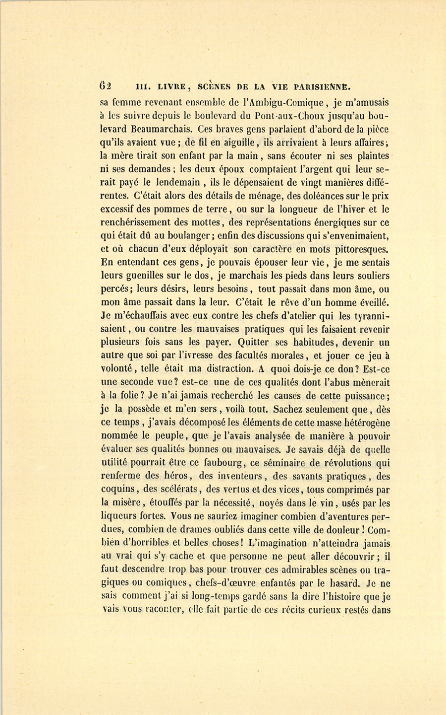 Lorsque, entre onze heures et minuit, je rencontrais un ouvrier {p. 62} et sa femme revenant ensemble de l’Ambigu-Comique, je m’amusais à les suivre depuis le boulevard du Pont-aux-Choux jusqu’au boulevard Beaumarchais. Ces braves gens parlaient d’abord de la pièce qu’ils avaient vue ; de fil en aiguille, ils arrivaient à leurs affaires ; la mère tirait son enfant par la main, sans écouter ni ses plaintes ni ses demandes ; les deux époux comptaient l’argent qui leur serait payé le lendemain, ils le dépensaient de vingt manières différentes. C’était alors des détails de ménage, des doléances sur le prix excessif des pommes de terre, ou sur la longueur de l’hiver et le renchérissement des mottes, des représentations énergiques sur ce qui était dû au boulanger ; enfin des discussions qui s’envenimaient, et où chacun d’eux déployait son caractère en mots pittoresques. En entendant ces gens, je pouvais épouser leur vie, je me sentais leurs guenilles sur le dos, je marchais les pieds dans leurs souliers percés ; leurs désirs, leurs besoins, tout passait dans mon âme, ou mon âme passait dans la leur. C’était le rêve d’un homme éveillé. Je m’échauffais avec eux contre les chefs d’atelier qui les tyrannisaient, ou contre les mauvaises pratiques qui les faisaient revenir plusieurs fois sans les payer. Quitter ses habitudes, devenir un autre que soi par l’ivresse des facultés morales, et jouer ce jeu à volonté, telle était ma distraction. À quoi dois-je ce don ? Est-ce une seconde vue ? est-ce une de ces qualités dont l’abus mènerait à la folie ? Je n’ai jamais recherché les causes de cette puissance ; je la possède et m’en sers, voilà tout. Sachez seulement que, dès ce temps, j’avais décomposé les éléments de cette masse hétérogène nommée le peuple, que je l’avais analysée de manière à pouvoir évaluer ses qualités bonnes ou mauvaises. Je savais déjà de quelle utilité pourrait être ce faubourg, ce séminaire de révolutions qui renferme des héros, des inventeurs, des savants pratiques, des coquins, des scélérats, des vertus et des vices, tous comprimés par la misère, étouffés par la nécessité, noyés dans le vin, usés par les liqueurs fortes. Vous ne sauriez imaginer combien d’aventures perdues, combien de drames oubliés dans cette ville de douleur ! Combien d’horribles et belles choses ! L’imagination n’atteindra jamais au vrai qui s’y cache et que personne ne peut aller découvrir ; il faut descendre trop bas pour trouver ces admirables scènes ou tragiques ou comiques, chefs-d’œuvre enfantés par le hasard. Je ne sais comment j’ai si long-temps gardé sans la dire l’histoire que je vais vous raconter, elle fait partie de ces récits curieux restés dans {p. 63} le sac d’où la mémoire les tire capricieusement comme des numéros de loterie : j’en ai bien d’autres, aussi singuliers que celui-ci, également enfouis ; mais ils auront leur tour, croyez-le.