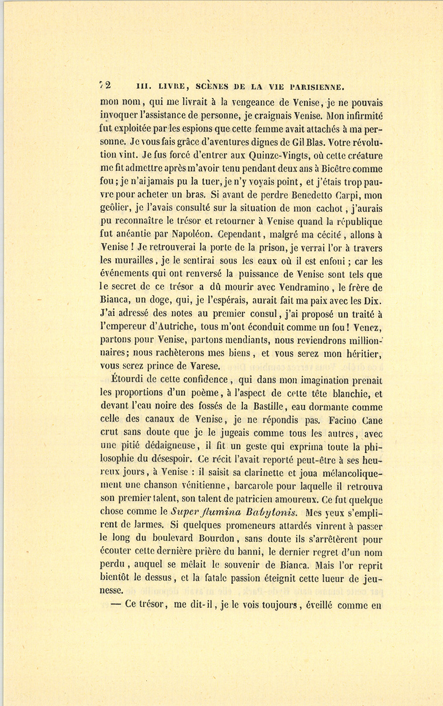 Quand nous fûmes dans la rue, il me dit : – Voulez-vous me mener à Venise, m’y conduire, voulez-vous avoir foi en moi ? vous serez plus riche que ne le sont les dix maisons les plus riches d’Amsterdam ou de Londres, plus riches que les Rotschild, enfin riche comme les Mille et une Nuits.
