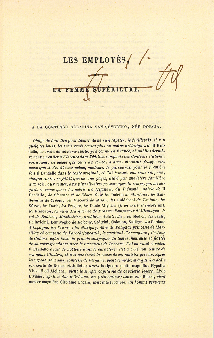 Obligé de tout lire pour tâcher de ne rien répéter, je feuilletais, il y a quelques jours, les trois cents contes plus ou moins drolatiques de Il Bandello, écrivain du seizième siècle, peu connu en France, et publiés dernièrement en entier à Florence dans l’édition compacte des Conteurs italiens : votre nom, de même que celui du comte, a aussi vivement frappé mes yeux que si c’était vous-même, madame. Je parcourais pour la première fois Il Bandello dans le texte original, et j’ai trouvé, non sans surprise, chaque conte, ne fût-il que de cinq pages, dédié par une lettre familière aux rois, aux reines, aux plus illustres personnages du temps, parmi lesquels se remarquent les nobles du Milanais, du Piémont, patrie de Il Bandello, de Florence et de Gênes. C’est les Dolcini de Mantoue, les San-Severini de Créma, les Visconti de Milan, les Guidoboni de Tortone, les Sforza, les Doria, les Frégose, les Dante Alighieri (il en existait encore un), les Frascator, la reine Marguerite de France, l’empereur d’Allemagne, le roi de Bohême, Maximilien, archiduc d’Autriche, les Medici, les Sauli, Pallavicini, Bentivoglio de Bologne, Soderini, Colonna, Scaliger, les Cardone d’Espagne. En France : les Marigny, Anne de Polignac princesse de Marsillac et comtesse de Larochefoucault, le cardinal d’Armagnac, l’évêque de Cahors, enfin toute la grande compagnie du temps, heureuse et flattée de sa correspondance avec le successeur de Boccace. J’ai vu aussi combien Il Bandello avait de noblesse dans le caractère : s’il a orné son œuvre de ces noms illustres, il n’a pas trahi la cause de ses amitiés privées. Après la signora Gallerana, comtesse de Bergame, vient le médecin à qui il a dédié son conte de Roméo et Juliette ; après la signora molto magnifica Hypolita Visconti ed Atellana, vient le simple capitaine de cavalerie légère, Livio Liviano ; après le duc d’Orléans, un prédicateur ; après une Riario, vient messer magnifico Girolamo Ungaro, mercante lucchese, un homme vertueux {p. 134} auquel il raconte comment un gentiluomo navarese sposa una che era sua sorella et figliuola, non lo sapendo, sujet qui lui avait été envoyé par la reine de Navarre. J’ai pensé que je pouvais, comme Il Bandello, mettre un de mes récits sous la protection d’una virtuosa, gentilissima, illustrissima contessa Serafina San-Severina, et lui adresser des vérités que l’on prendra pour des flatteries. Pourquoi ne pas avouer combien je suis fier d’attester ici et ailleurs, qu’aujourd’hui, comme au seizième siècle, les écrivains, à quelque étage que les mette pour un moment la mode, sont consolés des calomnies, des injures, des critiques amères, par de belles et nobles amitiés dont les suffrages aident à vaincre les ennuis de la vie littéraire. Paris, cette cervelle du monde, vous a tant plu par l’agitation continuelle de ses esprits, il a été si bien compris par la délicatesse vénitienne de votre intelligence ; vous avez tant aimé ce riche salon de Gérard que nous avons perdu, et où se voyaient, comme dans l’œuvre de Il Bandello, les illustrations européennes de ce quart de siècle ; puis les fêtes brillantes, les inaugurations enchantées que fait cette grande et dangereuse syrène, vous ont tant émerveillée, vous avez si naïvement dit vos impressions, que vous prendrez sans doute sous votre protection la peinture d’un monde que vous n’avez pas dû connaître, mais qui ne manque pas d’originalité. J’aurais voulu avoir quelque belle poésie à vous offrir, à vous qui avez autant de poésie dans l’âme et au cœur que votre personne en exprime ; mais si un pauvre prosateur ne peut donner que ce qu’il a, peut-être rachètera-t-il à vos yeux la modicité du présent par les hommages respectueux d’une de ces profondes et sincères admirations que vous inspirez.