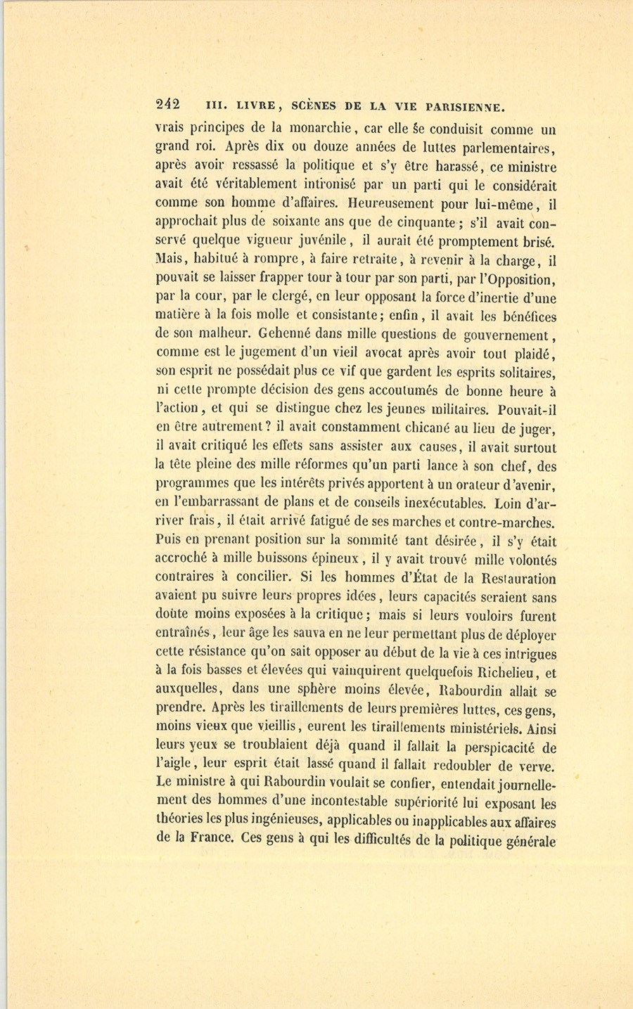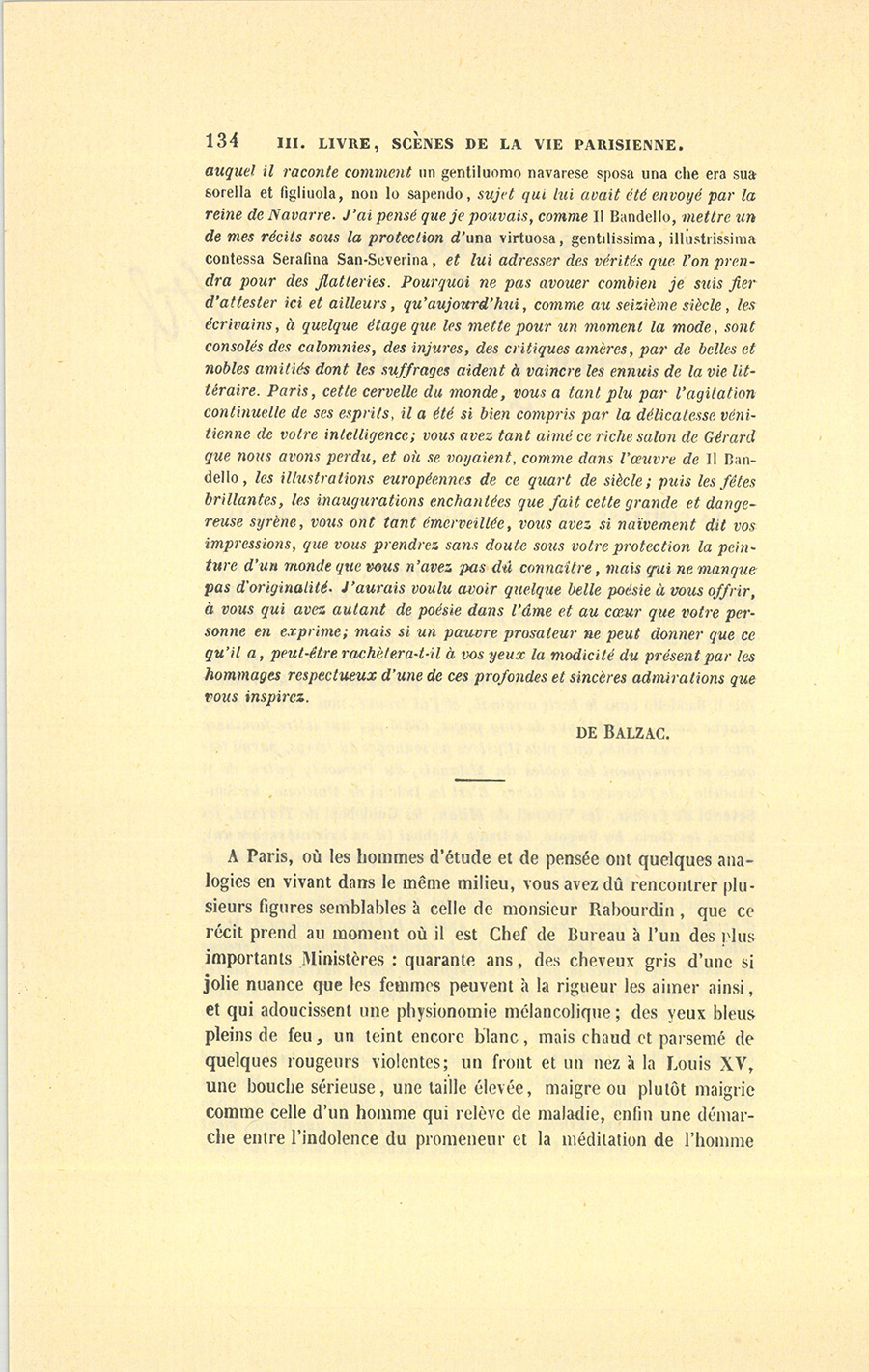 À Paris, où les hommes d’étude et de pensée ont quelques analogies en vivant dans le même milieu, vous avez dû rencontrer plusieurs figures semblables à celle de monsieur Rabourdin, que ce récit prend au moment où il est Chef de Bureau à l’un des plus importants Ministères : quarante ans, des cheveux gris d’une si jolie nuance que les femmes peuvent à la rigueur les aimer ainsi, et qui adoucissent une physionomie mélancolique ; des yeux bleus pleins de feu, un teint encore blanc, mais chaud et parsemé de quelques rougeurs violentes ; un front et un nez à la Louis XV, une bouche sérieuse, une taille élevée, maigre ou plutôt maigrie comme celle d’un homme qui relève de maladie, enfin une démarche entre l’indolence du promeneur et la méditation de l’homme {p. 135} occupé. Si ce portrait fait préjuger un caractère, la mise de l’homme contribuait peut-être à le mettre en relief. Rabourdin portait habituellement une grande redingote bleue, une cravate blanche, un gilet croisé à la Roberspierre, un pantalon noir sans sous-pieds, des bas de soie gris et des souliers découverts. Rasé, lesté de sa tasse de café dès huit heures du matin, il sortait avec une exactitude d’horloge, et passait par les mêmes rues en se rendant au Ministère ; mais si propre, si compassé que vous l’eussiez pris pour un Anglais allant à son ambassade. À ces traits principaux, vous devinez le père de famille harassé par des contrariétés au sein du ménage, tourmenté par des ennuis au Ministère, mais assez philosophe pour prendre la vie comme elle est ; un honnête homme aimant son pays et le servant, sans se dissimuler les obstacles que l’on rencontre à vouloir le bien ; prudent parce qu’il connaît les hommes, d’une exquise politesse avec les femmes parce qu’il n’en attend rien ; enfin, un homme plein d’acquis, affable avec ses inférieurs, tenant à une grande distance ses égaux, et d’une haute dignité avec ses chefs. À l’époque où le prend cette Étude, vous eussiez remarqué chez lui l’air froidement résigné de l’homme qui avait enterré les illusions de la jeunesse, qui avait renoncé à de secrètes ambitions ; vous eussiez reconnu l’homme découragé mais encore sans dégoût et qui persiste dans ses premiers projets, plus pour employer ses facultés que dans l’espoir d’un douteux triomphe. Il n’était décoré d’aucun ordre, et s’accusait comme d’une faiblesse d’avoir porté celui du Lys aux premiers jours de la Restauration.