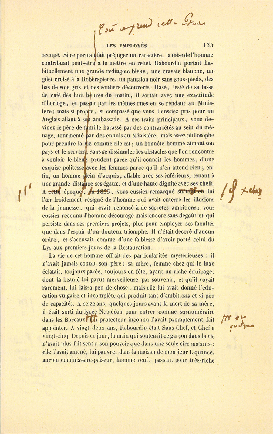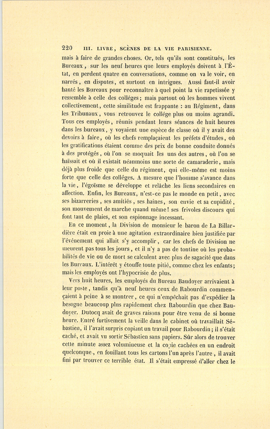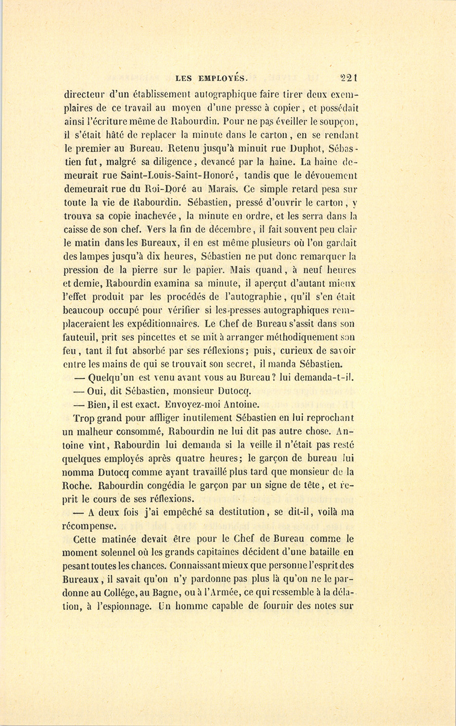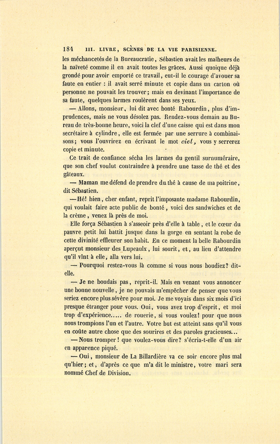 En ce moment Rabourdin grondait ce pauvre petit Sébastien, le seul qui fût dans la confidence entière de ses immenses travaux. Le surnuméraire copiait et recopiait le fameux mémoire {p. 183} composé de cent cinquante feuillets de grand papier Tellière, outre les tableaux à l’appui, les résumés qui tenaient sur une simple feuille, les calculs avec accolades, titres à l’anglaise et sous-titres en ronde. Animé par sa participation mécanique à cette grande idée, l’enfant de vingt ans refaisait un tableau pour un simple grattage, il mettait sa gloire à peindre les écritures, éléments d’une si noble entreprise. Sébastien avait commis l’imprudence d’emporter au bureau la minute du travail le plus dangereux, afin d’en achever la copie. C’était un État général des employés des administrations centrales de tous les ministères à Paris, avec des indications sur leur fortune présente et à venir, et sur leurs entreprises personnelles en dehors de leur emploi.