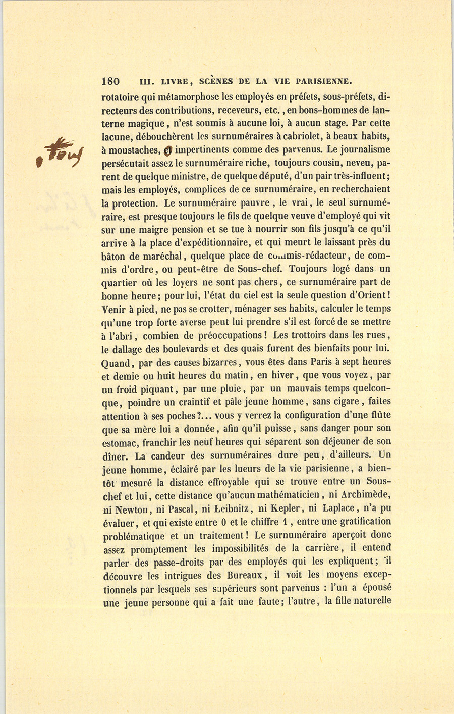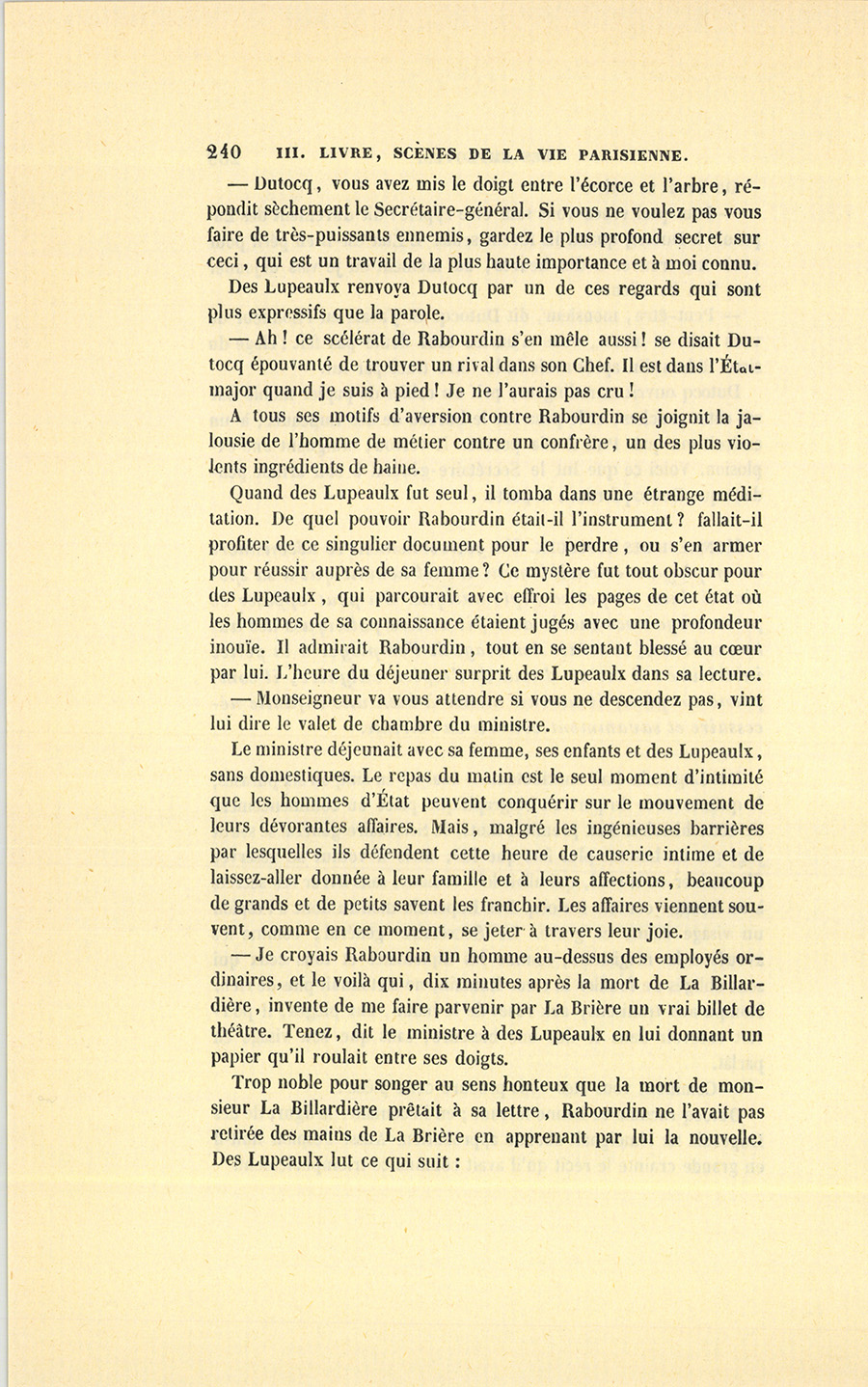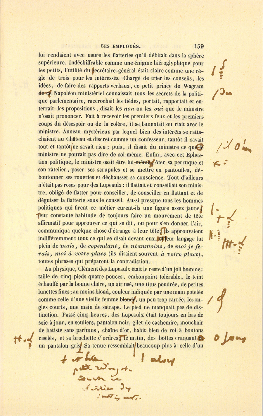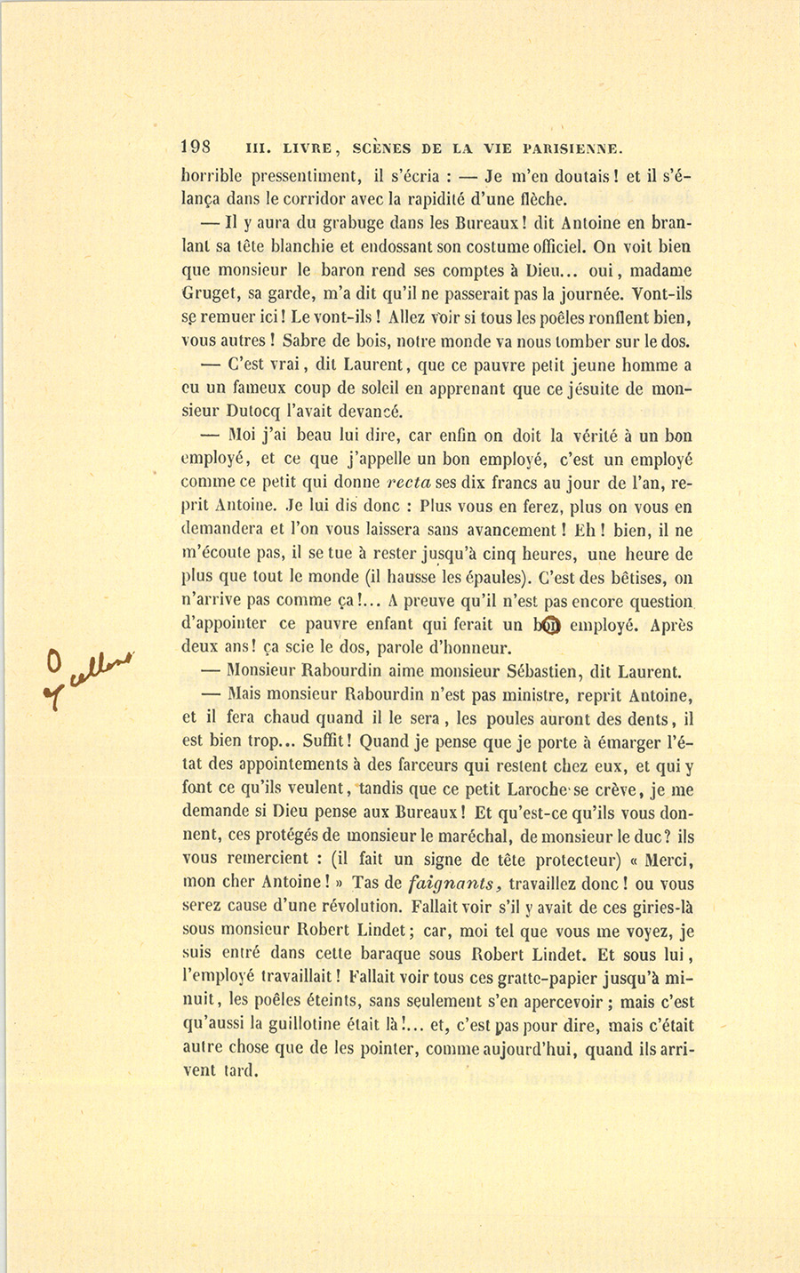 En ce moment Rabourdin grondait ce pauvre petit Sébastien, le seul qui fût dans la confidence entière de ses immenses travaux. Le surnuméraire copiait et recopiait le fameux mémoire {p. 183} composé de cent cinquante feuillets de grand papier Tellière, outre les tableaux à l’appui, les résumés qui tenaient sur une simple feuille, les calculs avec accolades, titres à l’anglaise et sous-titres en ronde. Animé par sa participation mécanique à cette grande idée, l’enfant de vingt ans refaisait un tableau pour un simple grattage, il mettait sa gloire à peindre les écritures, éléments d’une si noble entreprise. Sébastien avait commis l’imprudence d’emporter au bureau la minute du travail le plus dangereux, afin d’en achever la copie. C’était un État général des employés des administrations centrales de tous les ministères à Paris, avec des indications sur leur fortune présente et à venir, et sur leurs entreprises personnelles en dehors de leur emploi.
