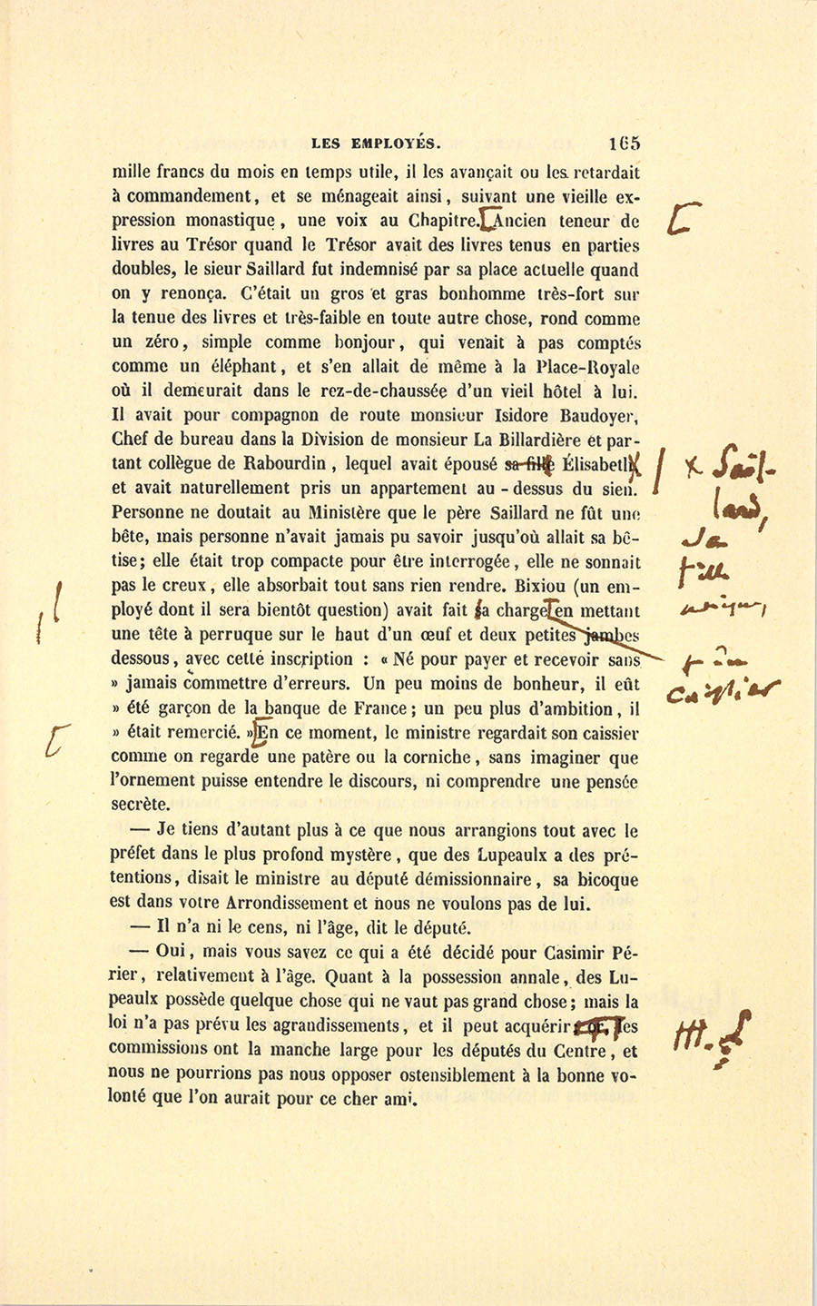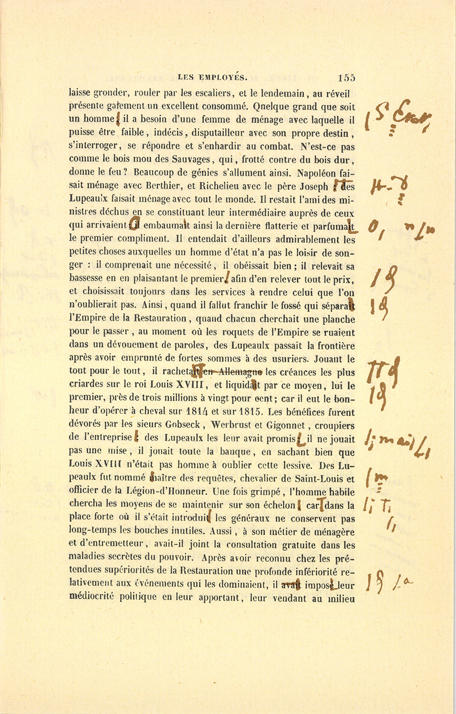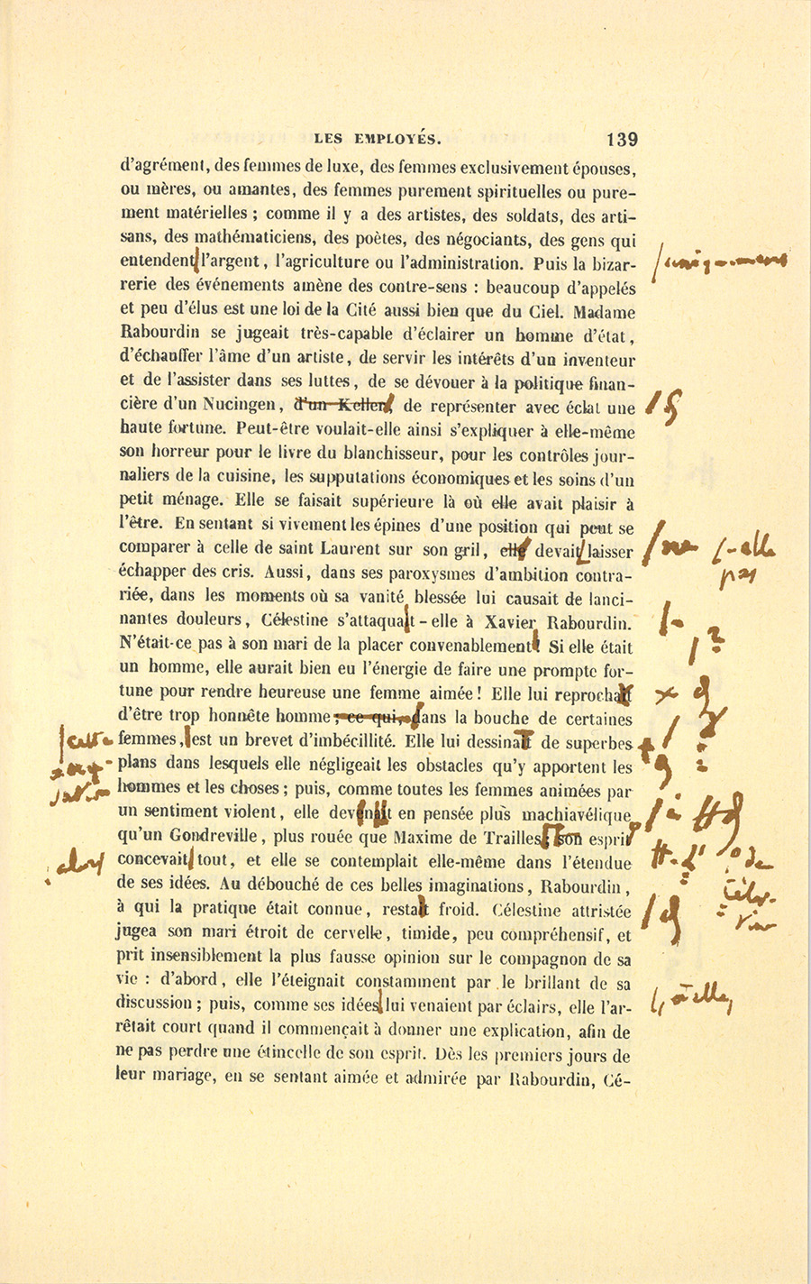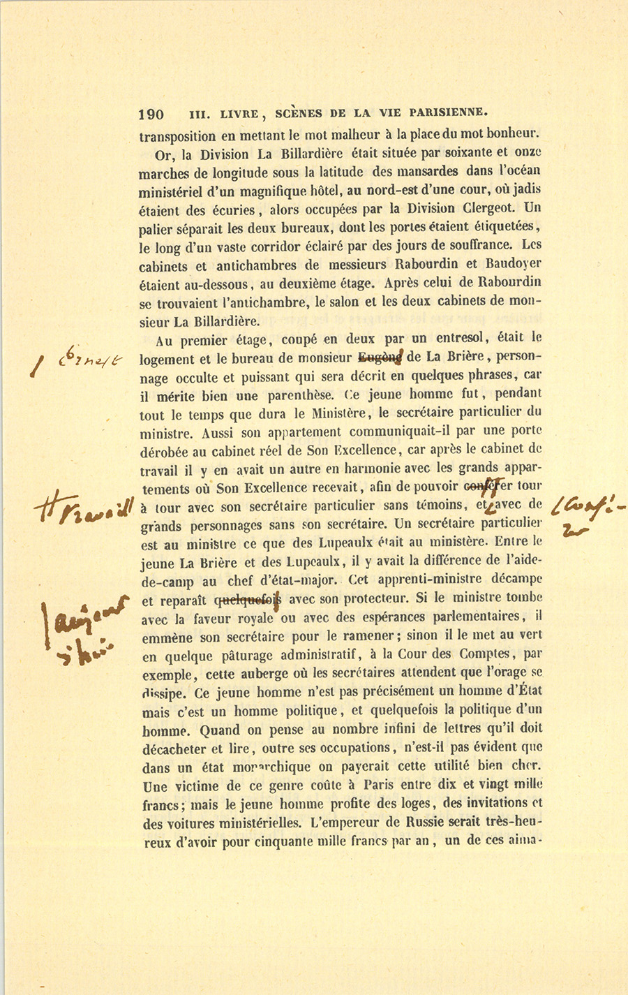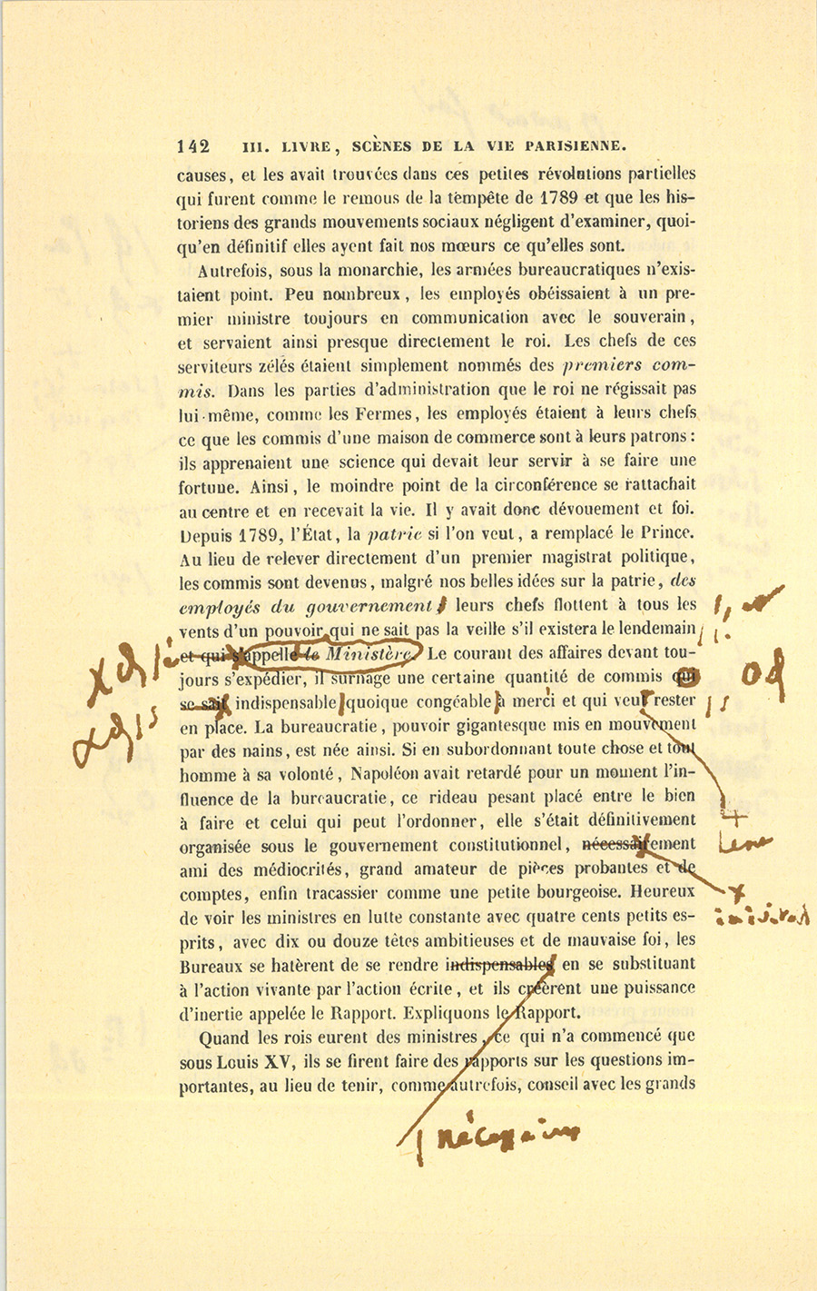 En ce moment Rabourdin grondait ce pauvre petit Sébastien, le seul qui fût dans la confidence entière de ses immenses travaux. Le surnuméraire copiait et recopiait le fameux mémoire {p. 183} composé de cent cinquante feuillets de grand papier Tellière, outre les tableaux à l’appui, les résumés qui tenaient sur une simple feuille, les calculs avec accolades, titres à l’anglaise et sous-titres en ronde. Animé par sa participation mécanique à cette grande idée, l’enfant de vingt ans refaisait un tableau pour un simple grattage, il mettait sa gloire à peindre les écritures, éléments d’une si noble entreprise. Sébastien avait commis l’imprudence d’emporter au bureau la minute du travail le plus dangereux, afin d’en achever la copie. C’était un État général des employés des administrations centrales de tous les ministères à Paris, avec des indications sur leur fortune présente et à venir, et sur leurs entreprises personnelles en dehors de leur emploi.