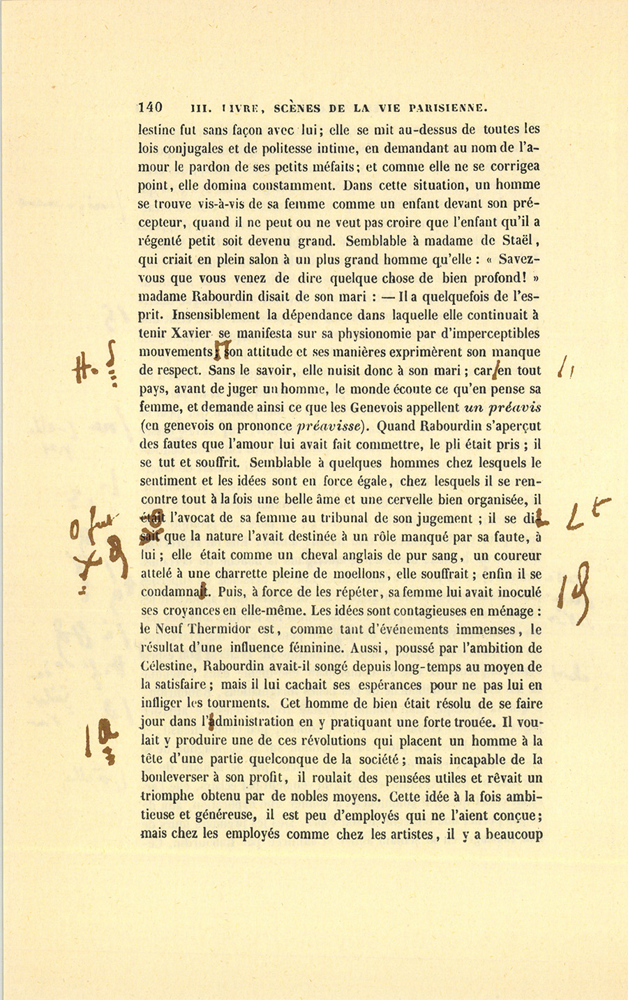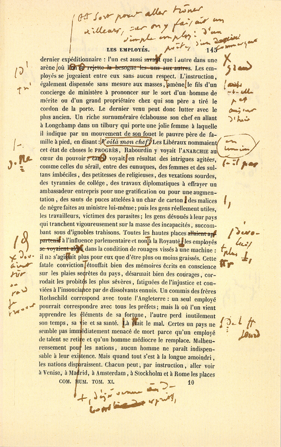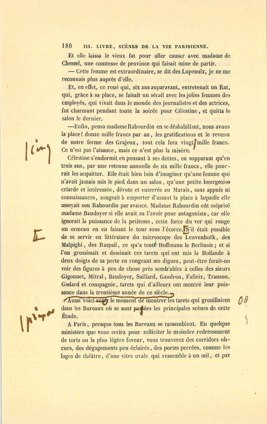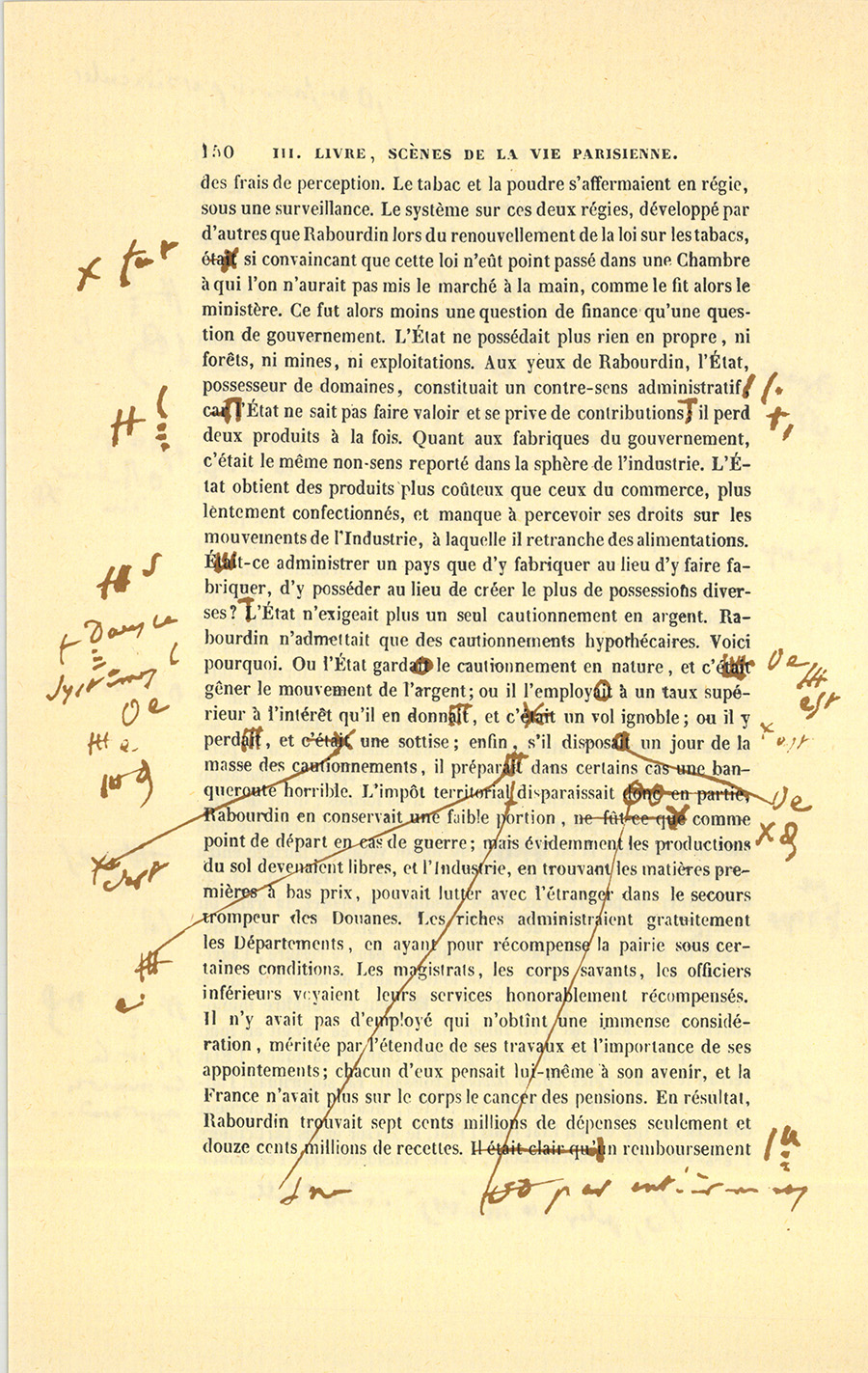 En ce moment Rabourdin grondait ce pauvre petit Sébastien, le seul qui fût dans la confidence entière de ses immenses travaux. Le surnuméraire copiait et recopiait le fameux mémoire {p. 183} composé de cent cinquante feuillets de grand papier Tellière, outre les tableaux à l’appui, les résumés qui tenaient sur une simple feuille, les calculs avec accolades, titres à l’anglaise et sous-titres en ronde. Animé par sa participation mécanique à cette grande idée, l’enfant de vingt ans refaisait un tableau pour un simple grattage, il mettait sa gloire à peindre les écritures, éléments d’une si noble entreprise. Sébastien avait commis l’imprudence d’emporter au bureau la minute du travail le plus dangereux, afin d’en achever la copie. C’était un État général des employés des administrations centrales de tous les ministères à Paris, avec des indications sur leur fortune présente et à venir, et sur leurs entreprises personnelles en dehors de leur emploi.