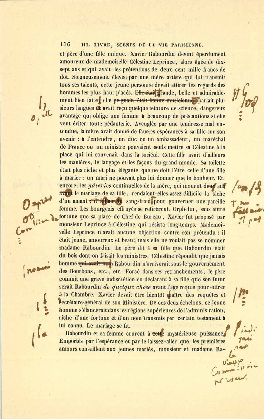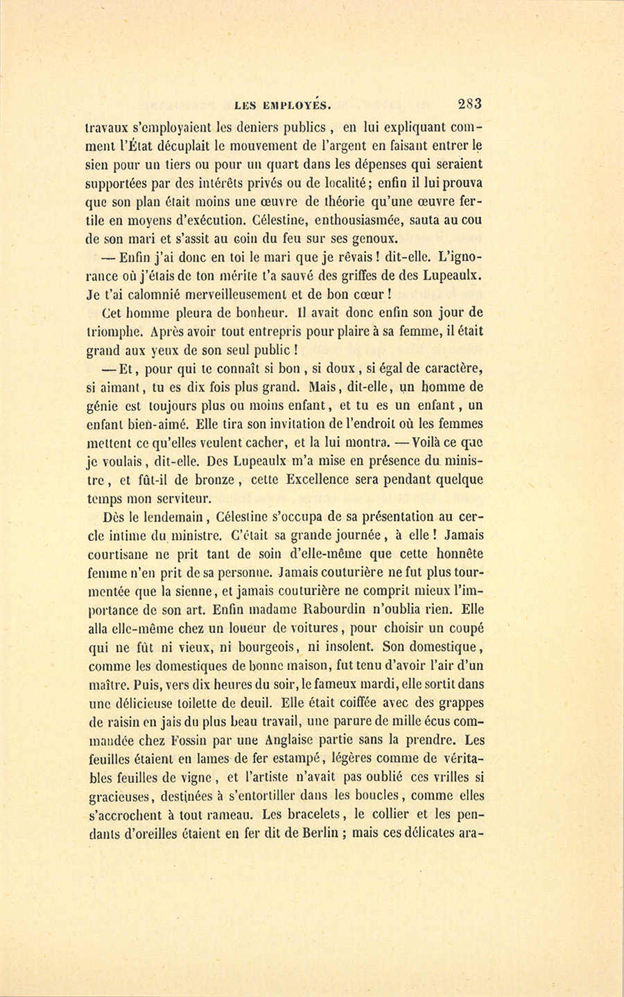 La vie de cet homme offrait des particularités mystérieuses : il n’avait jamais connu son père ; sa mère, femme chez qui le luxe éclatait, toujours parée, toujours en fête, ayant un riche équipage, dont la beauté lui parut merveilleuse par souvenir, et qu’il voyait rarement, lui laissa peu de chose ; mais elle lui avait donné l’éducation vulgaire et incomplète qui produit tant d’ambitions et si peu de capacités. À seize ans, quelques jours avant la mort de sa mère, il était sorti du lycée Napoléon pour entrer comme surnuméraire dans les bureaux où quelque protecteur inconnu l’avait promptement fait appointer. À vingt-deux ans, Rabourdin était Sous-Chef, et Chef à vingt-cinq. Depuis ce jour, la main qui soutenait ce garçon dans la vie n’avait plus fait sentir son pouvoir que dans une seule circonstance ; elle l’avait amené, lui pauvre, dans la maison de monsieur Leprince, ancien commissaire-priseur, homme veuf, passant pour très-riche {p. 136} et père d’une fille unique. Xavier Rabourdin devint éperdument amoureux de mademoiselle Célestine Leprince, alors âgée de dix-sept ans et qui avait les prétentions de deux cent mille francs de dot. Soigneusement élevée par une mère artiste qui lui transmit tous ses talents, cette jeune personne devait attirer les regards des hommes les plus haut placés. Grande, belle et admirablement bien faite, elle parlait plusieurs langues, elle avait reçu quelque teinture de science, dangereux avantage qui oblige une femme à beaucoup de précautions si elle veut éviter toute pédanterie. Aveuglée par une tendresse mal entendue, la mère avait donné de fausses espérances à sa fille sur son avenir : à l’entendre, un duc ou un ambassadeur, un maréchal de France ou un ministre pouvaient seuls mettre sa Célestine à la place qui lui convenait dans la société. Cette fille avait d’ailleurs les manières, le langage et les façons du grand monde. Sa toilette était plus riche et plus élégante que ne doit l’être celle d’une fille à marier : un mari ne pouvait plus lui donner que le bonheur. Et, encore, les gâteries continuelles de la mère, qui mourut un an après le mariage de sa fille, rendaient-elles assez difficile la tâche d’un amant. Combien de sang-froid ne fallait-il pas pour gouverner une pareille femme. Les bourgeois effrayés se retirèrent. Orphelin, sans autre fortune que sa place de Chef de Bureau, Xavier fut proposé par monsieur Leprince à Célestine qui résista long-temps. Mademoiselle Leprince n’avait aucune objection contre son prétendu : il était jeune, amoureux et beau ; mais elle ne voulait pas se nommer madame Rabourdin. Le père dit à sa fille que Rabourdin était du bois dont on faisait les ministres. Célestine répondit que jamais homme nommé Rabourdin n’arriverait sous le gouvernement des Bourbons, etc., etc. Forcé dans ses retranchements, le père commit une grave indiscrétion en déclarant à sa fille que son futur serait Rabourdin de quelque chose avant l’âge requis pour entrer à la Chambre. Xavier devait être bientôt Maître des requêtes et Secrétaire-général de son Ministère. De ces deux échelons, ce jeune homme s’élancerait dans les régions supérieures de l’administration, riche d’une fortune et d’un nom transmis par certain testament à lui connu. Le mariage se fit.