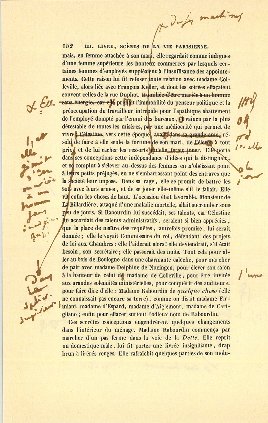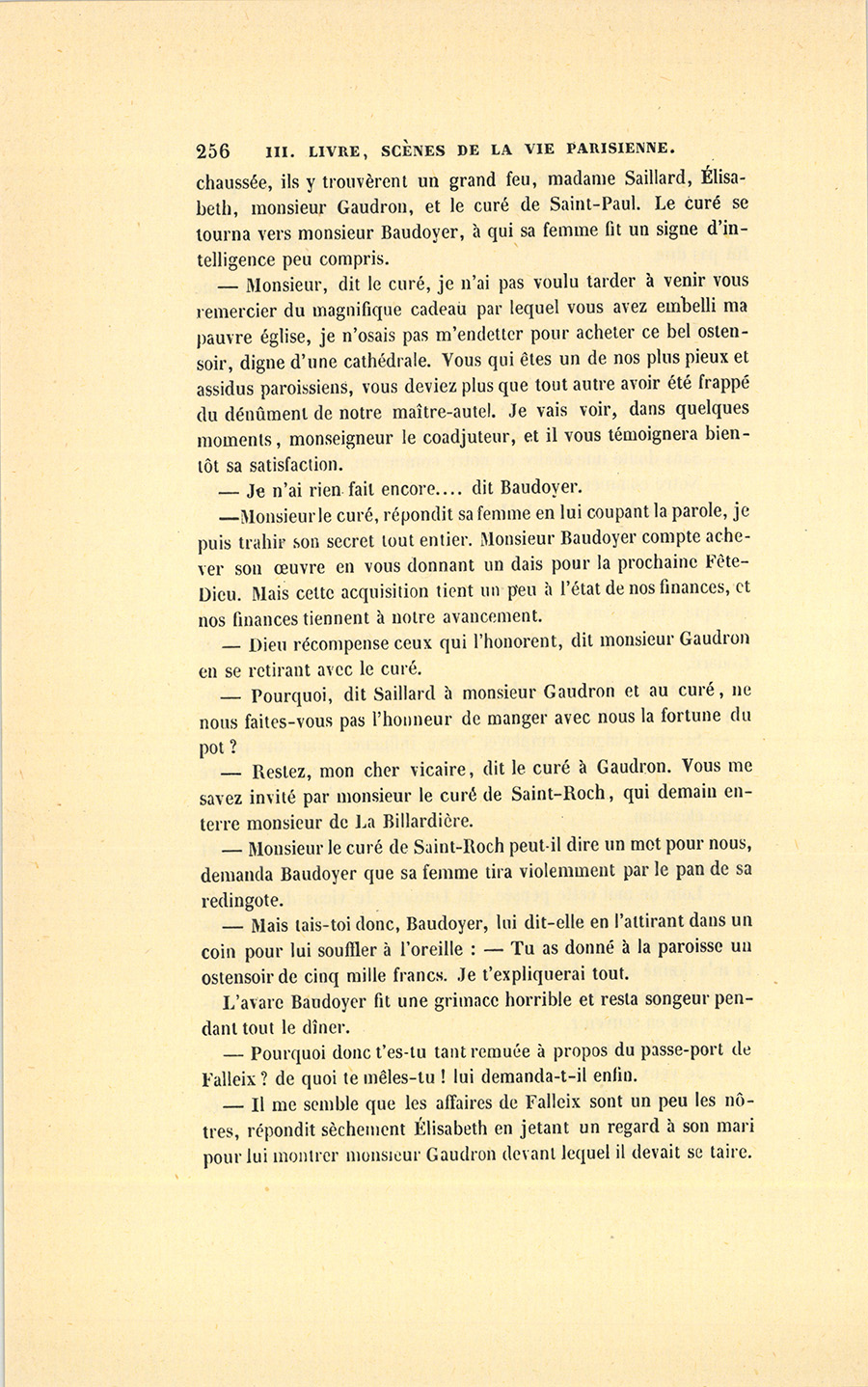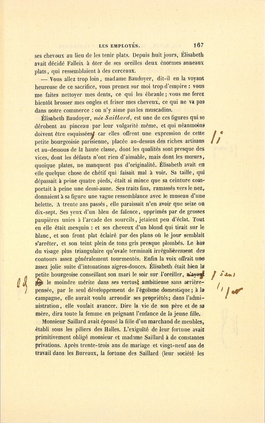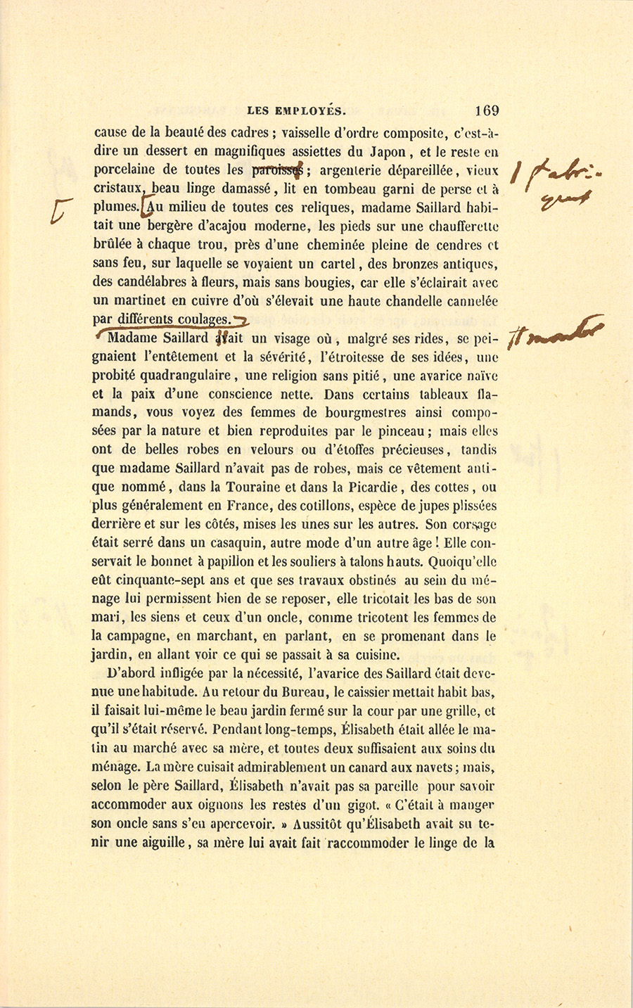 La jeunesse d’Élisabeth fut un travail constant dans une famille dont les mœurs étaient si pénibles et les idées si simples. On y délibérait sur l’acquisition d’un chapeau pour Saillard, on comptait combien d’années avait duré un habit, les parapluies étaient accrochés par en haut au moyen d’une boucle en cuivre. Depuis 1804, il ne s’était pas fait une réparation à la maison. Les Saillard gardaient leur rez-de-chaussée dans l’état où le précédent propriétaire le leur avait livré : les trumeaux étaient dédorés, les peintures des dessus de portes se voyaient à peine sous la couche de poussière mise par2 le Temps. Ils conservaient dans ces grandes et belles pièces à cheminées en marbre sculpté, à plafonds dignes de ceux de Versailles, les meubles trouvés chez la veuve Bidault. C’était des fauteuils en bois de noyer disjoints et couverts en tapisseries, des commodes en bois de rose, des guéridons à galerie en cuivre et à marbres blancs fendus, un superbe secrétaire de Boulle auquel la mode n’avait pas encore rendu sa valeur, enfin le tohu-bohu des bonnes occasions saisies par la marchande des piliers des Halles : tableaux achetés à {p. 169} cause de la beauté des cadres ; vaisselle d’ordre composite, c’est-à-dire un dessert en magnifiques assiettes du Japon, et le reste en porcelaine de toutes les fabriques ; argenterie dépareillée, vieux cristaux, beau linge damassé, lit en tombeau garni de perse et à plumes.