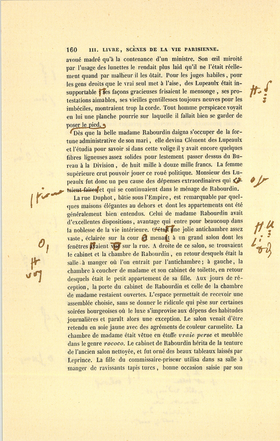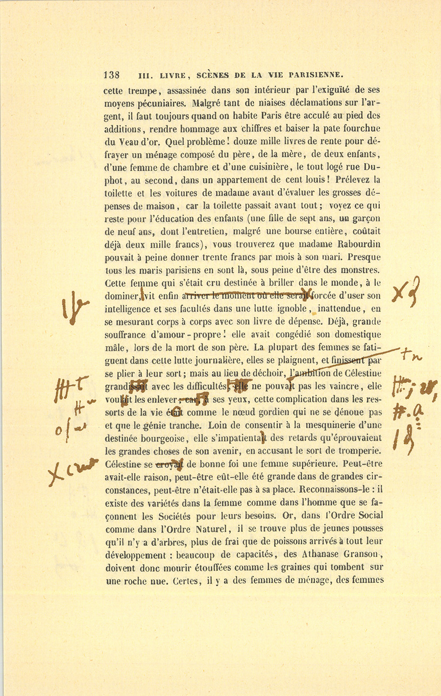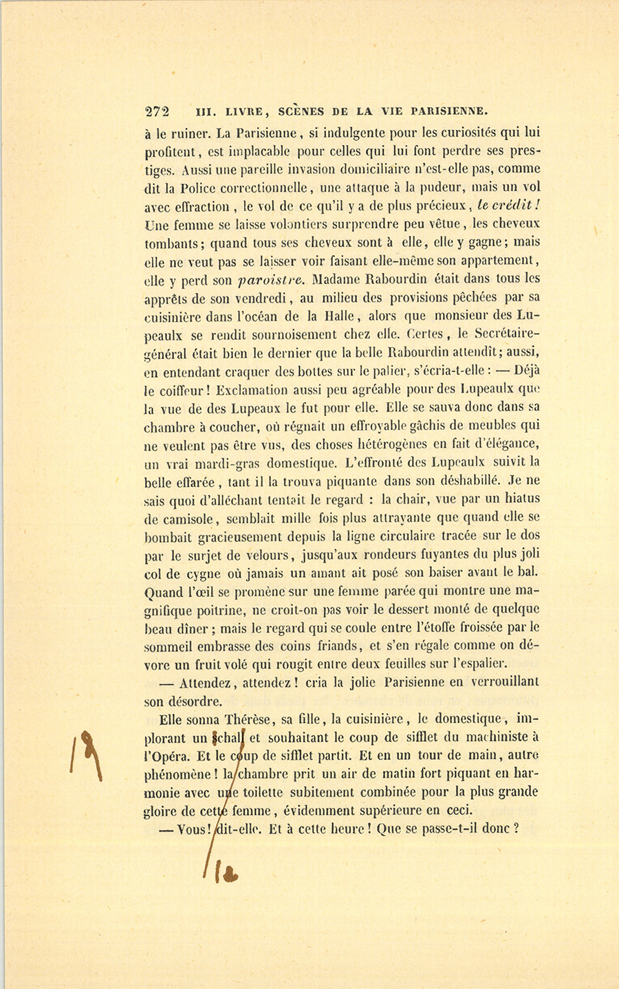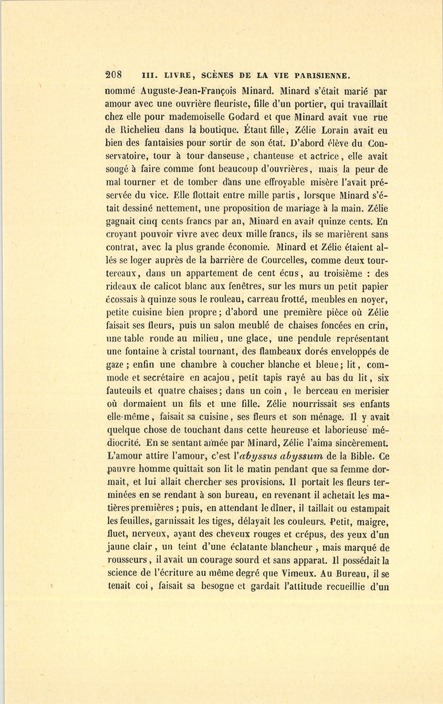 La jeunesse d’Élisabeth fut un travail constant dans une famille dont les mœurs étaient si pénibles et les idées si simples. On y délibérait sur l’acquisition d’un chapeau pour Saillard, on comptait combien d’années avait duré un habit, les parapluies étaient accrochés par en haut au moyen d’une boucle en cuivre. Depuis 1804, il ne s’était pas fait une réparation à la maison. Les Saillard gardaient leur rez-de-chaussée dans l’état où le précédent propriétaire le leur avait livré : les trumeaux étaient dédorés, les peintures des dessus de portes se voyaient à peine sous la couche de poussière mise par2 le Temps. Ils conservaient dans ces grandes et belles pièces à cheminées en marbre sculpté, à plafonds dignes de ceux de Versailles, les meubles trouvés chez la veuve Bidault. C’était des fauteuils en bois de noyer disjoints et couverts en tapisseries, des commodes en bois de rose, des guéridons à galerie en cuivre et à marbres blancs fendus, un superbe secrétaire de Boulle auquel la mode n’avait pas encore rendu sa valeur, enfin le tohu-bohu des bonnes occasions saisies par la marchande des piliers des Halles : tableaux achetés à {p. 169} cause de la beauté des cadres ; vaisselle d’ordre composite, c’est-à-dire un dessert en magnifiques assiettes du Japon, et le reste en porcelaine de toutes les fabriques ; argenterie dépareillée, vieux cristaux, beau linge damassé, lit en tombeau garni de perse et à plumes.